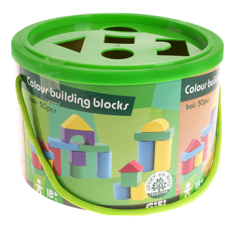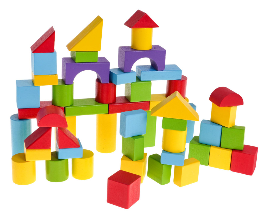 - 50 drewnianych klocków w różnych kolorach i kształtach,
