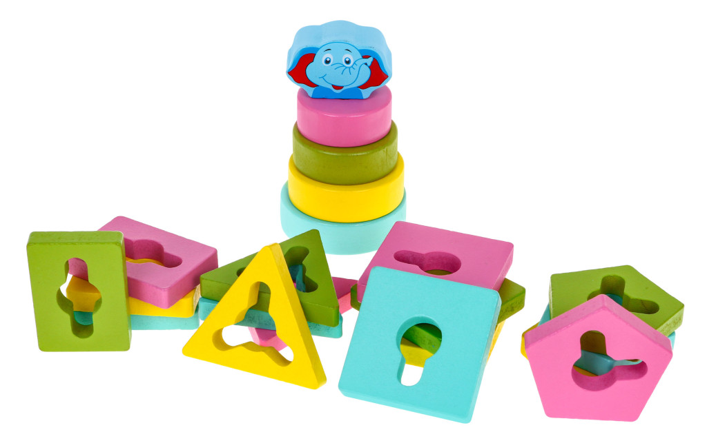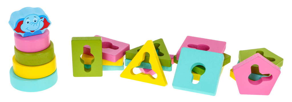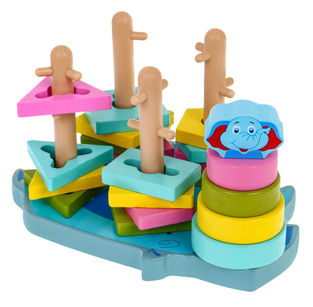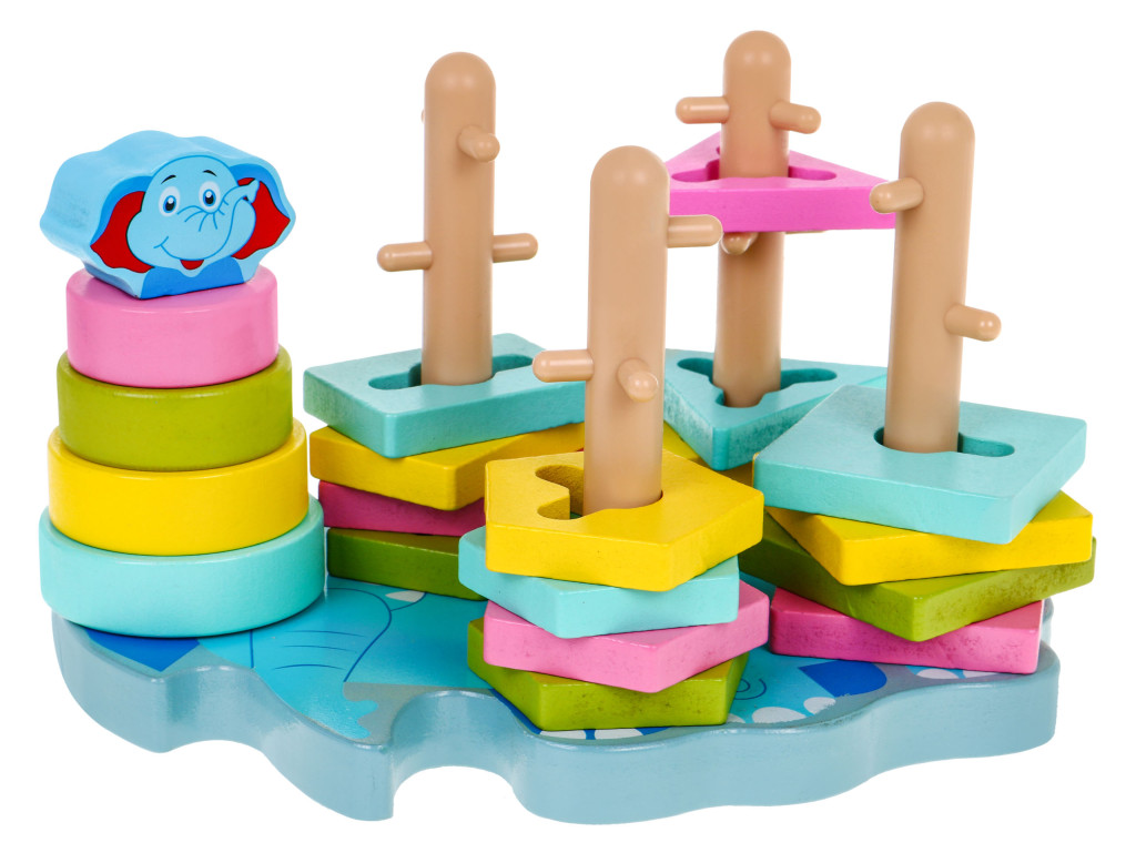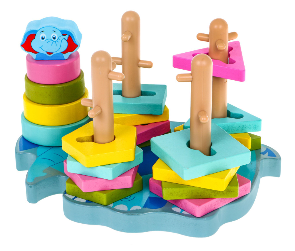 Bezpieczna, kolorowa, drewniana zabawka dla dzieci powyżej 36 miesiąca życia. Polega na montażu i demontażu klocków na bolce znajdujące się na podstawie w kształcie słonia. Bolce posiadają wystające elementy co utrudnia zadanie, gdyż dziecko musi dodatkowo dopasować kształt klocka do bolca a następnie przesunąć klocek z góry w dół. Zabawka rozwija wyobraźnię, motorykę, zdolności manualne, ćwiczy małe rączki, uczy rozróżniania kolorów i kształtów. Wykonana została z wysokiej jakości drewna, malowana bezpieczną farbą na bazie wody, jest trwała i odporna na uszkodzenia, posłuży latami.