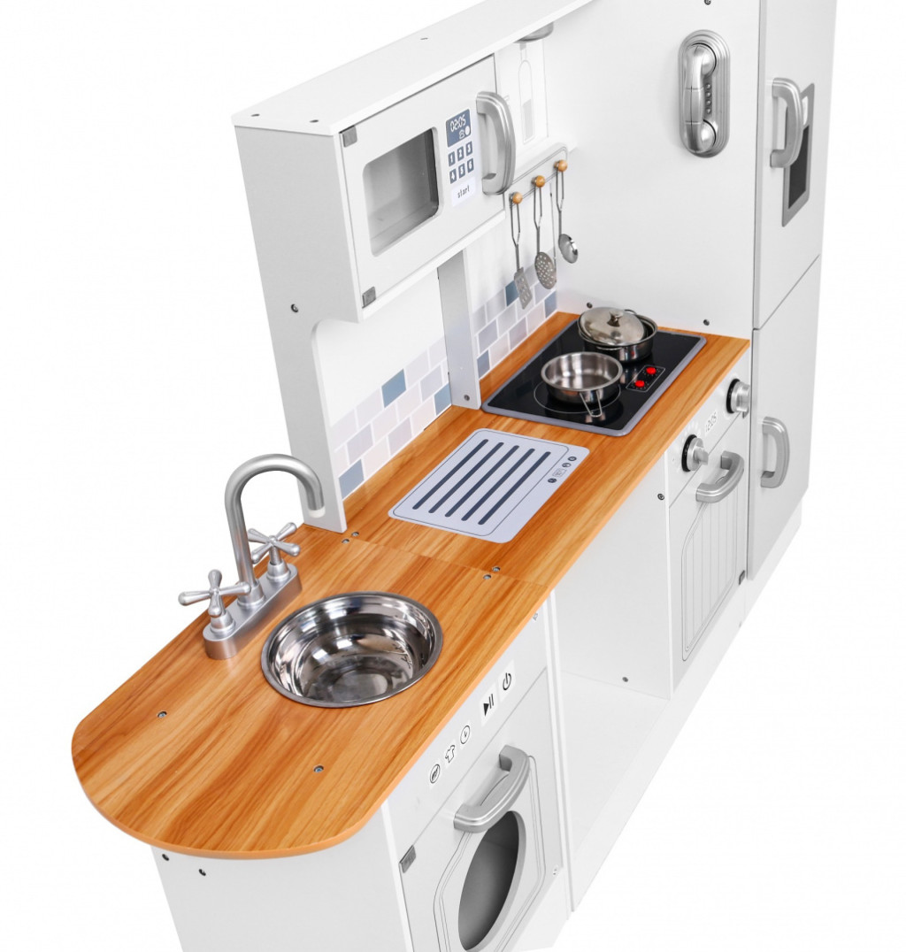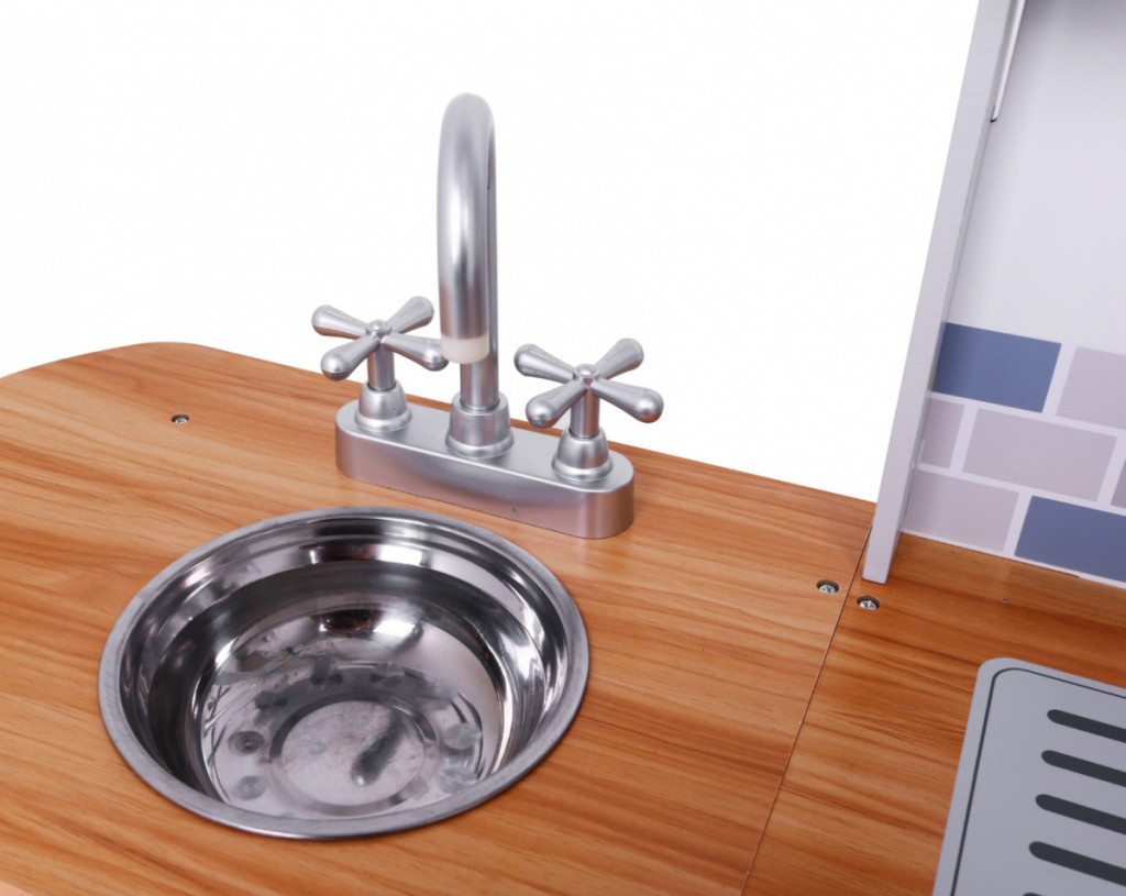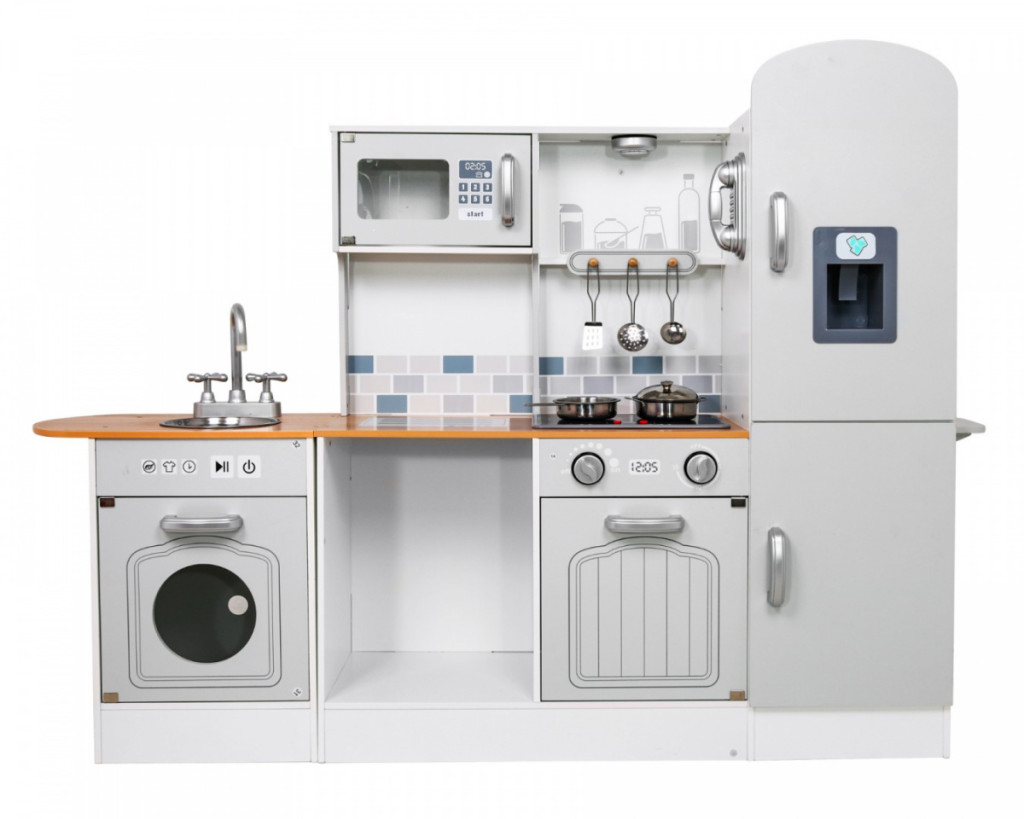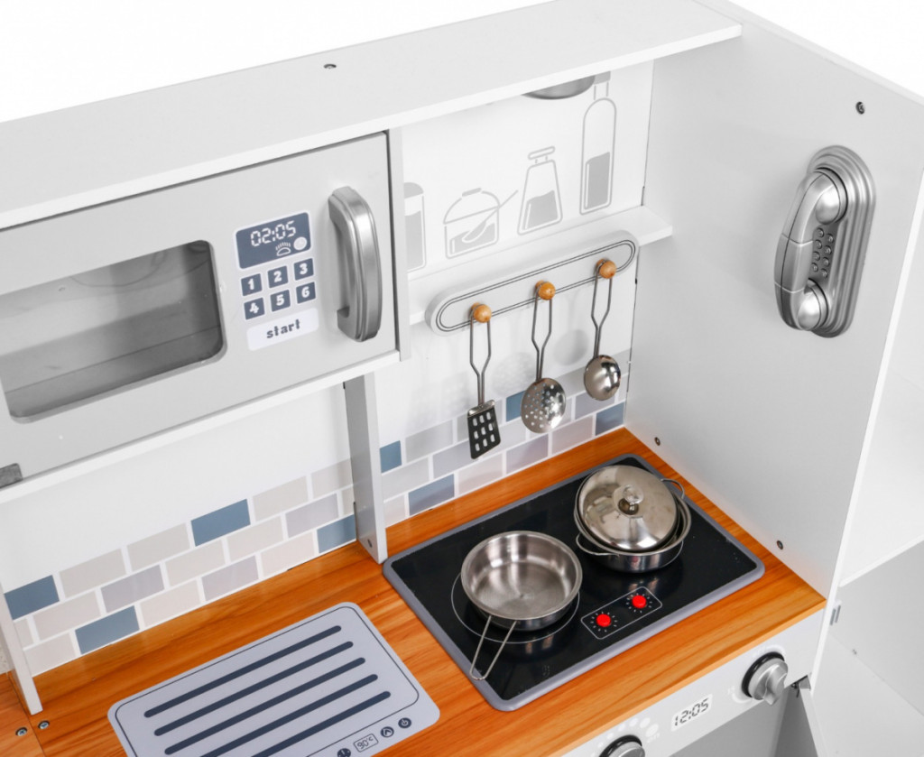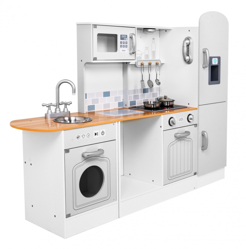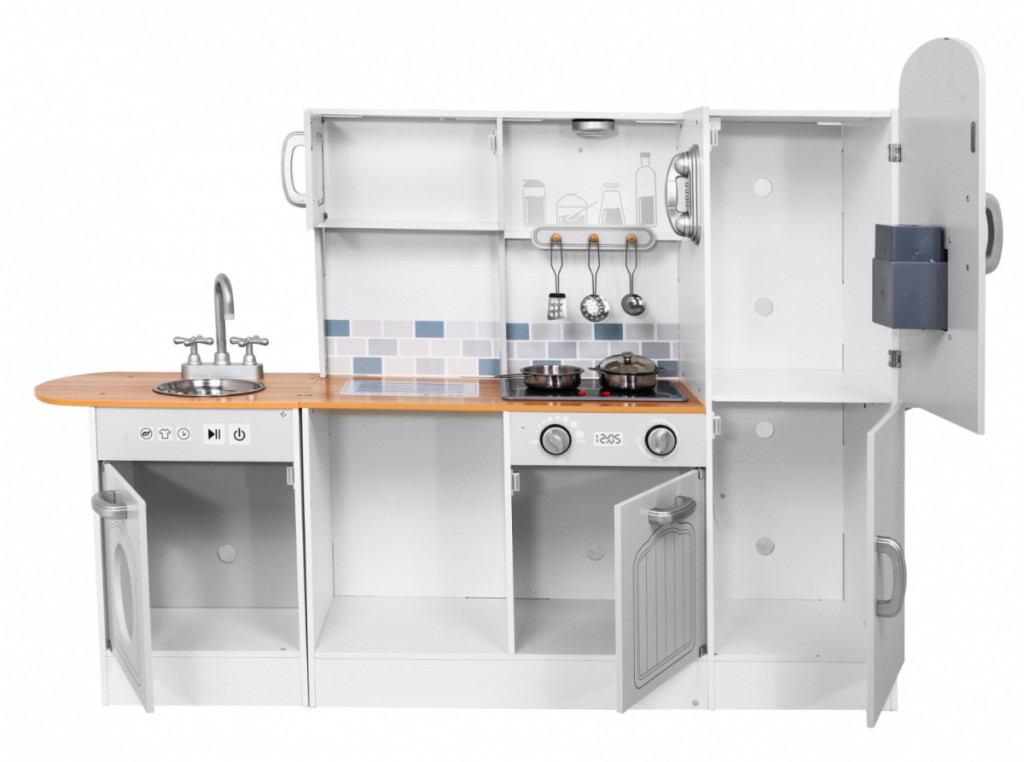 Duża drewniana kuchnia to propozycja dla dzieci już od 3-go roku życia. Wykonana została z wysokiej jakości drewna, solidnego i trwałego materiału, jest stabilna i odporna na uszkodzenia zewnętrzne, posłuży Twojej pociesze przez długie lata. Wyglądem przypomina prawdziwą kuchnie, kolor jest neutralny, będzie odpowiedni zarówno dla chłopców jak i dziewczynek.