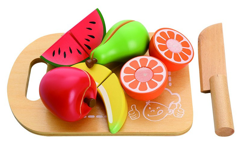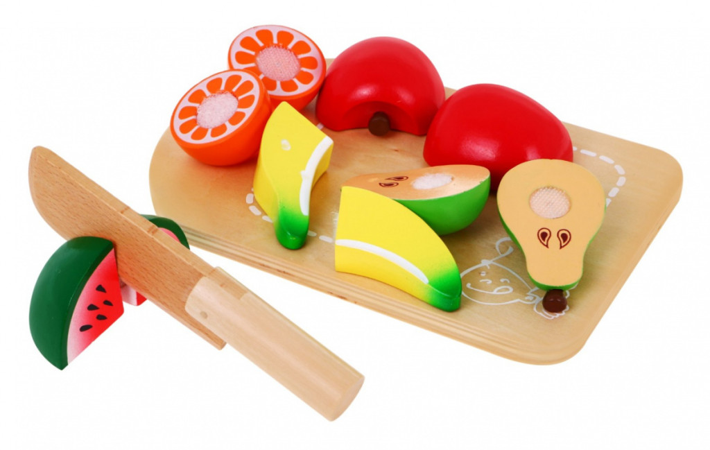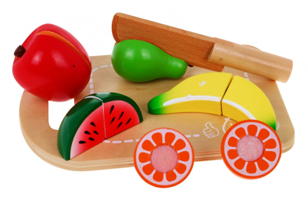 Zestaw deska do krojenia, warzywa, owoce, nóż wykonany został z wysokiej jakości drewna, pomalowanego bezpiecznymi, nietoksycznymi farbami. W dobie wszechobecnego plastiku, coraz więcej rodziców docenia zabawki drewniane, które są ekologiczne, trwałe i bezpieczne. Drewniany zestaw będzie służył dziecku przez długie lata. Zestaw składa się z deski do krojenia, nożyka oraz owoców i warzyw. Owoce i warzywa są na rzepy, Twoja pociecha będzie mogła „przekroić” je na połowę.