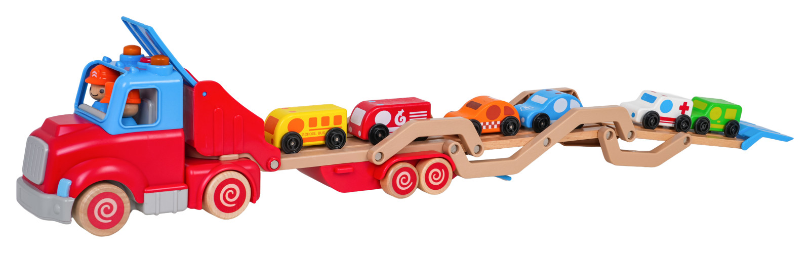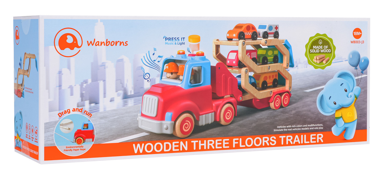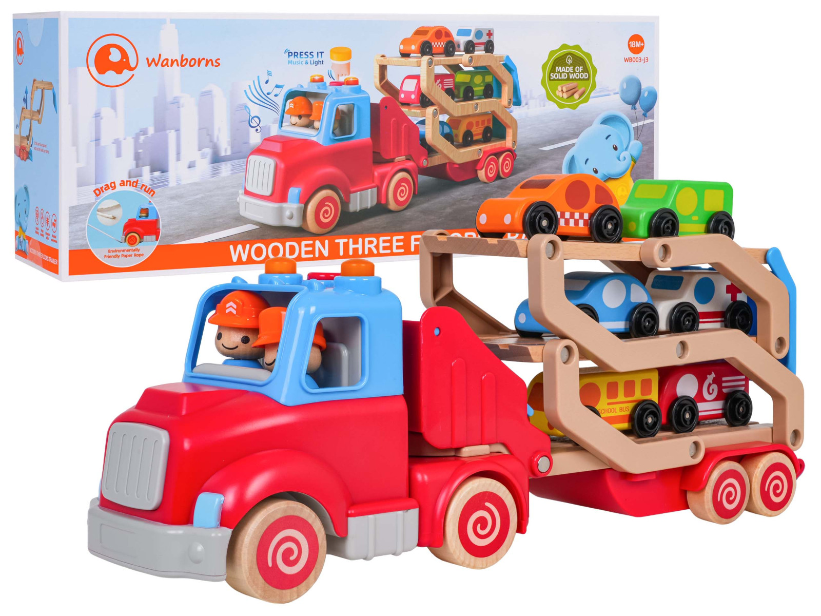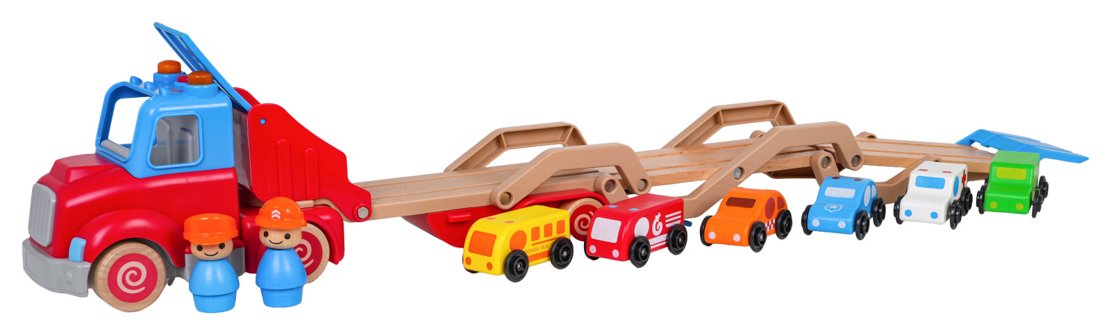 Drewniana, interaktywna laweta z pojazdami w zestawie dla dzieci od osiemnastego miesiąca życia. Zabawka wykonana została z najlepszej jakości materiałów: plastiku i drewna. Żywe kolory przyciągają uwagę dziecka i zachęcają do zabawy. Lawetę można odpiąć od pojazdu lub rozłożyć i stworzyć tor dla autek. W zestawie znajduje się 6 drewnianych pojazdów: policja, taksówka, wóz strażacki, karetka, autobus, samochód dostawczy. Na dachu pojazdu jest przycisk odpowiedzialny za generowanie odgłosów odpalania ciężarówki, trąbienia czy odtwarzania melodii. Efektom dźwiękowym towarzyszy mruganie światełek. Z przodu ciężarówki znajduje się zaczep na ewentualny sznureczek do ciągnięcia zabawki. Zabawka zasilana jest bateriami typu 3 x AG13 (baterie w zestawie).
