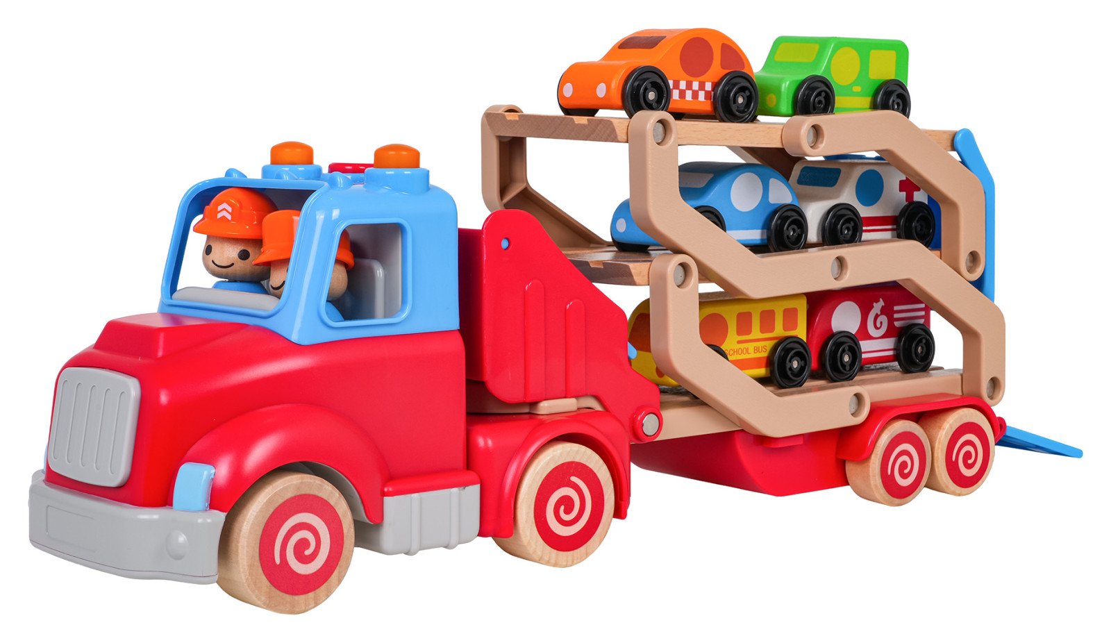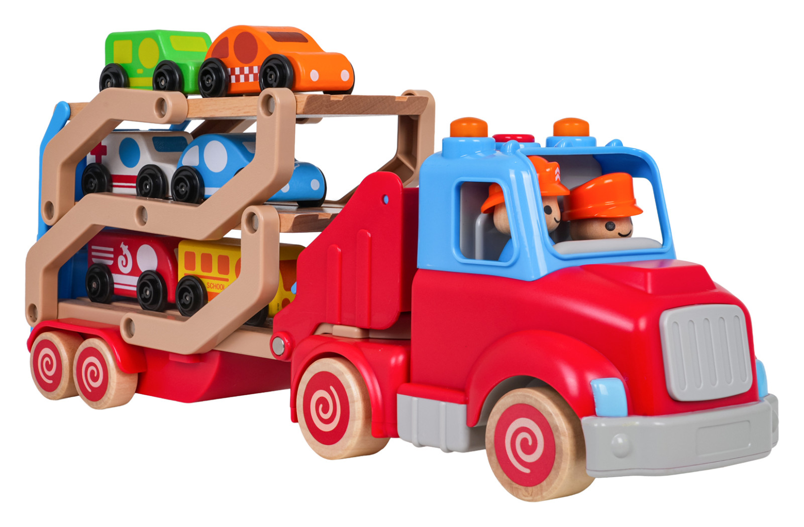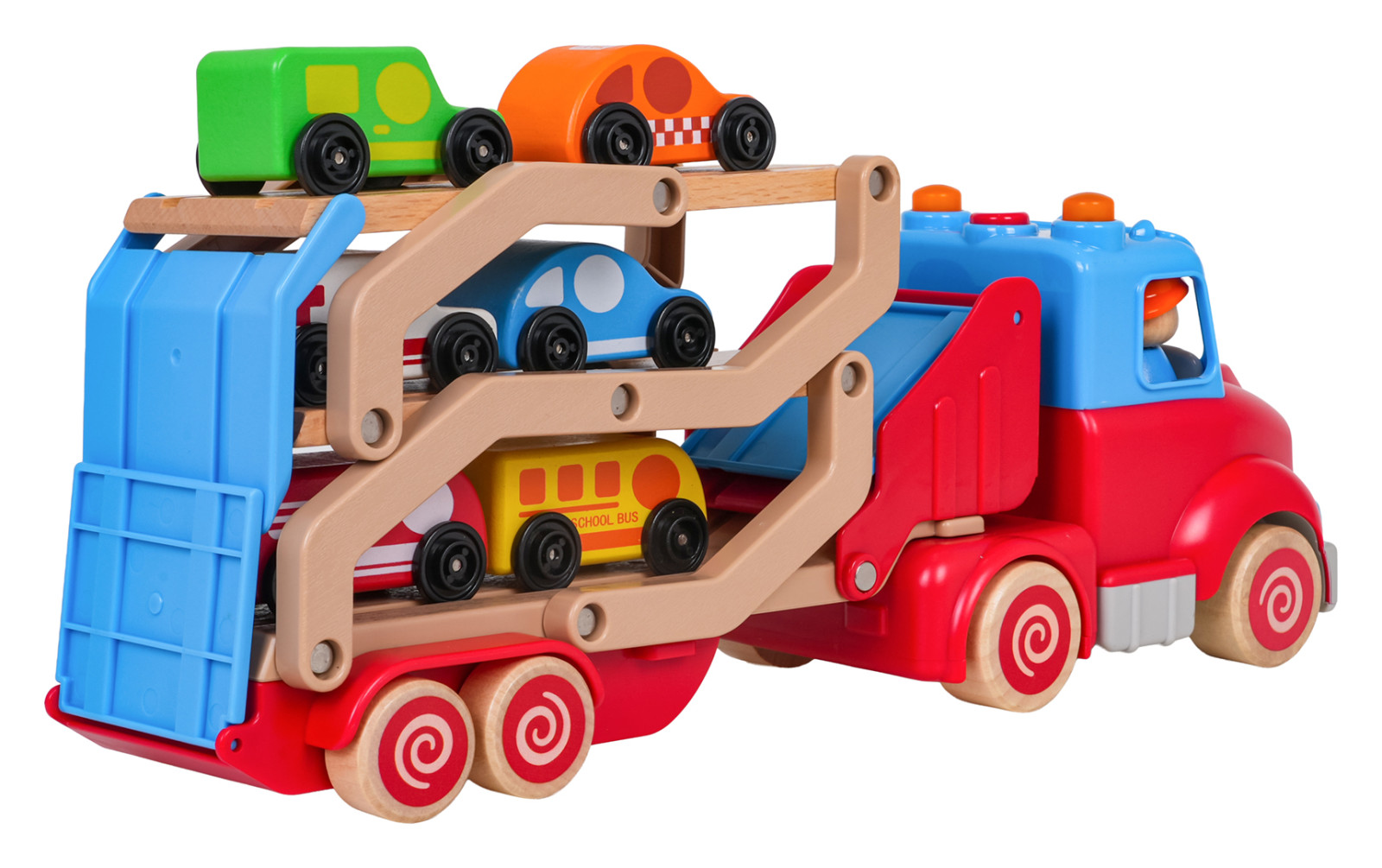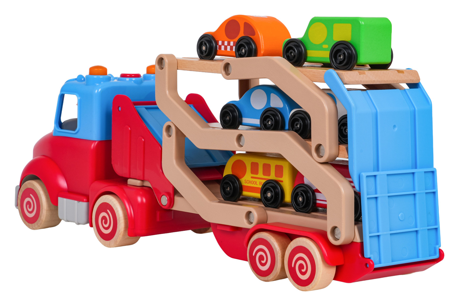 Drewniana, interaktywna laweta z pojazdami w zestawie dla dzieci od osiemnastego miesiąca życia. Zabawka wykonana została z najlepszej jakości materiałów: plastiku i drewna. Żywe kolory przyciągają uwagę dziecka i zachęcają do zabawy. Lawetę można odpiąć od pojazdu lub rozłożyć i stworzyć tor dla autek. W zestawie znajduje się 6 drewnianych pojazdów: policja, taksówka, wóz strażacki, karetka, autobus, samochód dostawczy. Na dachu pojazdu jest przycisk odpowiedzialny za generowanie odgłosów odpalania ciężarówki, trąbienia czy odtwarzania melodii. Efektom dźwiękowym towarzyszy mruganie światełek. Z przodu ciężarówki znajduje się zaczep na ewentualny sznureczek do ciągnięcia zabawki. Zabawka zasilana jest bateriami typu 3 x AG13 (baterie w zestawie).