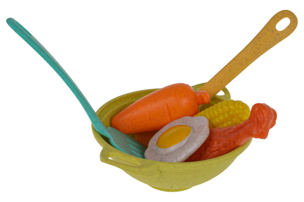| - patelnia, - 2 x garnek z pokrywką, - cedzak, - łopatka, - łyżka - atrapy produktów spożywczych takie jak jajko sadzone, nóżka z kurczaka, marchewka, kukurydza. |