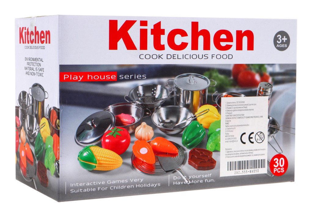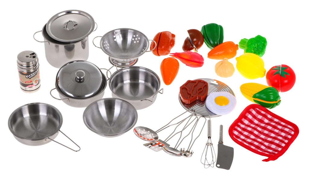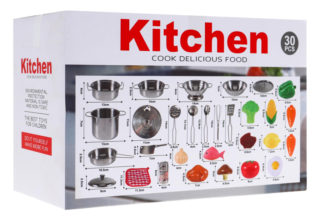 30-elementowy zestaw kuchenny przeznaczony dla dzieci powyżej 3-go roku życia.Akcesoria do gotowania wykonane z metalu i imitacje żywności z plastiku