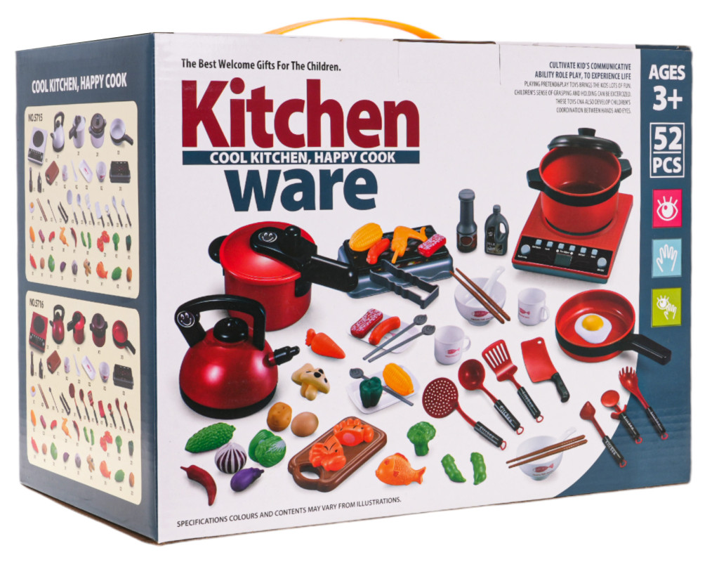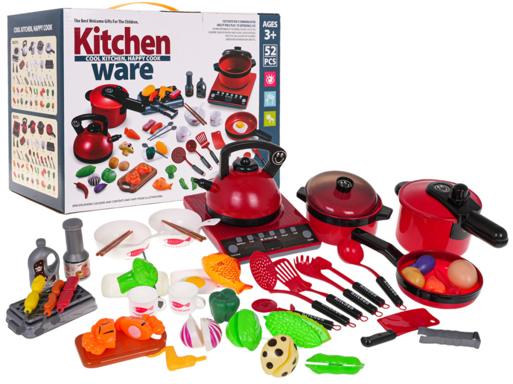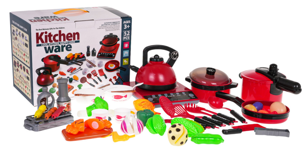 - szybkowar ok. 22 cm x 13 cm x 12 cm, - kuchenka na baterie ok. 20 cm x 16,5 cm x 4 cm, - garnek z pokrywką ok. 9 cm x 16 cm x 12,5 cm, - patelnia ok. 21,5 cm x 12,5 cm x 3,5 cm, - czajnik ok. 13 cm x 16 cm x 12 cm, - łyżka cedzakowa ok. 18,5 cm x 6 cm, - chochla ok. 16,5 cm x 4,5 cm, - tasak ok. 14,5 cm x 5 cm, - łopatka ok. 17,5 cm x 5 cm, - nóż do pizzy ok. 13,5 cm x 4 cm, - łyżkę do makaronu ok. 17 cm x 3,5 cm, - grill ok. 12,5 cm x 6,5 cm x 2,5 cm, - szczypce ok. 8 cm x 2,5 cm x 1,5 cm, - deska do krojenia ok. 12 cm x 7 cm x 1 cm, - kubek ok. 3,5 cm x 5,5 cm x 4 cm, - miseczka ok. 8 cm x 4,5 cm, - łyżka ok. 12,5 cm x 4 cm, - tacka ok. 10 cm x 7 cm x 1 cm, - pałeczki ok. 14 cm długości, - patyczek do szaszłyków ok. 9,5 cm długości, - ketchup ok. 9,5 cm x 4 cm, - mleko ok. 8 cm x 4,5 cm, - jajko ok. 5,5 cm x 4,5 cm, - kukurydza ok. 8 cm x 2 cm, - kawałek mięsa ok. 8 cm x 2 cm, - kiełbaska ok. 8 cm x 1,5 cm, - kawałek kurczaka ok. 8 cm x 3,5 cm, - ostra papryka ok. 9,5 cm x 1,5 cm, - jajko sadzone ok. 6 cm x 5,5 cm, - bakłażan ok. 6,5 cm x 3 cm, - papryka zielona ok. 4,5 cm x 4,5 cm, - ziemniak ok. 5,5 cm x 4 cm, - marchewka ok. 7,5 cm x 3 cm, - groszek ok. 8 cm x 2,5 cm, - krab ok. 9 cm x 6,5 cm, - brokuł ok. 5,5 cm x 6 cm, - sałata ok. 6,5 cm x 4 cm, - cebula ok. 4,5 cm x 5 cm, - grzyb ok. 6 cm x 5,5 cm, - ryba ok. 9 cm x 5,5 cm, - opakowanie ok. 31 cm x 23,5 cm x 18 cm. |