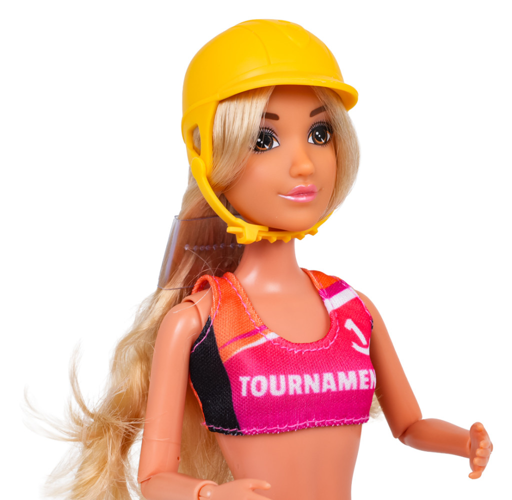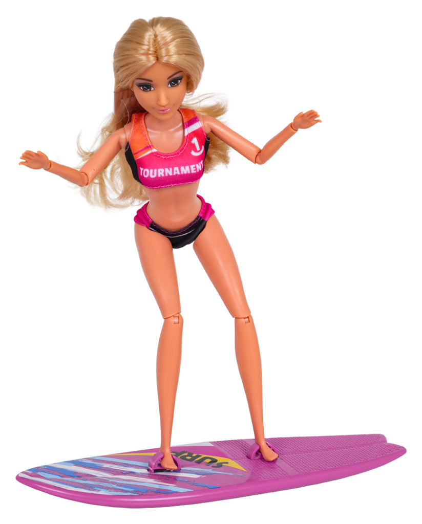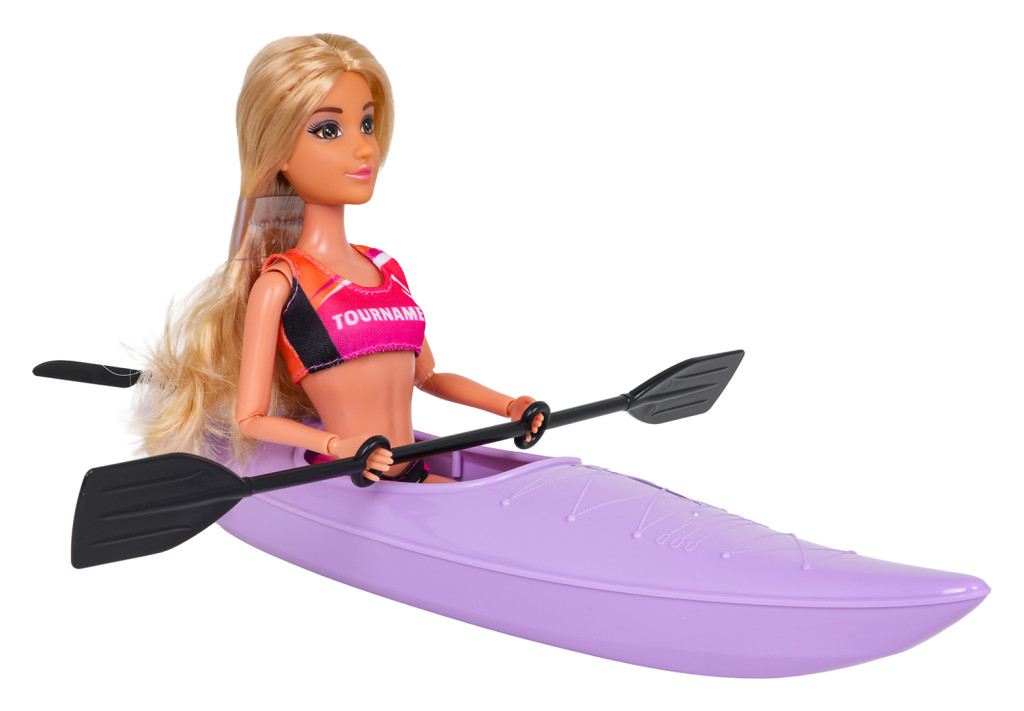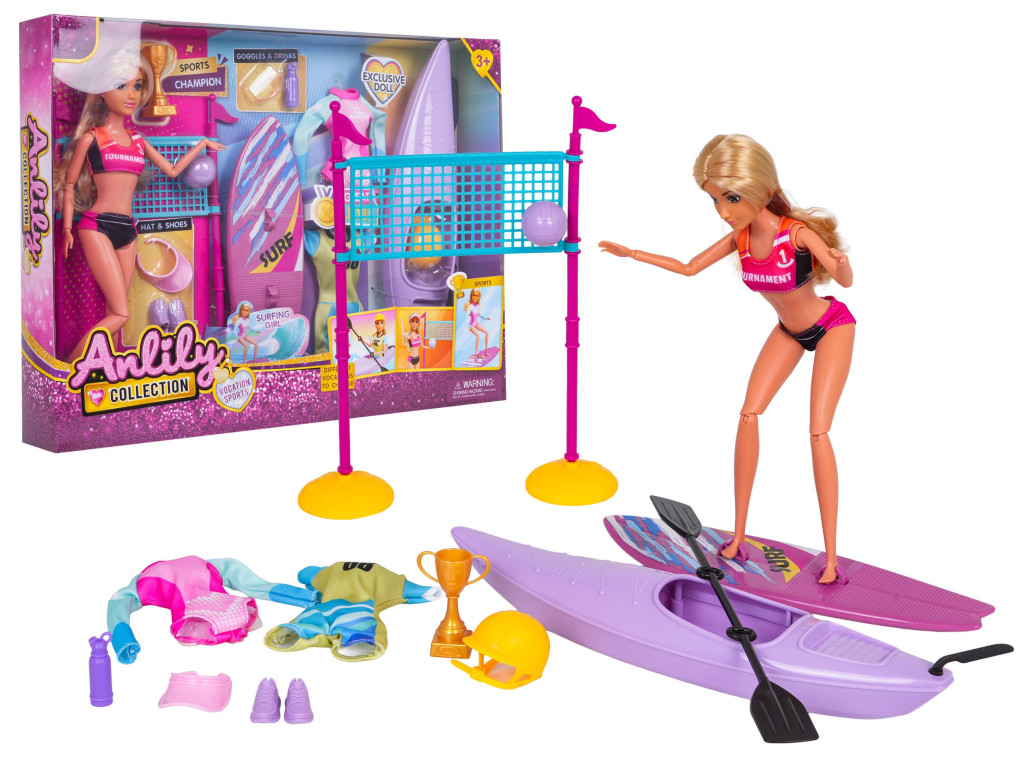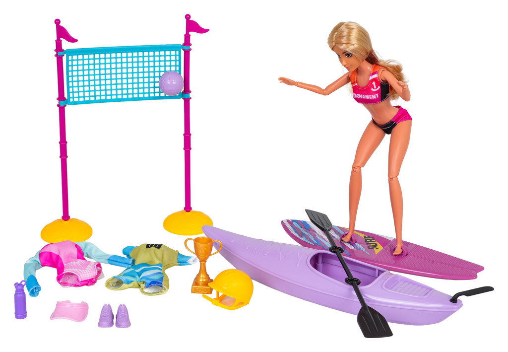 | - lalka ubrana w strój do siatkówki, - siatka do siatkówki, - piłka, - czapka z daszkiem, - buty sportowe - medal zwycięstwa, - okulary, - butelka na wodę, - deska do surfowania, - kajak, - kask, - wiosła, - ubranie do surfowania, - ubranie na kajak. |