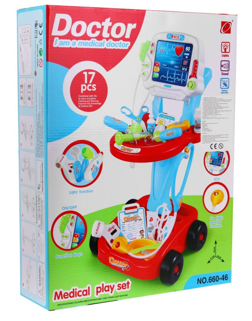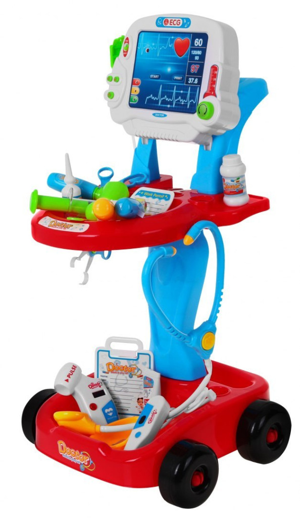| Wyposażenie zestawu: - wózek na akcesoria z półeczkami i aparatem EKG, - stetoskop, który wydaje dźwięk bijącego serca oraz świeci się na nim serduszko po dotknięciu do ciała, - zestaw kolorowych naklejek, - lusterko dentystyczne z migającymi światłami (ok. 14 cm x 3,5 cm), - otoskop laryngologiczny z lampką do zaglądania do uszu i nosa dla pacjenta (ok. 13 cm x 6,5 cm) , - termometr z podświetlanym wynikiem i możliwością regulacji temperatury (ok. 11,5 cm x 3 cm), - strzykawka (ok. 14 cm x 6,5 cm), - pulsometr z podświetlanym wynikiem (ok. 12 cm x 5 cm), - młotek neurologiczny (ok. 13 cm x 6,5 cm), - okulary, - skalpel (ok. 12 cm x 2,5 cm), - 2 x nożyczki (ok. 12 cm x 7 cm), - wzór recepty (ok. 12,5 cm x 9 cm), - plakietka identyfikacyjna (ok. 7,5 cm x 5 cm), - nerka na lekarstwa (ok. 12 cm x 7,5 cm x 2 cm), - imitacja pojemniczka z lekarstwami (ok. 6,5 cm x 3,5 cm), - imitacja kropli do oczów (ok. 9 cm x 2,5 cm), - imitacja pasty (ok. 9 cm x 4 cm), - kroplówka. |