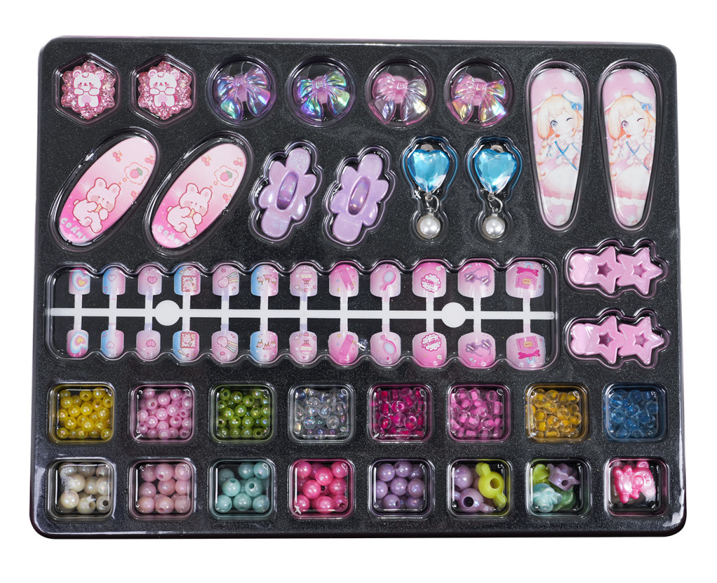 | - żyłka, - kolczyki z misiem, - kolczyki z serduszkiem, - 2 x pierścionek, - 8 x spinka do włosów, - koraliki, różne wielkości i kształty (8 rodzajów drobnych koralików, 8 rodzajów większych koralików), - blister ze sztucznymi paznokciami, - torebka |