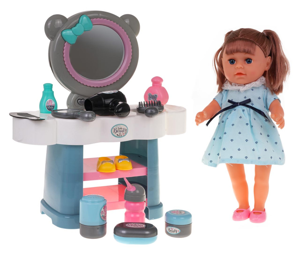 | Zestaw, interaktywna toaletka z lalką robiącą siusiu dla dzieci od 3-go roku życia. Toaletka wykonana została z najlepszej jakości plastiku, w żywych kolorach. Posiada podświetlane lustro, efekty dźwiękowe, blat na akcesoria i dwie półeczki. Laleczka dołączona do zestawu ma przyjemną w dotyku buzię, śliczne włosy, idealne do czesania, ruchome rączki i nóżki. Ubrana jest w sukienkę i butki. Lalka po napojeniu ją wodą, robi siusiu, na jej brzuszku znajduje się panel uruchamiający efekty dźwiękowe w postaci odgłosów płaczu, śmiechu, spania, marudzenia i innych wydawanych przez dziecko. W zestawie znaleźć możemy również pojemniczek do pojenia lali, mydelniczkę, pudełko na maść, pudełko na zasypkę, flakoniki z perfumami, pantofelki na zmianę, suszarkę, lusterko, grzebyk i szczotkę do włosów. Toaletka zasilana jest bateriami typu 4 x AA 1,5 V (brak w zestawie), lalka bateriami typu 3 x LR44 (w zestawie).