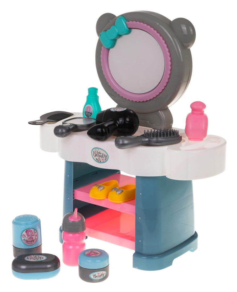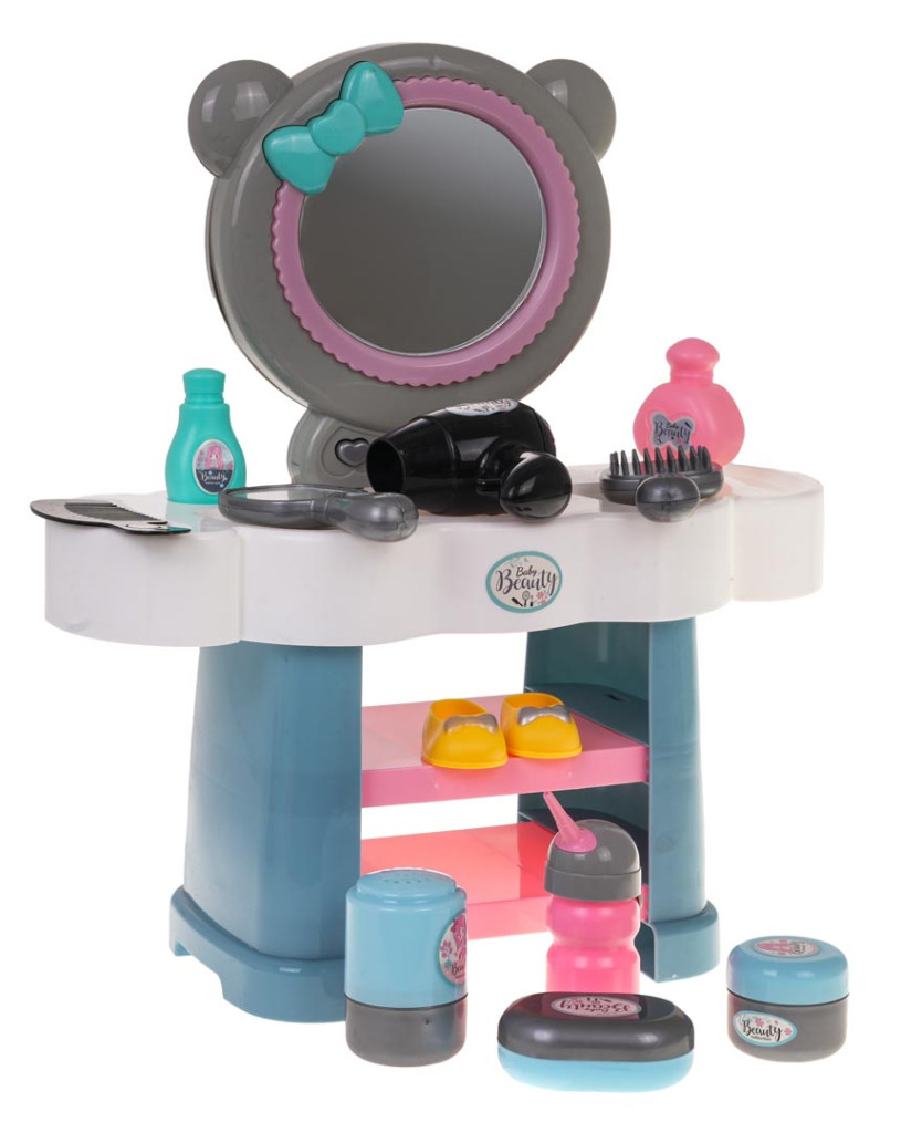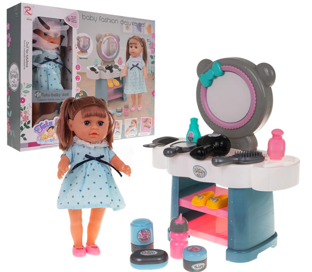 - przeznaczony dla dzieci od 3-go roku życia, - wykonany z najlepszej jakości plastiku, - podświetlane lustro w toaletce, - efekty dźwiękowe na toaletce: melodia, - liczne akcesoria do pielęgnacji ciała, - liczne akcesoria do włosów, - lalka robi siusiu, - lalka wydaje różne odgłosy: płacze, śmieje się, śpi, marudzi itd. |