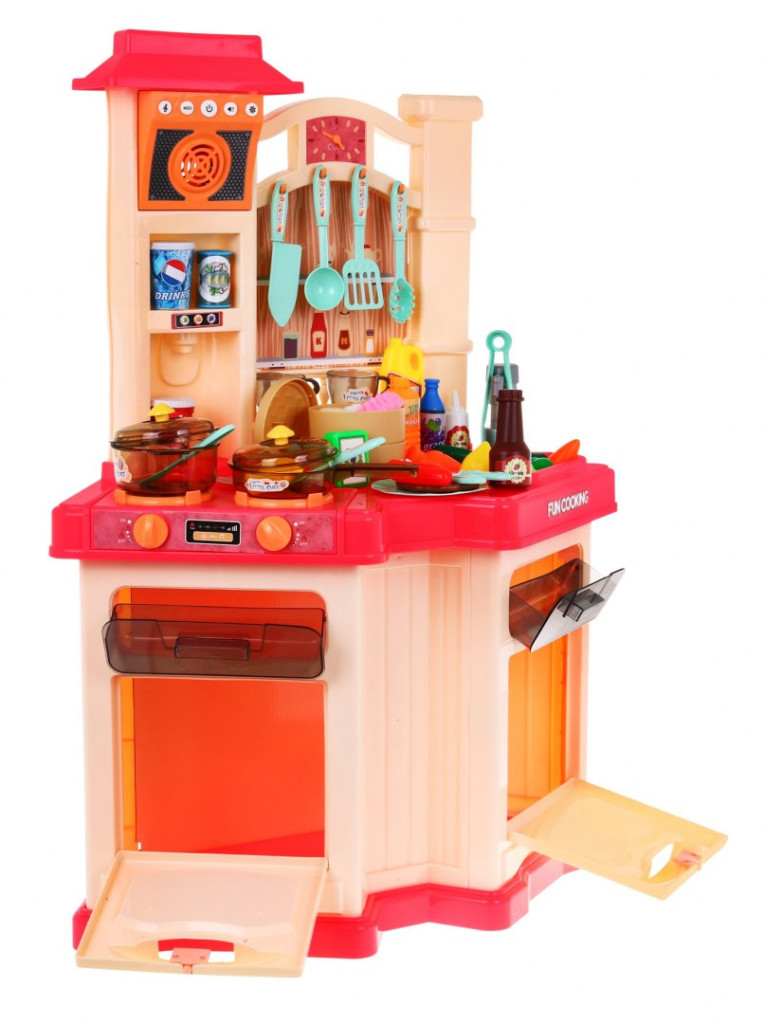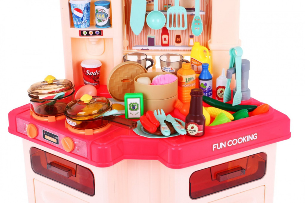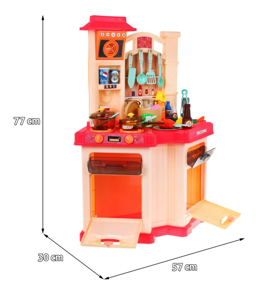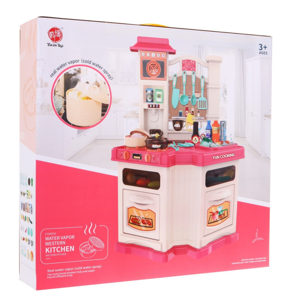 Kuchnia to ulubiona zabawka każdej dziewczynki i wielu chłopców, ta wykonana w kolorach różu, przypadnie do gustu szczególnie małym gosposiom. Kuchnia przeznaczona jest dla dzieci powyżej trzeciego roku życia. Posiada efekty dźwiękowe i świetlne a także kran z którego leje woda oraz jeden palnik wytwarzający parę. Kuchnia zaopatrzona jest również w zegar z ruchomymi wskazówkami, wentylator z odgłosami oraz grające radyjko. Zestaw zasilany jest na baterie typu 6 x AA, których brak w opakowaniu.