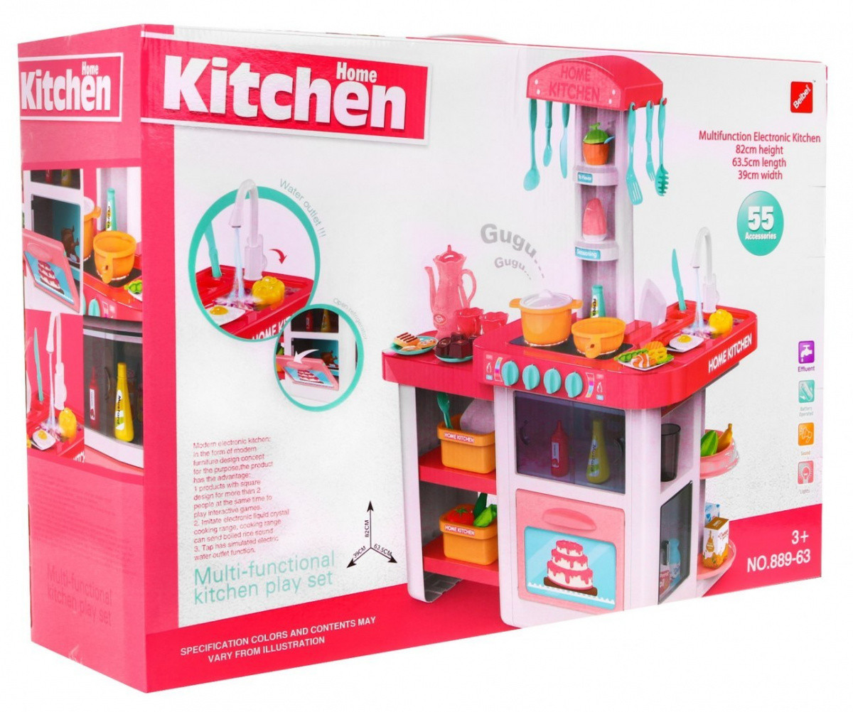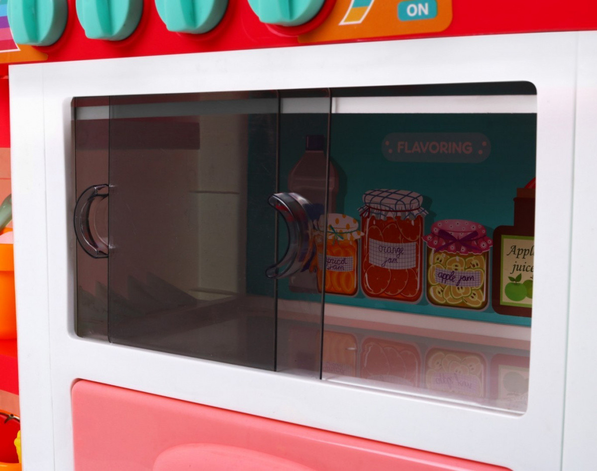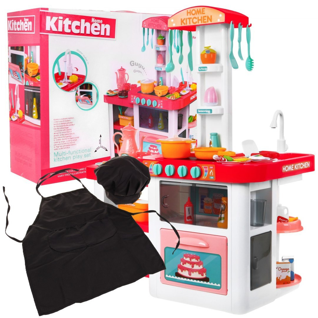 | Przedstawiamy Państwu niesamowitą, dużą kuchnię interaktywną z efektami świetnymi i dźwiękowymi. Dbałość o szczegóły, pastelowa kolorystyka, estetyczne wykonanie. Łatwy montaż i demontaż. Kuchnia posiada otwierany piekarnik, 4 palniki z dźwiękami i światłami oraz zlew z kranem z którego leci prawdziwa woda. Pokrętła są ruchome, po przekręceniu świeci i miga się czerwone światełko oraz słychać odgłos smażenia lub gotowania. Zabawka przeznaczona dla dzieci powyżej 3-go roku życia i posiada certyfikat CE. Instrukcja złożenia na opakowaniu. Zabawka zasilana bateriami typu 3 x AA (brak w zestawie). W zestawie znajduje się czapka i fartuszek kucharza, żeby twoje dziecko poczuło się jak prawdziwy szef kuchni. Fartuszek posiada 2 kieszonki np. na akcesoria kuchenne. Całość zapakowana w kolorowe pudełko, idealnie nadaje się na prezent.
