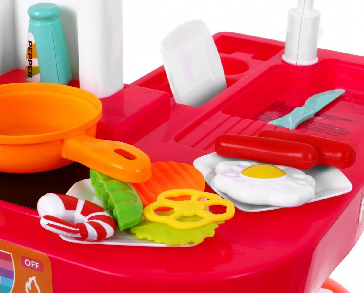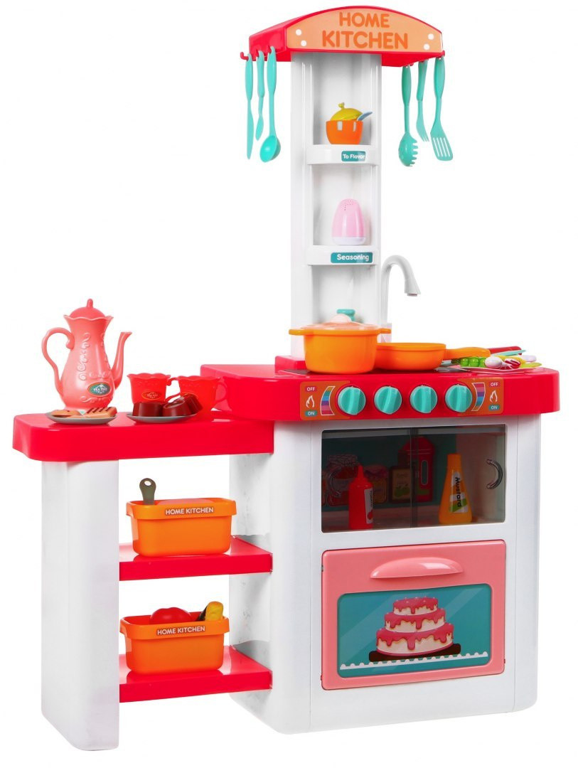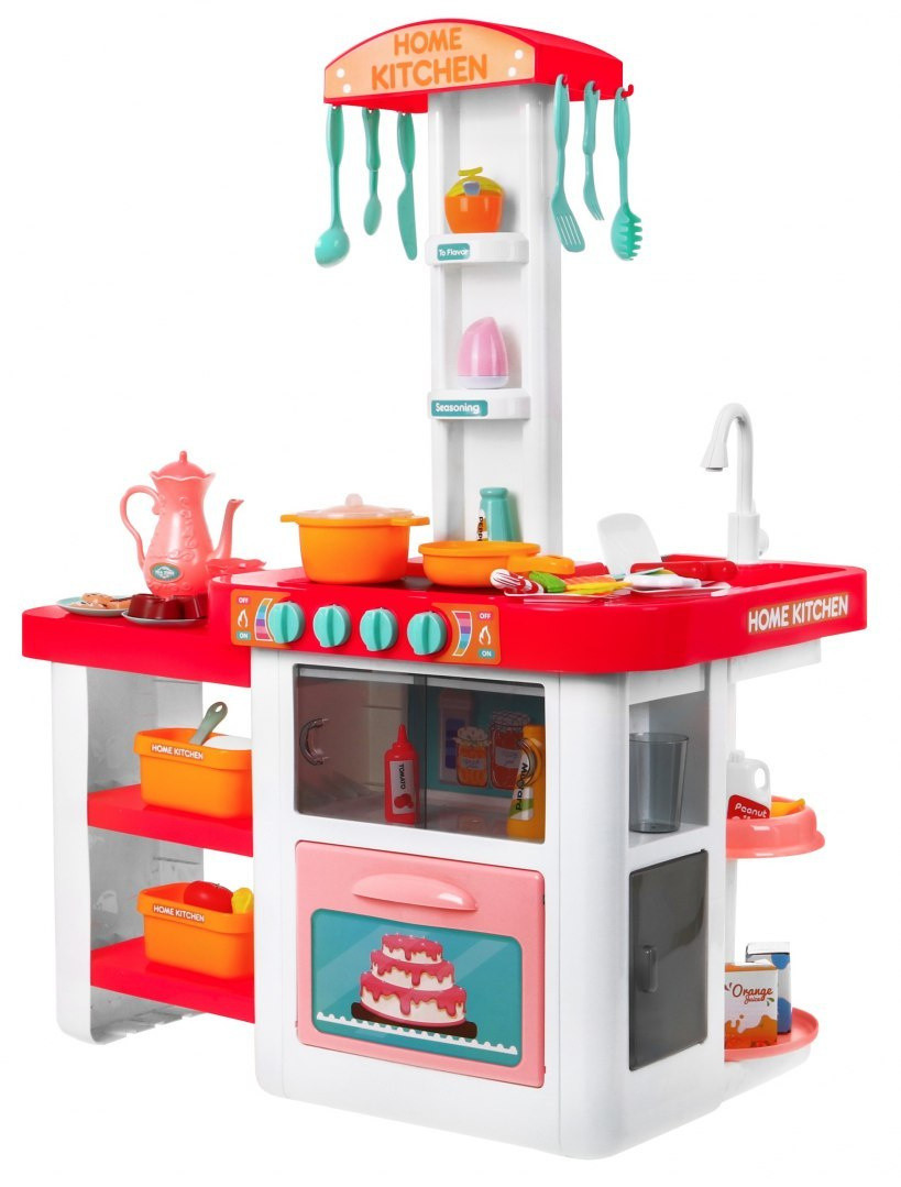 | Przedstawiamy Państwu niesamowitą, dużą kuchnię interaktywną z efektami świetnymi i dźwiękowymi. Dbałość o szczegóły, pastelowa kolorystyka, estetyczne wykonanie. Łatwy montaż i demontaż. Kuchnia posiada otwierany piekarnik, 4 palniki z dźwiękami i światłami oraz zlew z kranem z którego leci prawdziwa woda. Pokrętła są ruchome, po przekręceniu świeci i miga się czerwone światełko oraz słychać odgłos smażenia lub gotowania. Zabawka przeznaczona dla dzieci powyżej 3-go roku życia i posiada certyfikat CE. Instrukcja złożenia na opakowaniu. Zabawka zasilana bateriami typu 3 x AA (brak w zestawie). W zestawie znajduje się czapka i fartuszek kucharza, żeby twoje dziecko poczuło się jak prawdziwy szef kuchni. Fartuszek posiada 2 kieszonki np. na akcesoria kuchenne. Całość zapakowana w kolorowe pudełko, idealnie nadaje się na prezent.