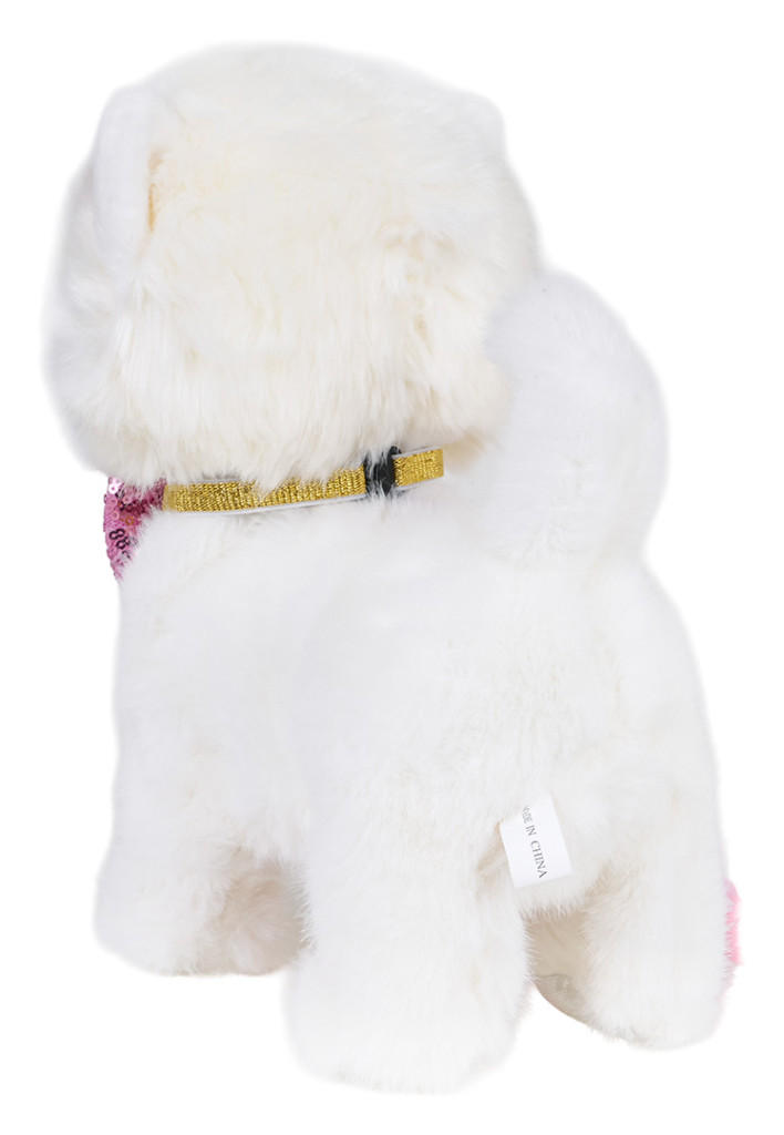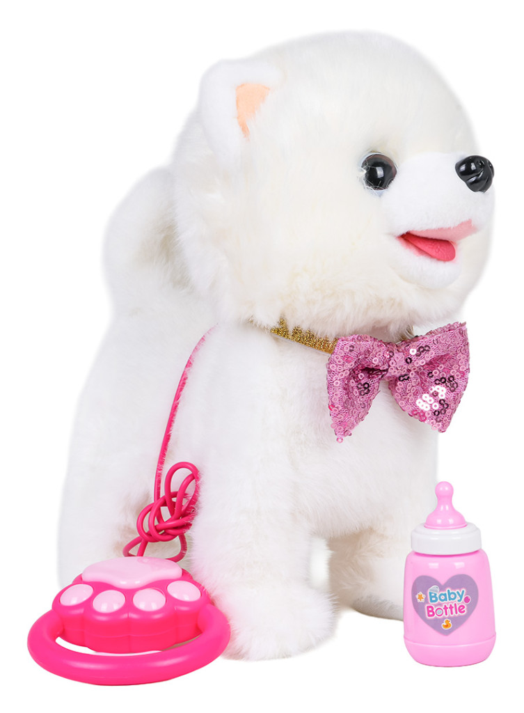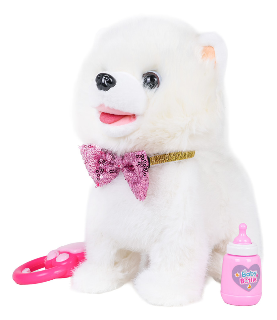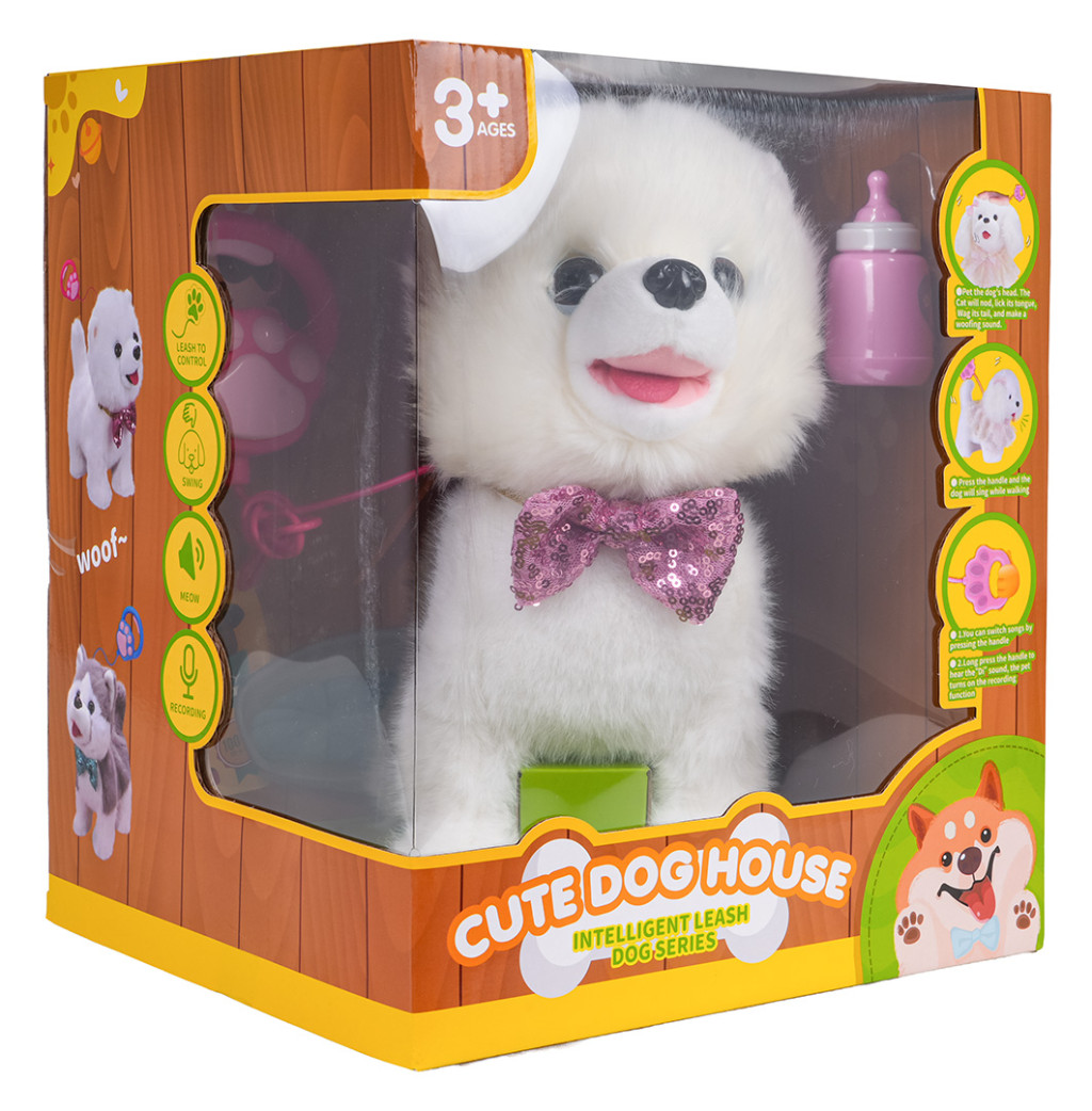 | Interaktywny, sensoryczny biały piesek dla dzieci od trzeciego roku życia. Piesek wykonany został z miękkiego bezpiecznego dla dzieci materiału, będzie idealny do głaskania i przytulania. Zabawka do złudzenia przypomina prawdziwe zwierzątko i posiada interaktywne funkcje. Dotknij głowy pieska, a zwierzątko zacznie wchodzić z tobą w interakcje. Będzie kiwać głową, merdać ogonkiem, wydawać szczekający dźwięk, lizać języczkiem i chodzić. Piesek posiada interaktywną smycz. Krótkie naciśnięcie uchwytu smyczy powoduje, że pies może szczekać, wysuwać język, merdać ogonem i chodzić w rytm muzyki. Naciśnięcie i przytrzymanie uchwytu powoduje uruchomienie funkcji nagrywania i odtwarzania, piesek będzie powtarzał po Tobie. W zestawie z pieskiem znajduje się butelka. Zabawka zasilana jest bateriami typu 3 x AA 1,5V (brak w zestawie).
