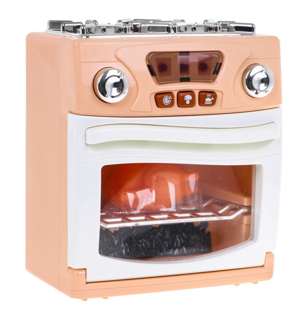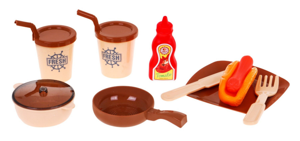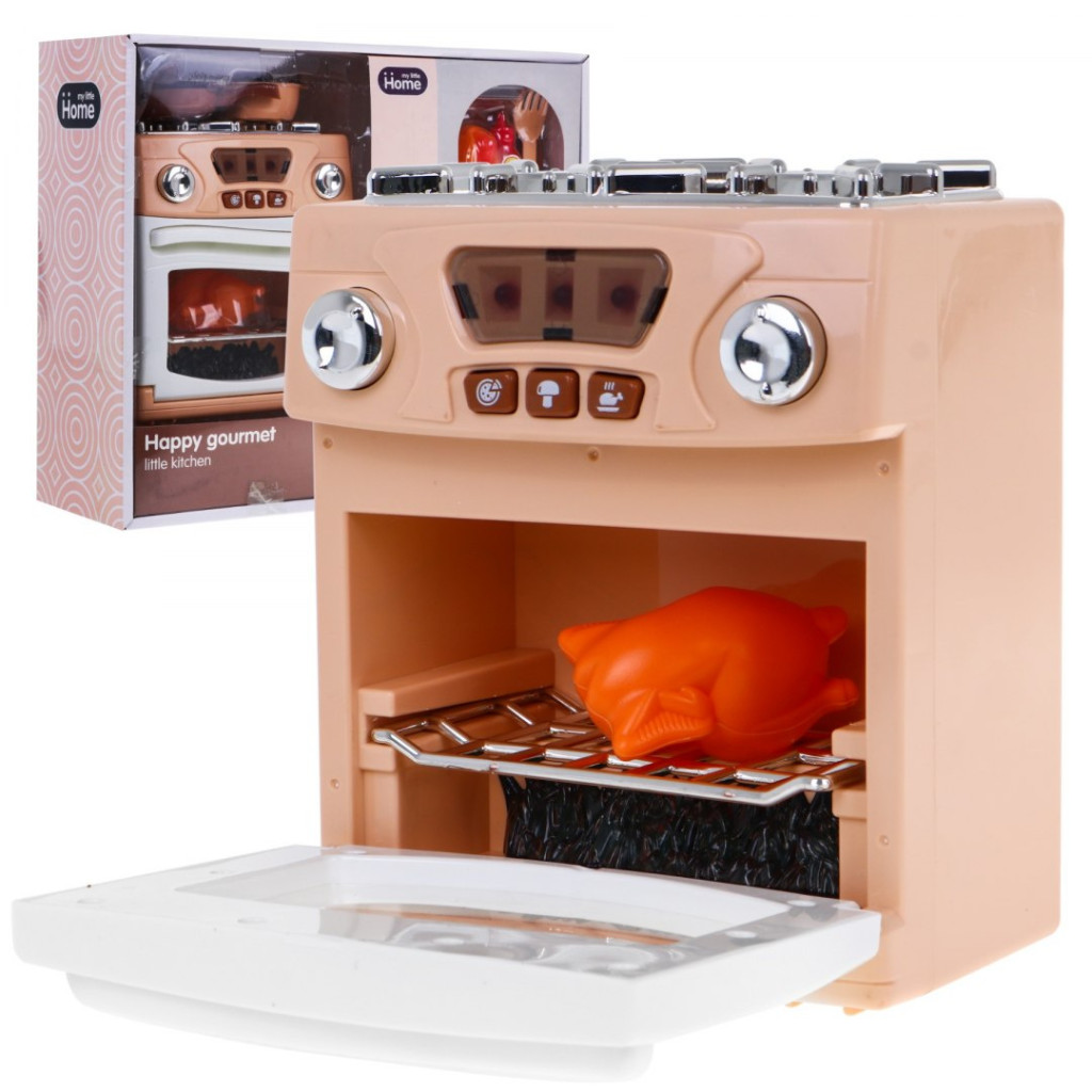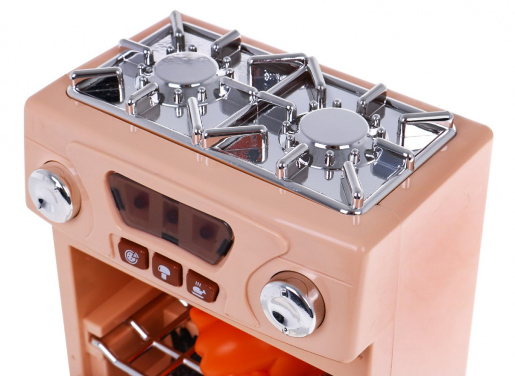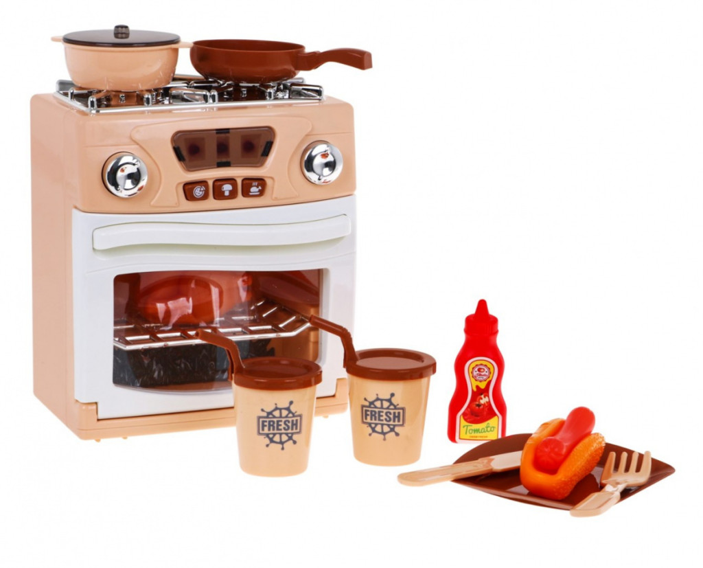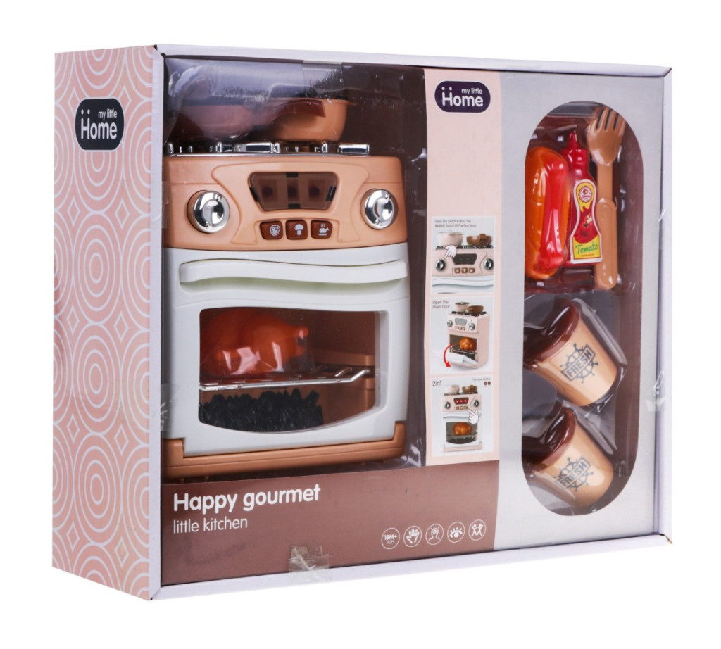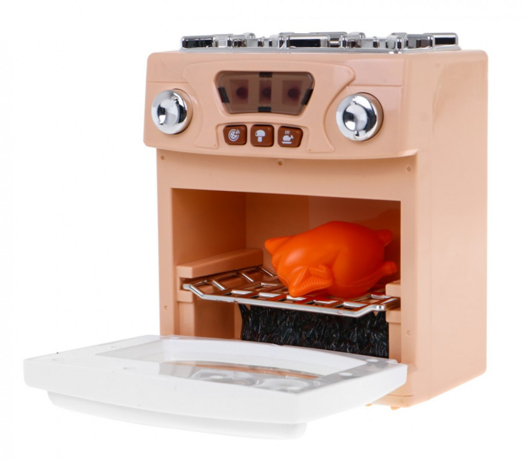 Zestaw interaktywna kuchenka z akcesoriami to propozycja dla wszystkich małych kucharzy i kucharek. Zabawka przeznaczona jest dla dzieci już od 18-go miesiąca życia. Kuchenka zasilana jest bateriami typu AA – 3 x 1,5V (brak w zestawie), posiada efekty dźwiękowe i świetlne. Po przekręceniu pokręteł w kuchence słychać odgłos gotowania (prawy palnik) i smażenia (lewy palnik), miga również dioda w piekarniku. 3 przyciski na kuchence (pizza, pieczarka i kurczak) uruchamiają dźwięki i efekty świetlne. Kuchenka posiada otwierany piekarnik. Twoja pociecha będzie mogła upiec kurczaka lub hot doga i podać go na talerzu dołączonym do zestawu.