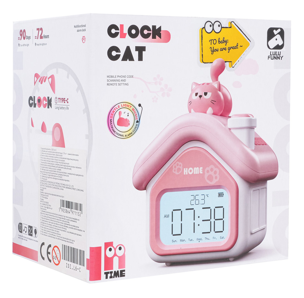 Elektroniczny zegar, budzik dla dzieci od trzeciego roku życia. Idealny jako budzik jak i dekoracja pokoju dziecięcego. Duża pojemność akumulatora i ładowanie kablem typu C. Subtelne oświetlenie nocne nie zakłóca snu w nocy. Zegar wyposażono we wskaźnik temperatury, minutnik, wskaźnik naładowania baterii, duży przejrzysty wyświetlacz, alarmy i tryb drzemki. Zegar idealnie sprawdzi się podczas nauki samodzielnego kładzenia się spać i wstawania. W zestawie mamy również karty, na których możemy wpisać plan dnia, kartki ze strzałkami, naklejki dekoracyjne i kabel do ładowania typu C. Zegar zasilany jest akumulatorem typu 3,7 V 1200 mAh (w zestawie). W instrukcji znajduje się kod do aplikacji umożliwiającej pobranie różnych dzwonków.