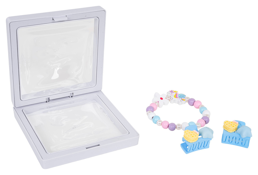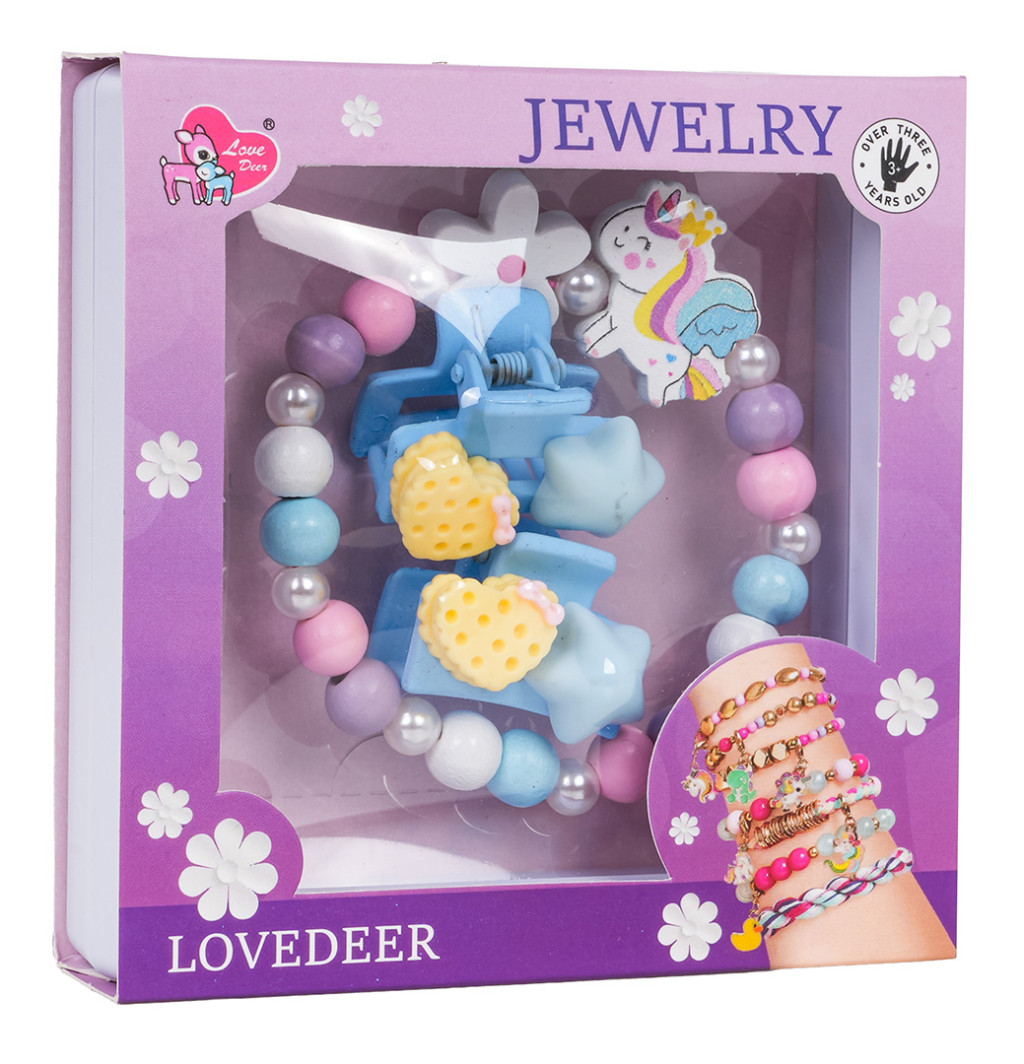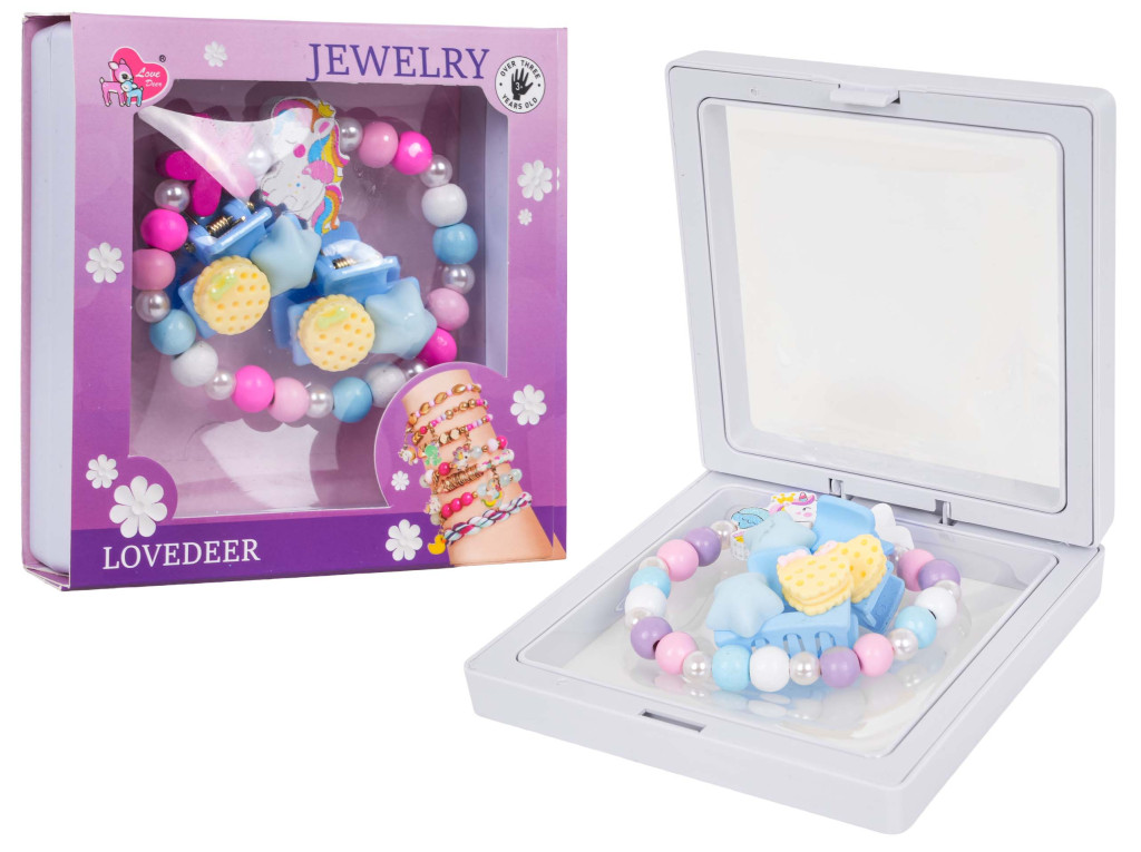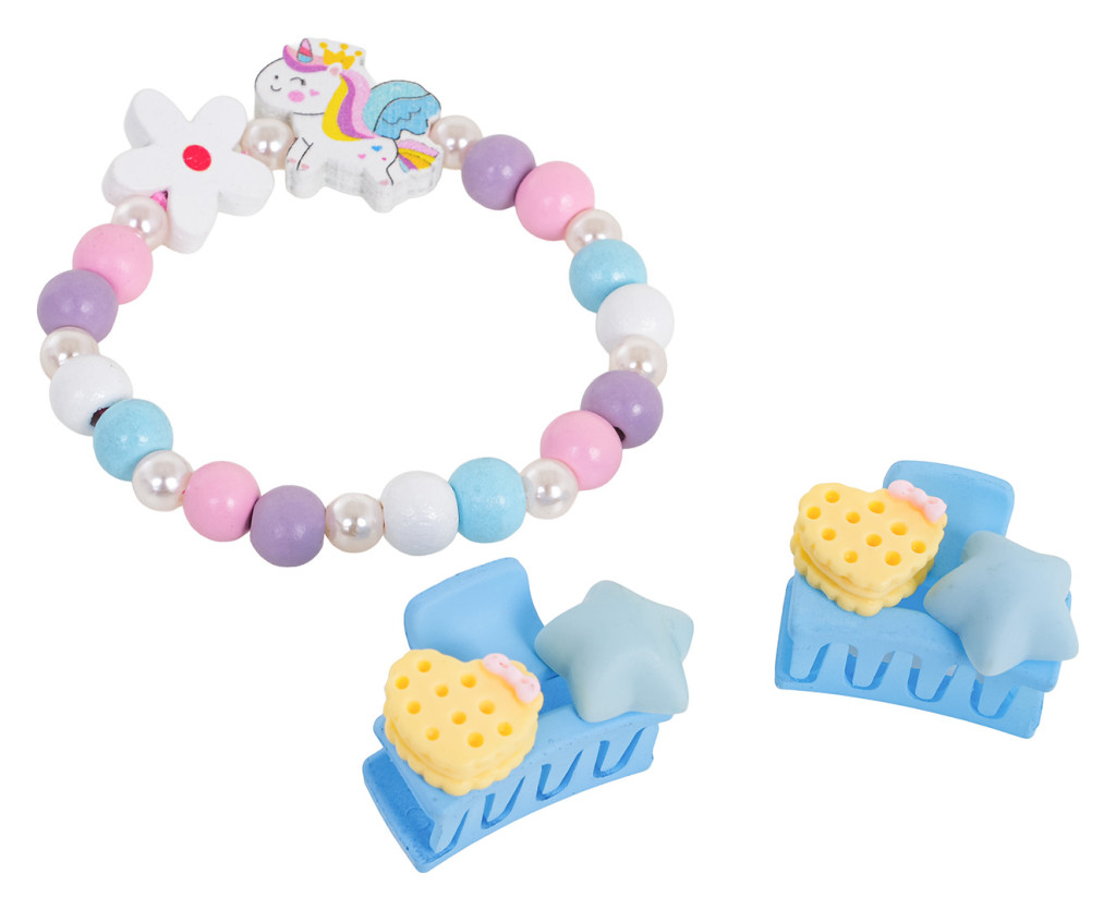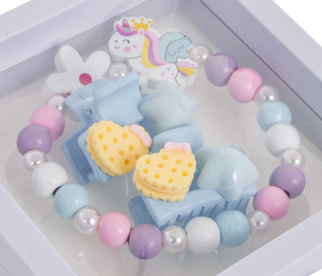 Zestaw biżuterii z jednorożcem dla dzieci od trzeciego roku życia. Zestaw składa się ze ślicznej bransoletki wykonanej z różnokolorowych drewnianych koralików, perełek i elementu z jednorożcem, a także dwóch spinek. Zestaw wykonano z dbałością o szczegóły w żywych kolorach.