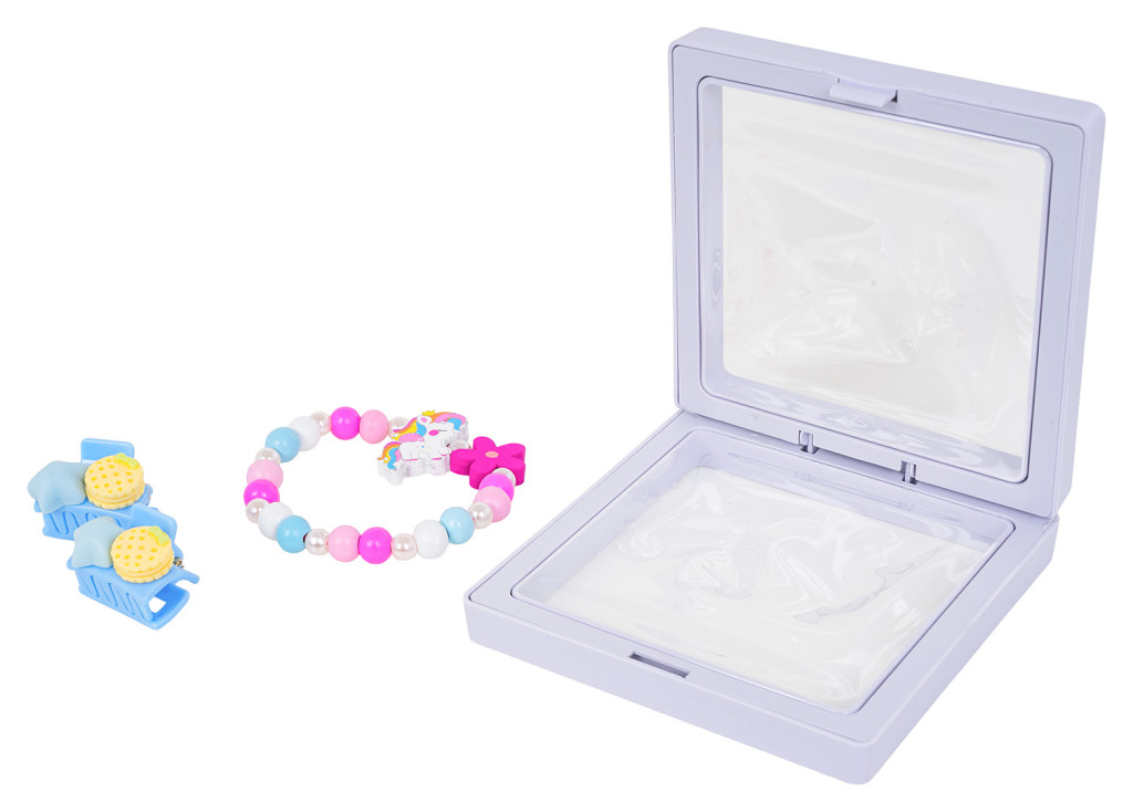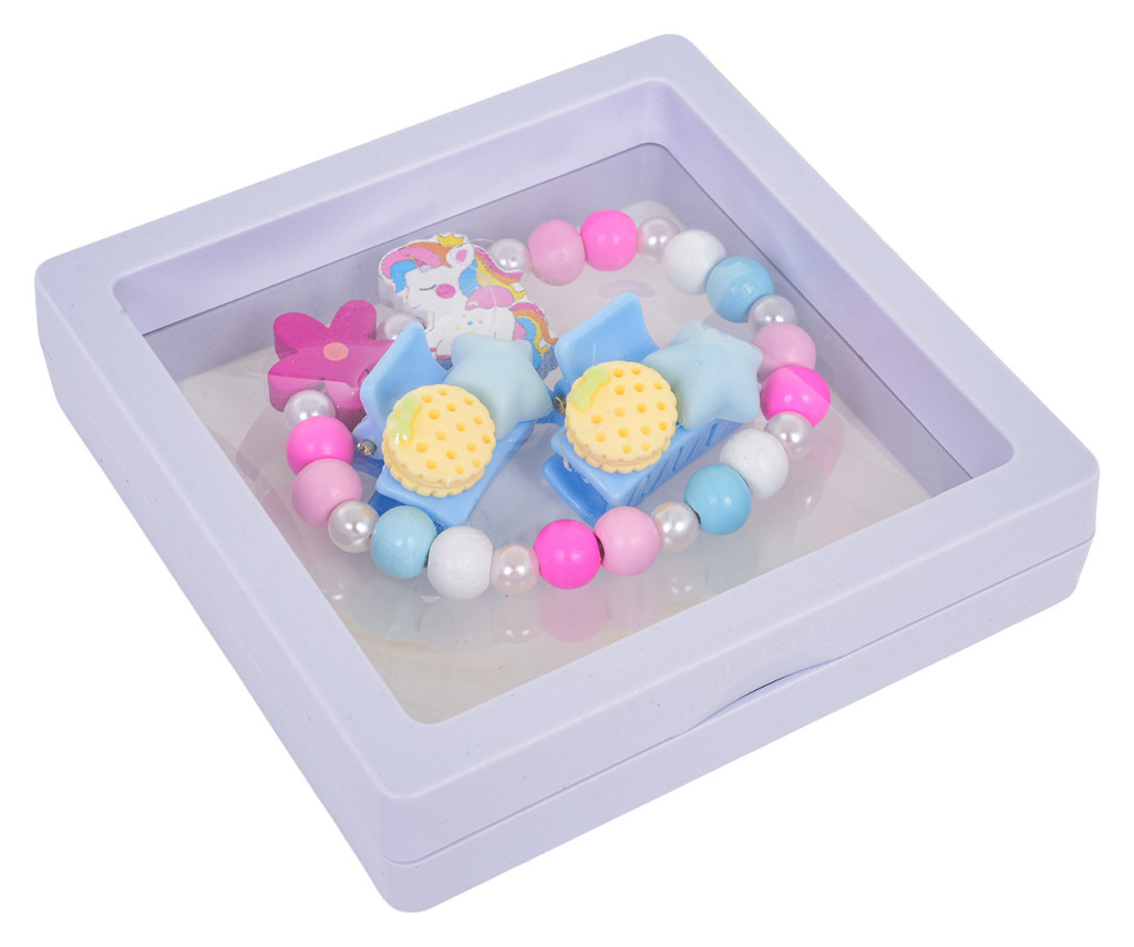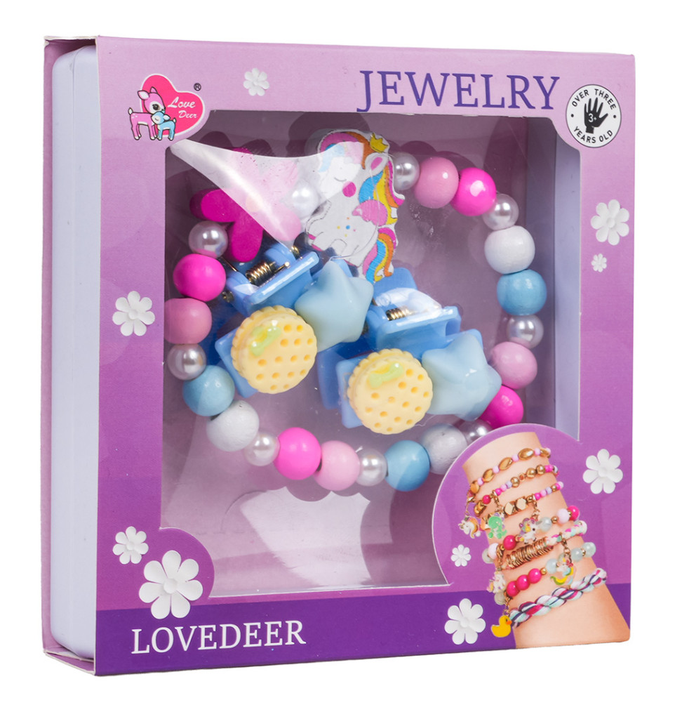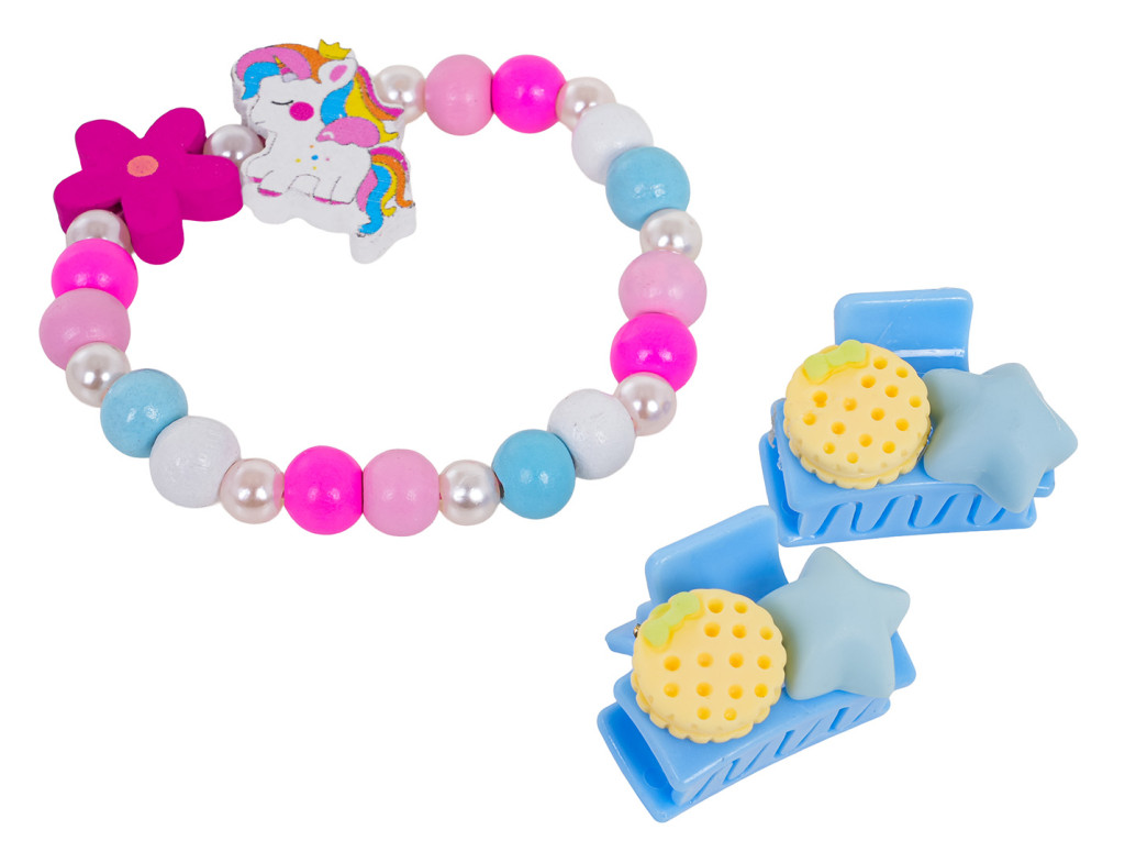 Zestaw biżuterii z jednorożcem dla dzieci od trzeciego roku życia. Zestaw składa się ze ślicznej bransoletki wykonanej z różnokolorowych drewnianych koralików, perełek i elementu z jednorożcem, a także dwóch spinek. Zestaw wykonano z dbałością o szczegóły w żywych kolorach.