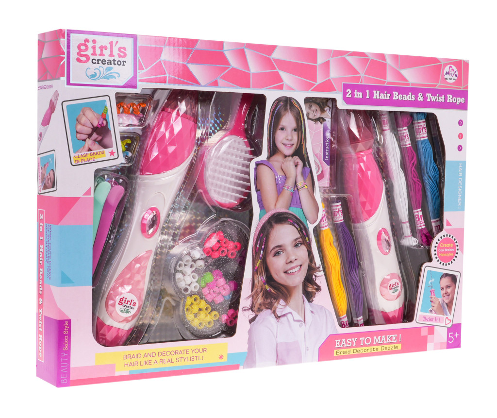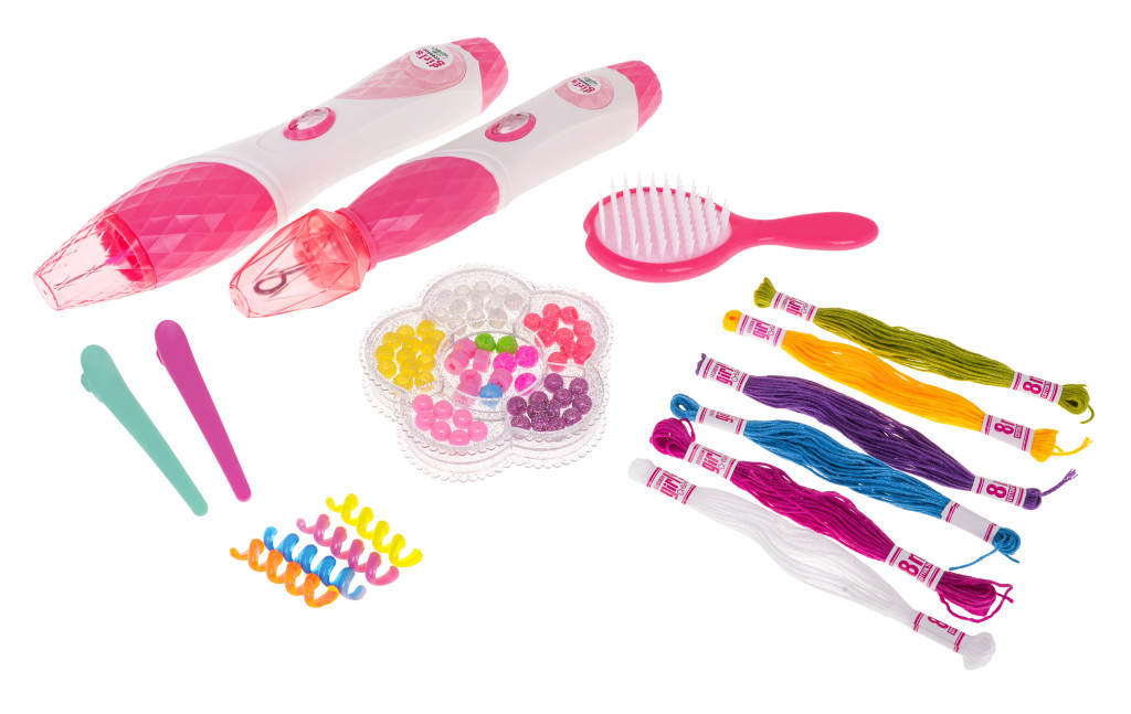 | - maszynka do aplikacji koralików na włosach ok. 26 cm x 5 cm xa 4,5 cm, - maszynka do zaplatania warkoczy z muliny ok. 25 cm x 4,5 cm x 4,5 cm, - szczotka do włosów ok. 14,5 cm x 6 cm x 2,5 cm, - koralik ok. 0,5 cm x 0,8 cm, - pudełko na biżuterię ok. 11 cm x 11 cm x 2 cm, - sprężynki ok. 4,5 cm x 1,5 cm, - opakowanie ok. 45 cm x 31 cm x 5,3 cm. |