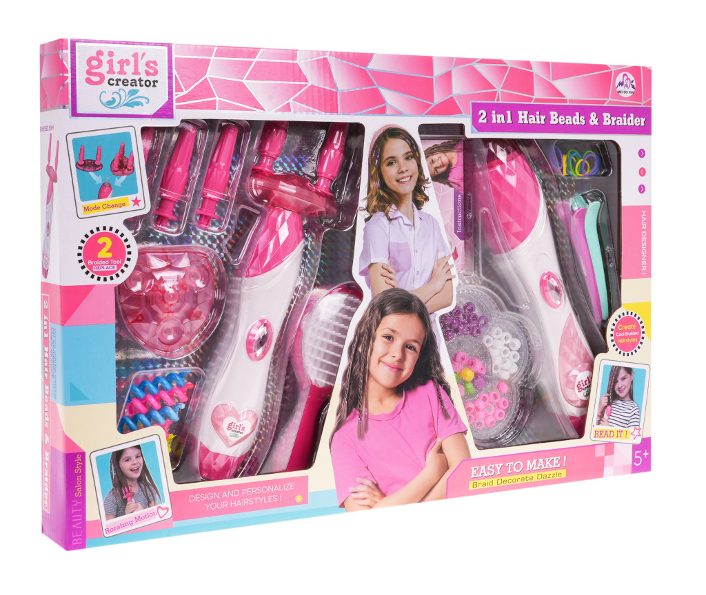 | - maszynka do zaplatania włosów ok. 26,5 cm x 7,5 cm x 7,5 cm, - maszynka do aplikacji koralików na włosach ok. 26 cm x 5,5 cm x 5 cm, - pudełko na koraliki ok. 11 cm x 11 cm x 2 cm, - koralik ok. 0,5 cm x 0,8 cm, - szczotka do włosów ok. 14,5 cm x 6 cm x 2,5 cm, - sprężynka do włosów ok. 4,5 cm x 1 cm, - spinka do włosów ok. 9,5 cm x 1,3 cm x 2 cm, - opakowanie ok. 44,5 cm x 30,8 cm x 5 cm. |