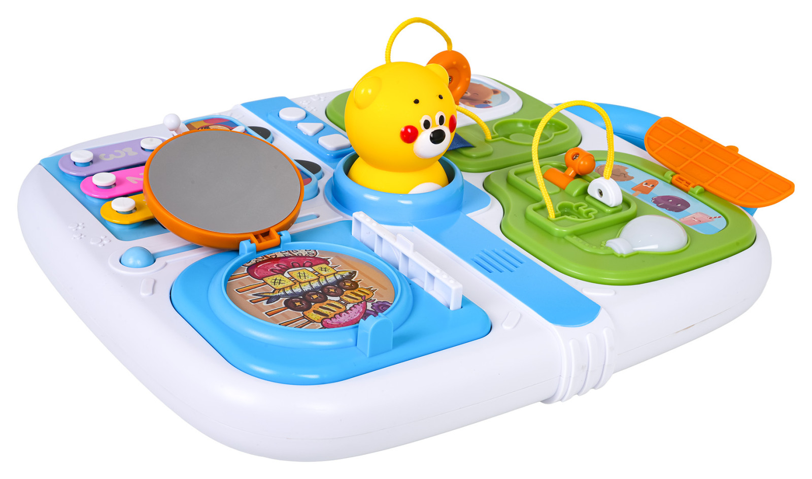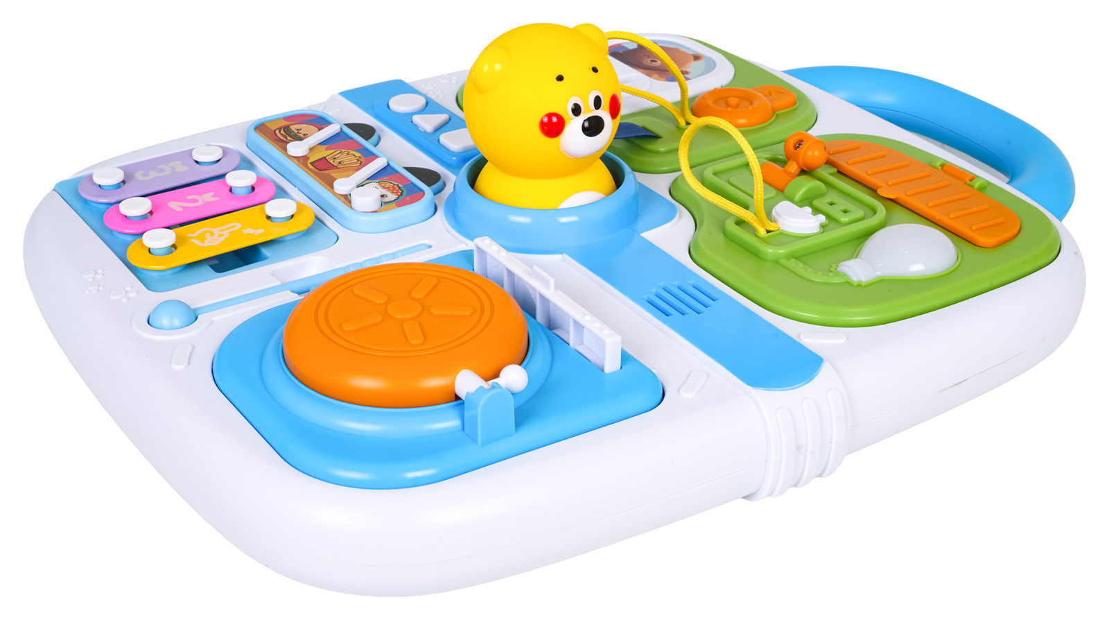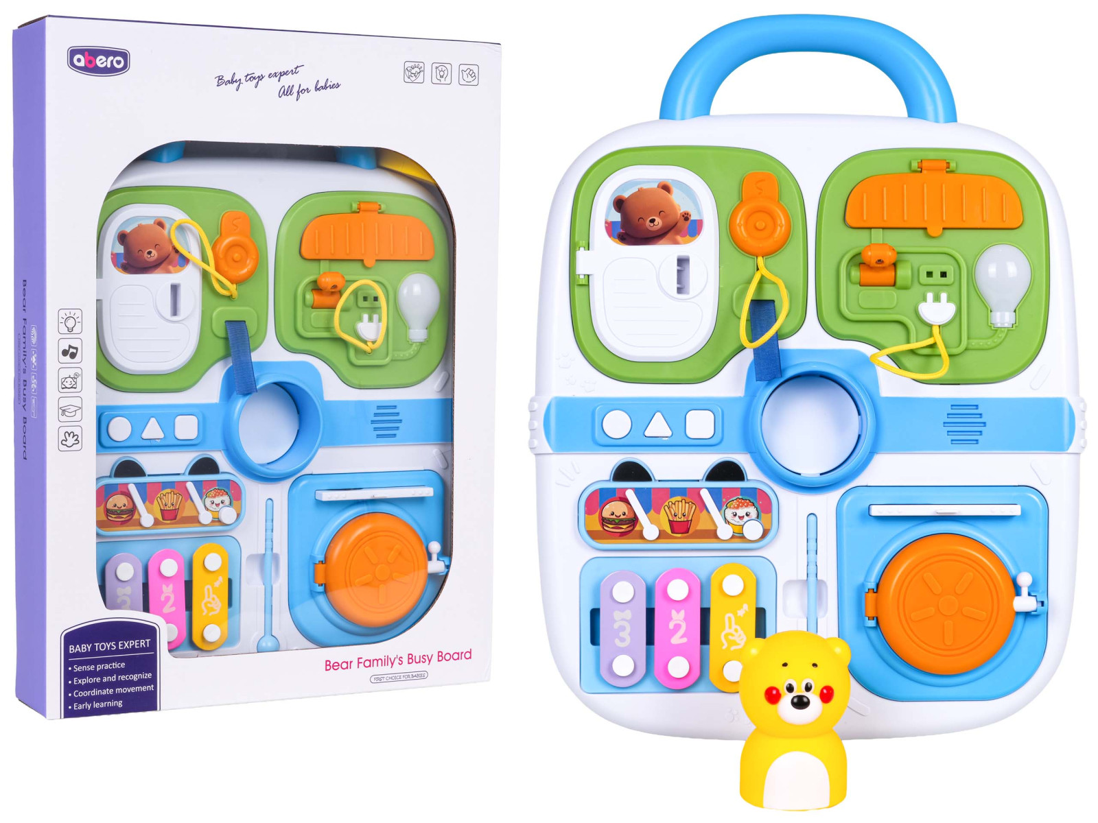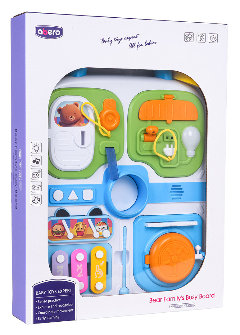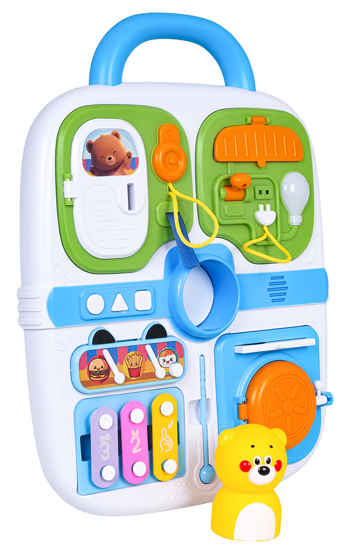 Wielofunkcyjna walizka manipulacyjna dla maluszków od osiemnastego miesiąca życia. Zabawkę wykonano z najlepszej jakości materiałów bezpiecznych dla dzieci w żywych kolorach. Walizkę wyposażono w elementy manipulacyjne ćwiczące koordynację ruchową i wspomagające logiczne myślenie. Na górze walizki znajduje się rączka do przenoszenia a na przedniej stronie elementy do otwierania, przesuwania, naciskania oraz mini cymbałki i pałeczka.