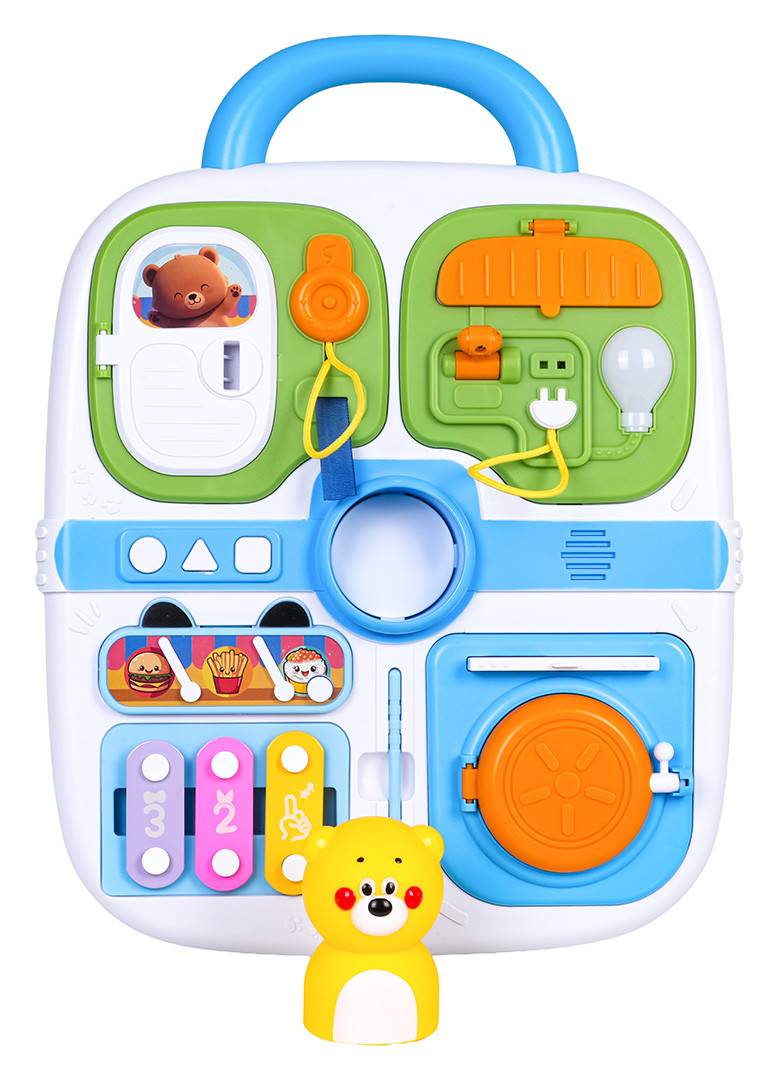 Funkcje: - dla dzieci od trzeciego roku życia, - zestaw wykonano z bezpiecznych dla dzieci materiałów w żywych kolorach, - mnóstwo elementów manipulacyjnych do otwierania, przesuwania, naciskania (otwierane drzwi na kluczyk, otwierany grill, wysuwana płyta grzewcza, zaświecanie żarówki przez włożenie wtyczki do kontaktu), - misiu w centralnej części walizki z piszczałką po naciśnięciu, - efekty dźwiękowe: melodie, efekty dźwiękowe (3 przyciski: kółko, trójkąt, kwadrat), - cymbałki i pałeczka w zestawie, - rączka do przenoszenia walizki. |
