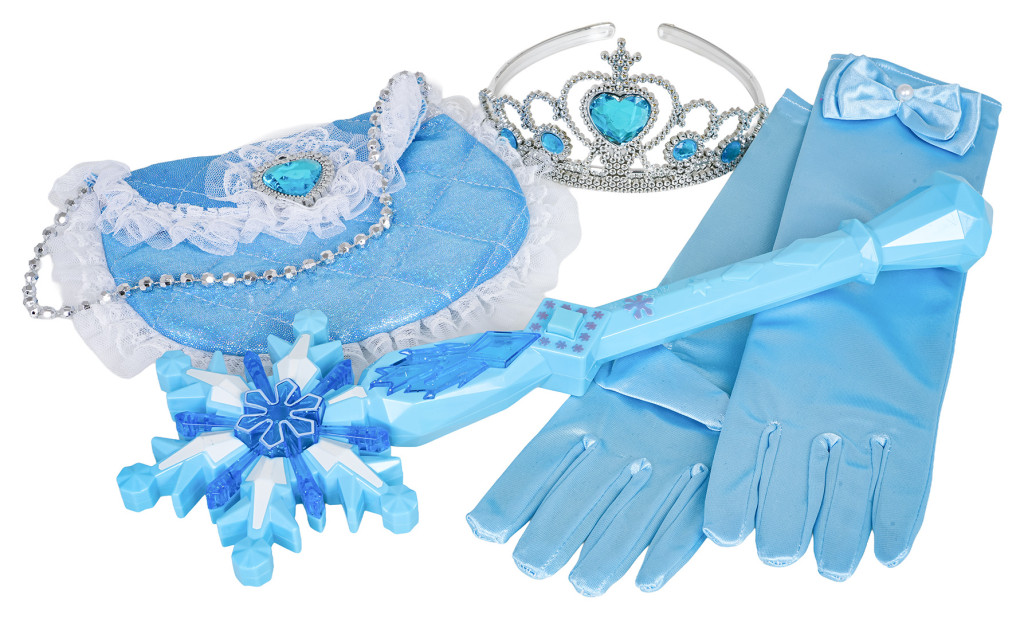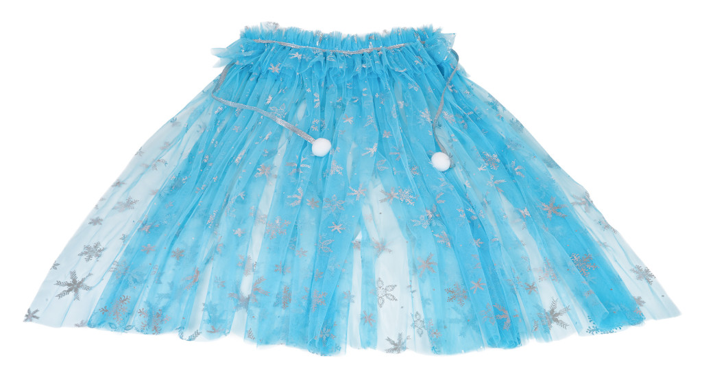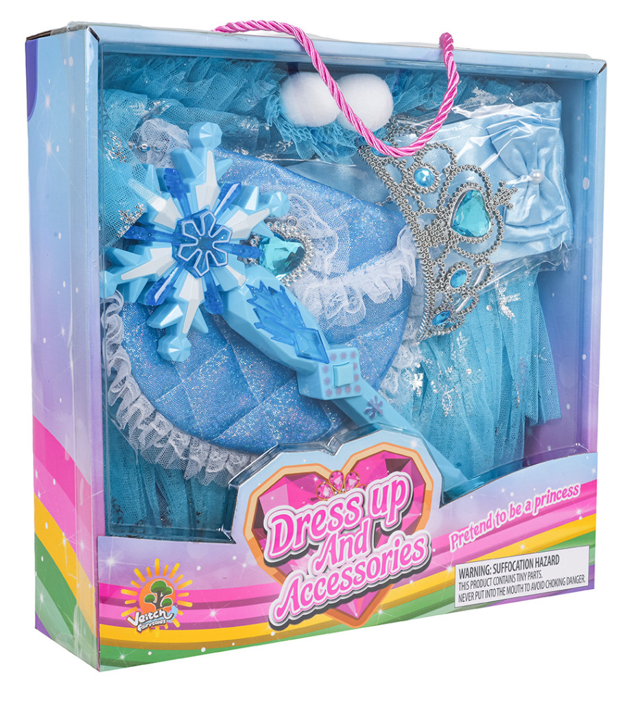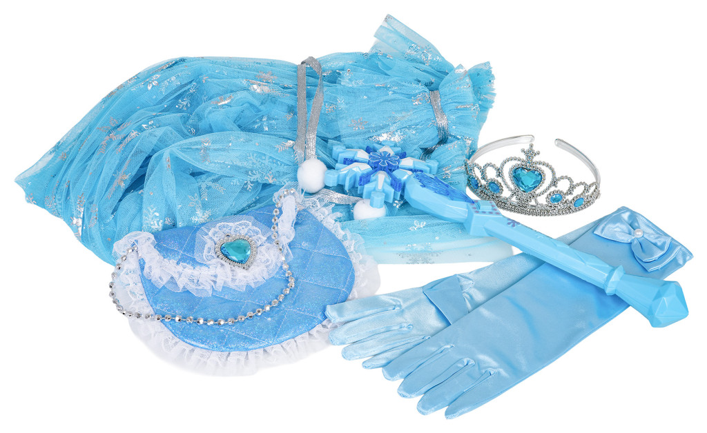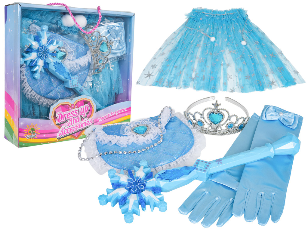 Zestaw małej księżniczki dla dzieci od trzeciego roku życia. Zestaw wykonano z dbałością o szczegóły w pięknym szafirowym kolorze i ozdobiono błękitnymi kamieniami. Na zestaw składa się peleryna wykonana z tiulu, rękawiczki, torebka, korona i magiczna różdżka z efektami dźwięku i światła. Zestaw idealny na bal, przedstawienie lub do codziennej zabawy. Magiczna różdżka zasilana jest bateriami typu 2 x AAA 1,5 V (brak w zestawie).