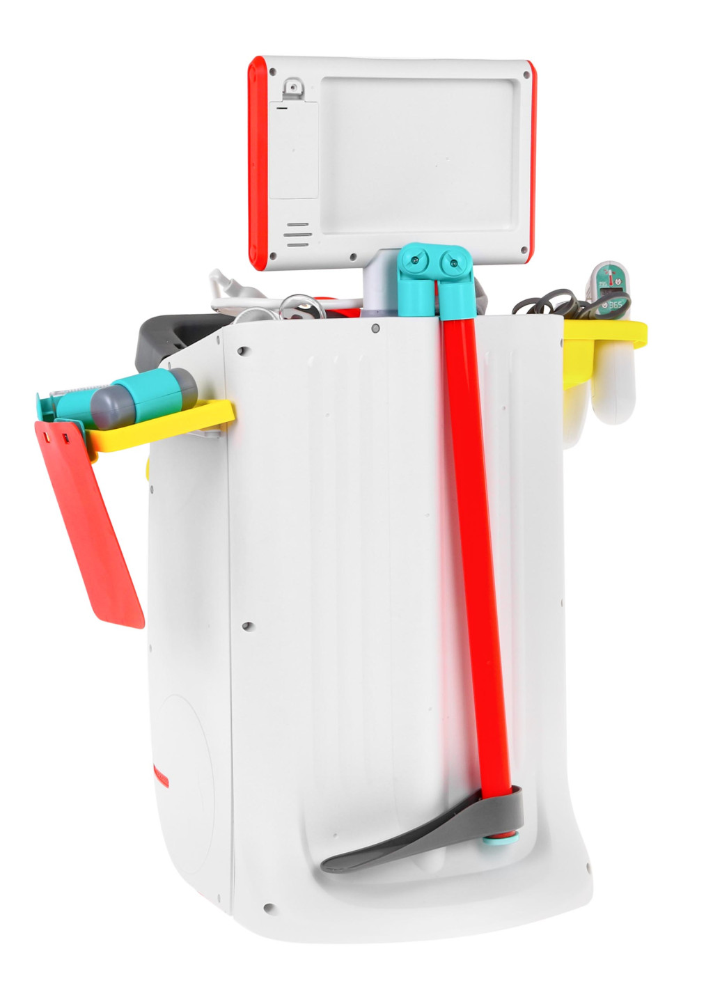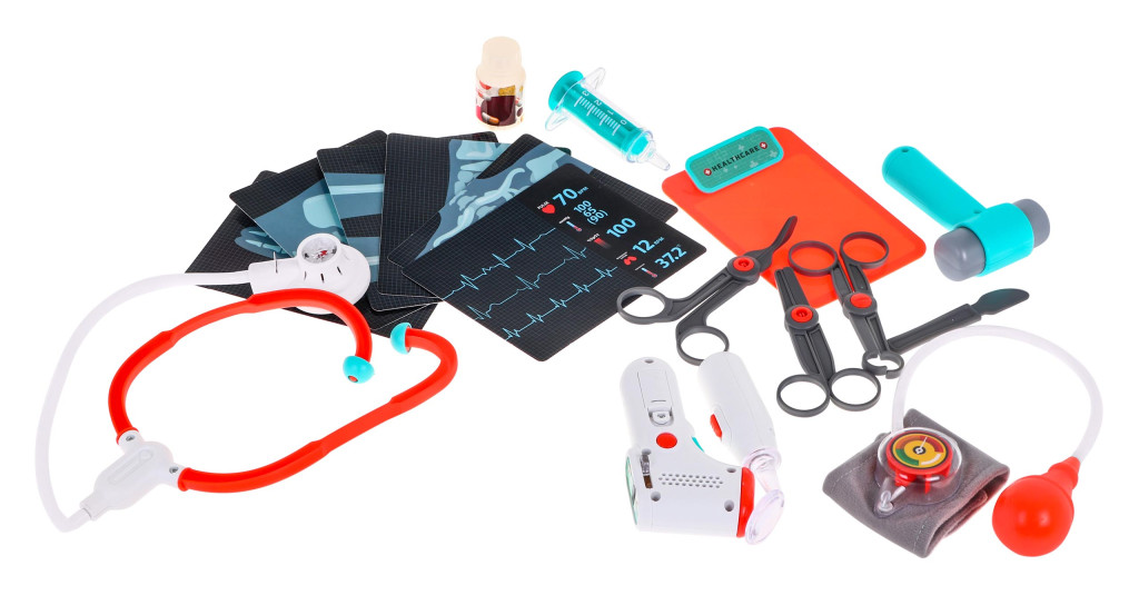 | - wózek lekarski z półeczkami na akcesoria i szufladą, - miarka wzrostu do 112 cm, -monitor EKG i RTG z efektami dźwiękowymi, - zdjęcia rentgenowskie stopy, miednicy, płuc, dłoni, nóg, - stetoskop z dźwiękiem bicia serca i podświetlanym wyświetlaczem, -ciśnieniomierz z gruszką do pompowania, - podświetlane lusterko dentystyczne, - podświetlana latarka diagnostyczna, - podświetlana sonda do USG, - termometr z regulacją temperatury, podświetlanym wynikiem i sygnałem pomiaru temperatury, - strzykawka z możliwością nabierania wody, - młotek neurologiczny, - skalpel, - nożyczki, - szczypce medyczne, - nożyczki do opatrunków, - podkładka na kartę pacjenta, - atrapa pojemniczka z lekami, - pulsometr, - naklejki dekoracyjne, - instrukcja montażu.