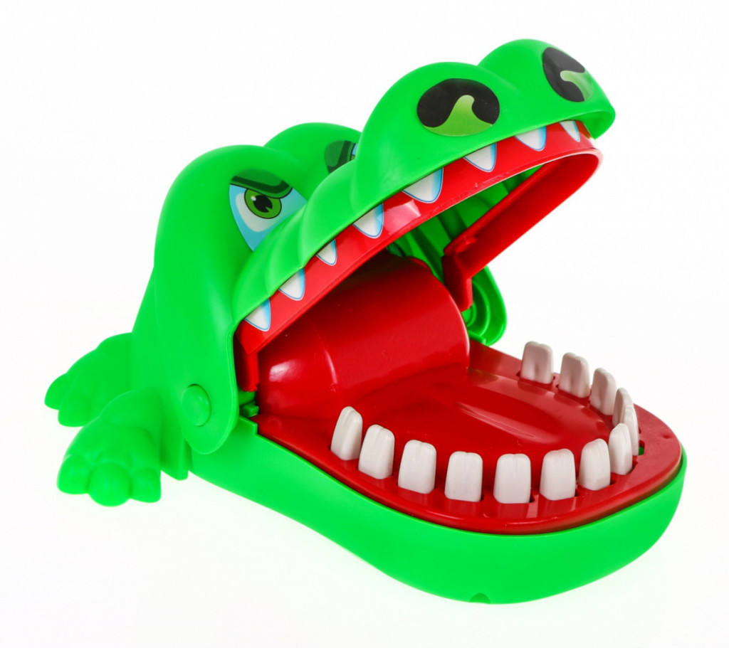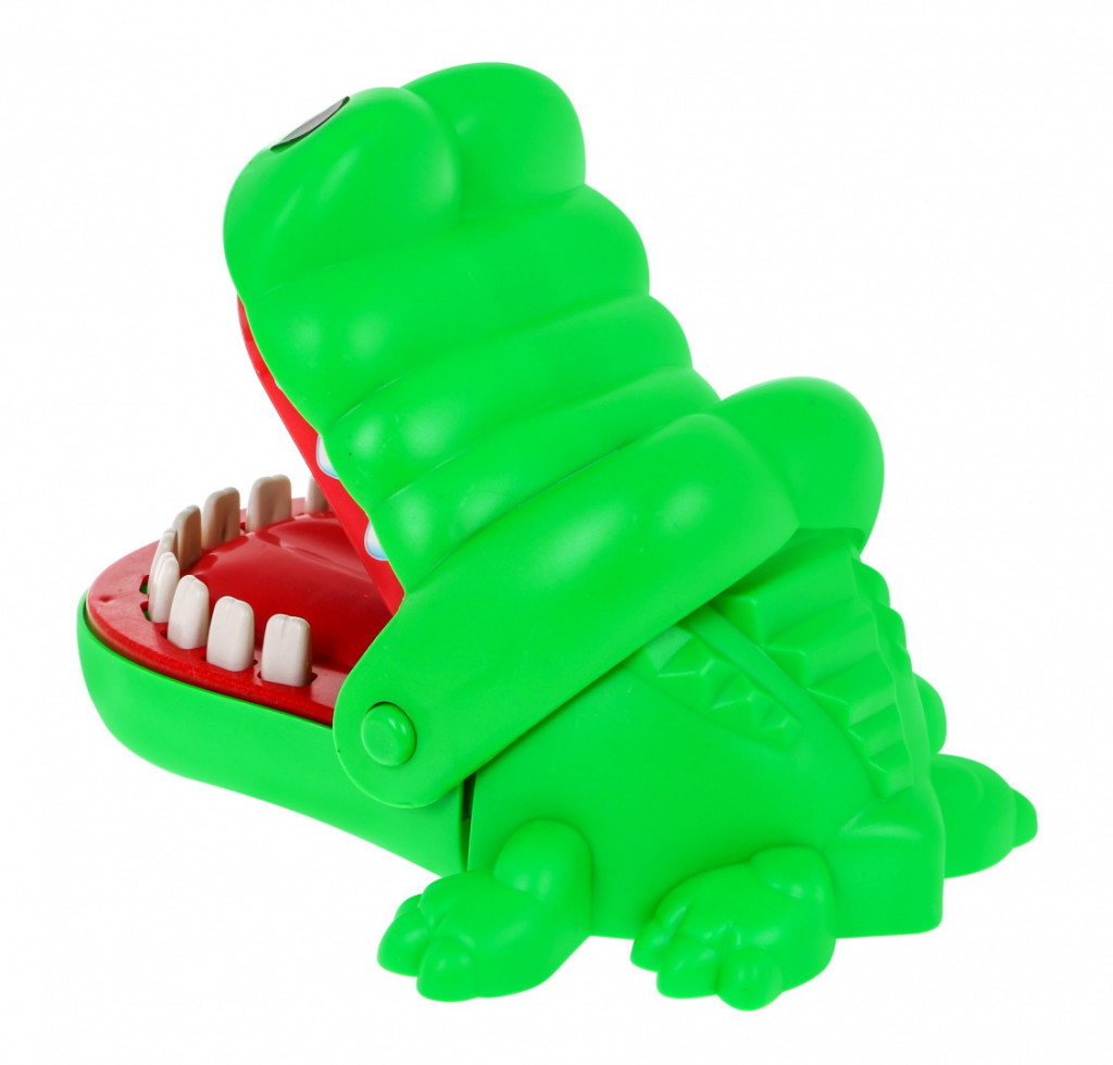 Mini gra – można ją zabrać wszędzie ze sobą. Zapewni świetną rozrywkę i pozytywnie wpłynie na rozwój umiejętności zręcznościowych Twojej pociechy. Zabawka przeznaczona jest dla dzieci od 3-go roku życia. Można w nią grać samodzielnie lub w grupie. Krokodyla boli ząbek, musimy mu pomóc ale trzeba bardzo uważać jeżeli urazimy go dotykiem bardzo się zdenerwuje i nas ugryzie. Gra kończy się w momencie naciśnięcia chorego ząbka krokodyla. Za każdym razem jest to inny ząbek, dlatego zabawa szybko się nie nudzi. Ząbki krokodyla wykonane zostały z lekkiego tworzywa, więc nie ma się co obawiać ugryzienia, to nic nie boli. Zabawka dostarcza graczom dreszczyk emocji, nigdy nie wiadomo w którym momencie paszcza się zamknie, spodoba się małym i dużym.