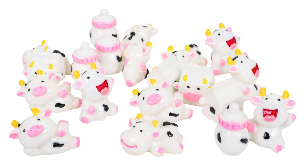| - 16 x figurka krówki po cztery w różnych pozycjach, - 4 x figurka mleka w kartoniku, - 4 x butelka z mlekiem, - drzewko, - stojak, - tabliczka, - naklejki dekoracyjne |