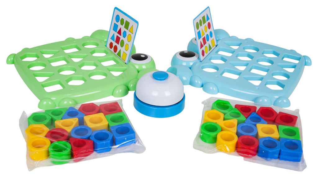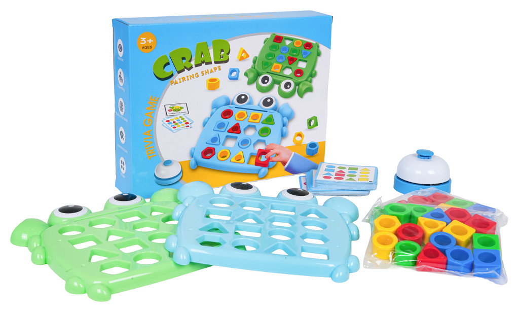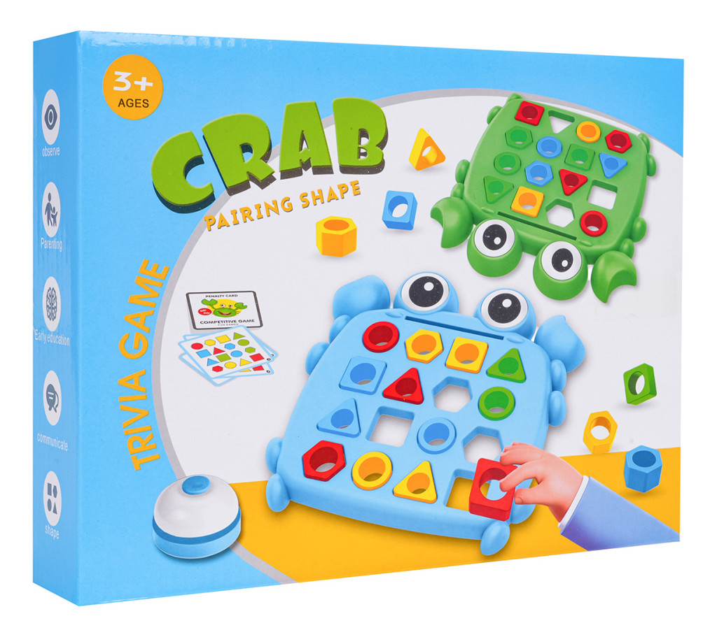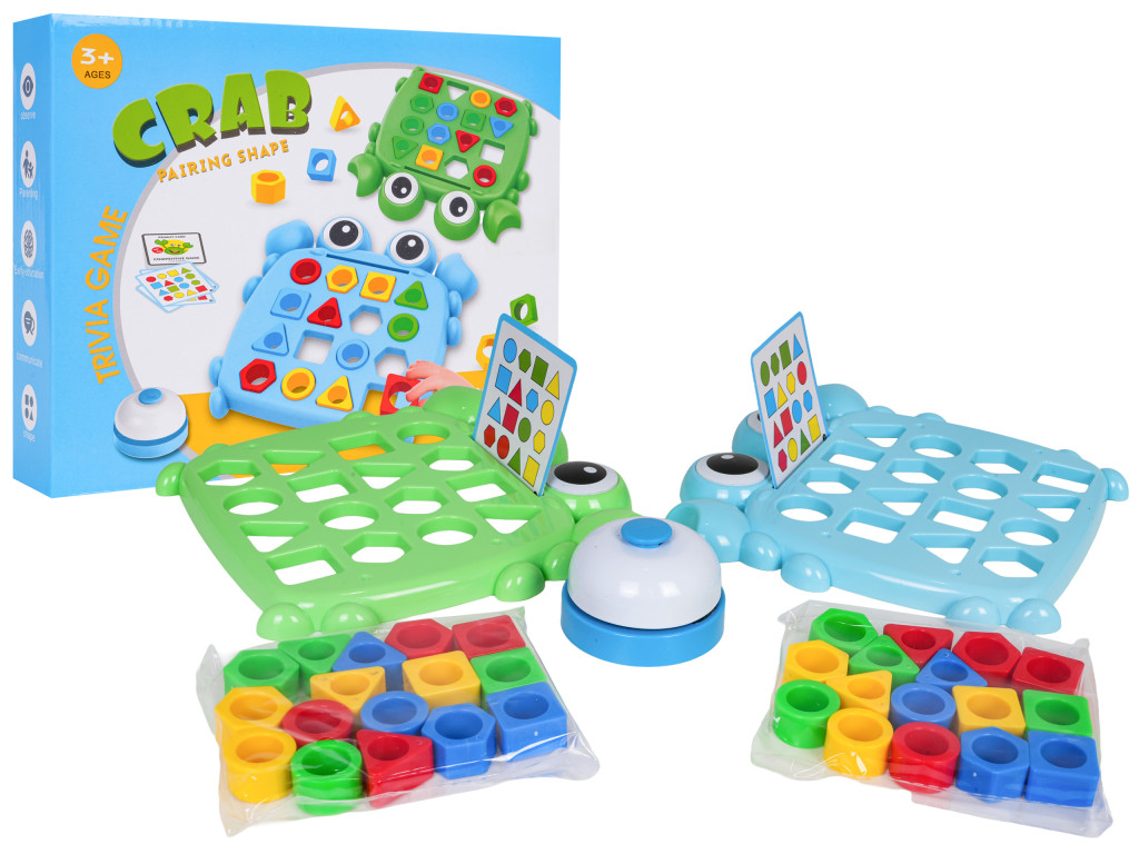 | Zręcznościowa gra z krabem, dopasuj kolory, dopasuj kształty, ćwicz refleks dla dzieci od trzeciego roku życia. Gra składa się z dwóch plansz o kształcie kraba, kart z zadaniami i wyzwaniami, kart karnych, pionków o różnych kształtach i kolorach oraz dzwoneczka. W grę można grać samodzielnie lub w dwie osoby. Grając samodzielnie, losujemy kartę, kładziemy ją we wgłębieniu znajdującym się na górze planszy. Następnie próbujemy ułożyć pionki na planszy, w taki sposób jak to pokazuje karta. Dziecko uczy się rozpoznawać kształty i kolory. Jeżeli gramy w dwie osoby to wygrywa ta, która jako pierwsza skończy układać wzór z karty i naciśnie na dzwoneczek. Jeżeli wzór został ułożony poprawnie, gracz zabiera kartę, jeżeli zaś źle, wówczas gracz losuje kartę z pytaniami, a jeśli źle odpowie na pytanie wówczas musi podjąć wyzwanie. Jeżeli nie podejmie wyzwania, wówczas czeka na niego karta karna. Gra uczy przez zabawę spostrzegawczości, kształtów, kolorów, szybkości podejmowania decyzji.