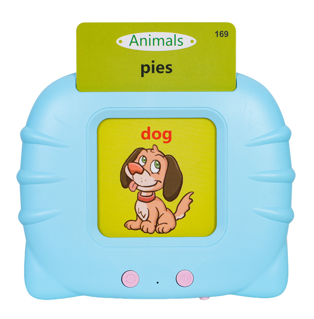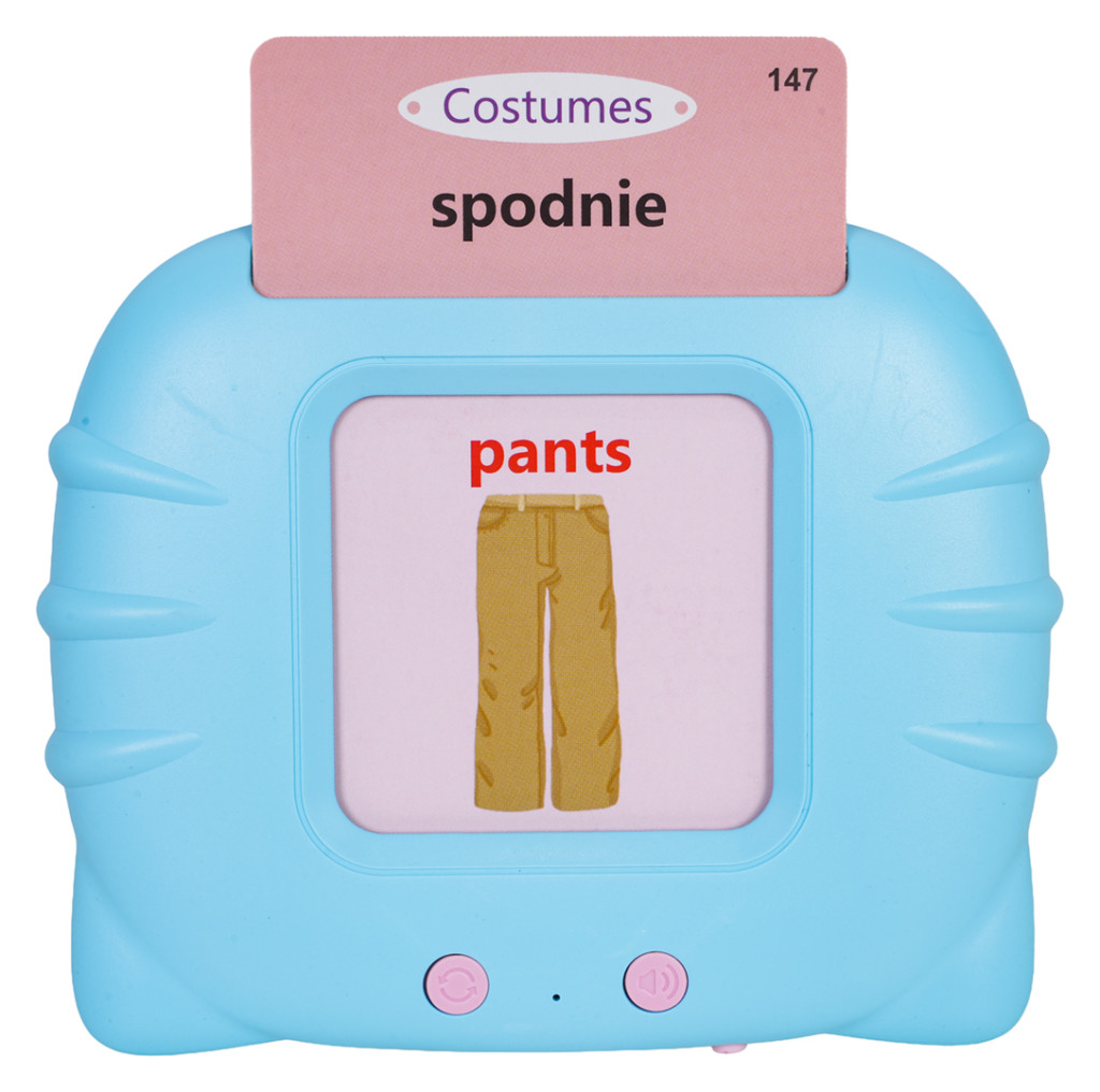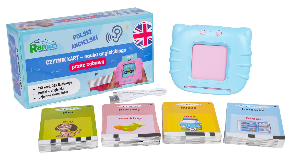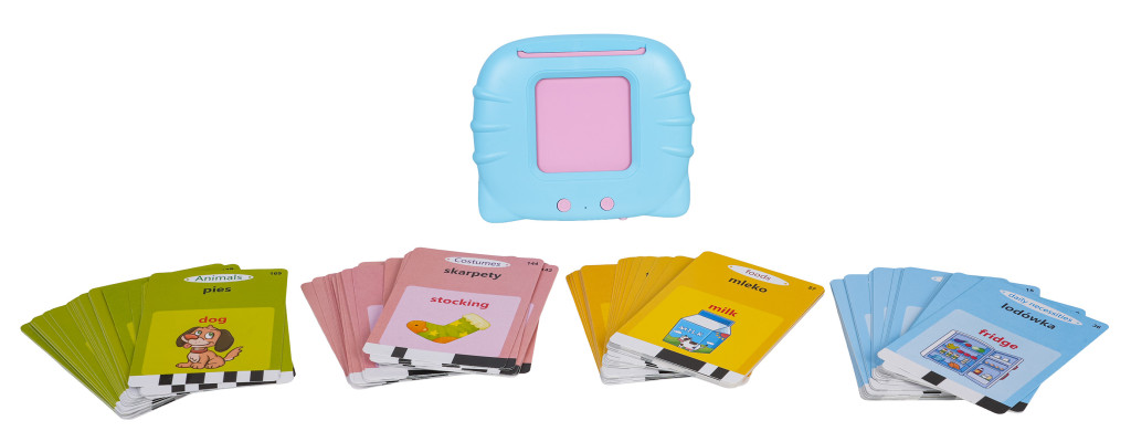| Edukacyjny czytnik kart w wersji językowej angielsko-polskiej, dla dzieci od trzeciego roku życia. Znakomita zabawa i nauka w prosty i ciekawy sposób. Zestaw zawiera 112 dwustronnych kart ze słówkami i obrazkami oraz czytnika kart. Dziecko wkłada kartę do czytnika i słyszy nazwę przedmiotu narysowanego na obrazku w języku polskim i angielskim, niektóre karty generują również głos. Czytnik posiada regulację głośności i możliwość ponownego odsłuchania słówka. Jest lekki i idealnie pasuje do dziecięcych rączek. Czytnik ładowny jest przez kabel USB, zasilany akumulatorem typu 3,7 V (w zestawie), instrukcja użycia w języku polskim.