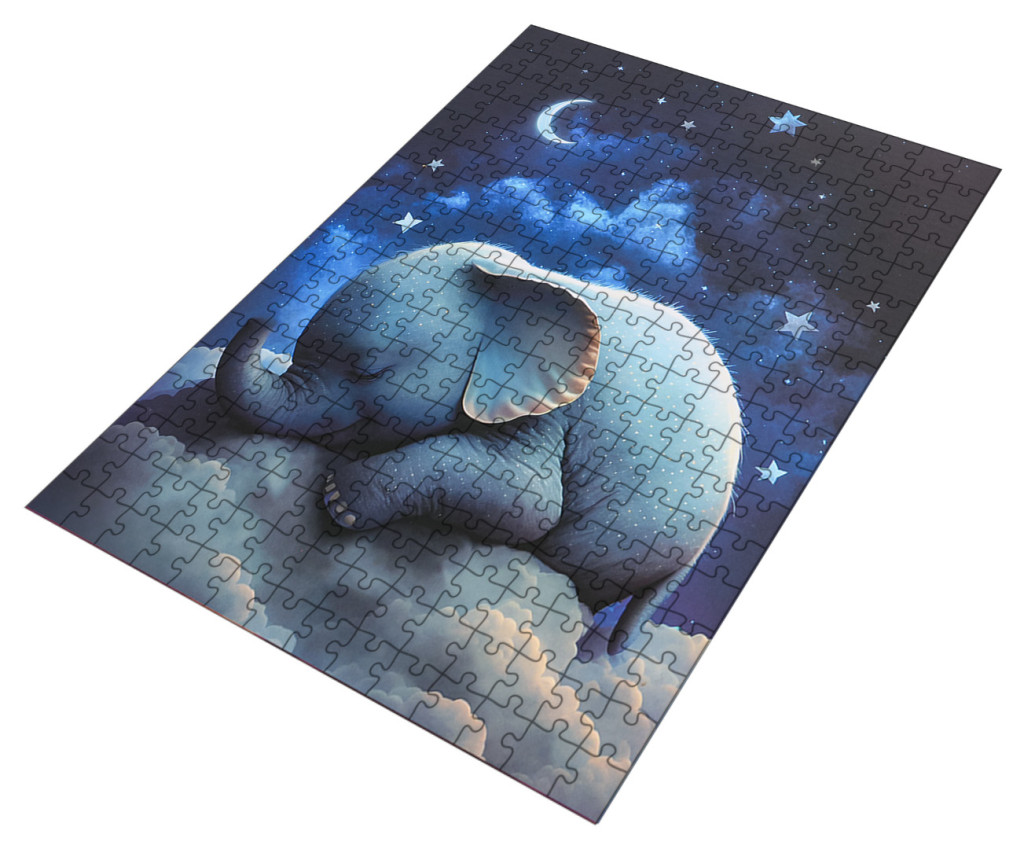 Zestaw puzzli 300 elementów ze słoniem w chmurach dla dzieci od ósmego roku życia. Układanie puzzli uczy nas koncentracji, a także skupienia na jednej rzeczy. Pozwala nam się odstresować, zapomnieć o problemach. Puzzle uczą nas logicznego myślenia, dopasowania kształtu i korzystnie wpływają na naszą pamięć wzrokową.