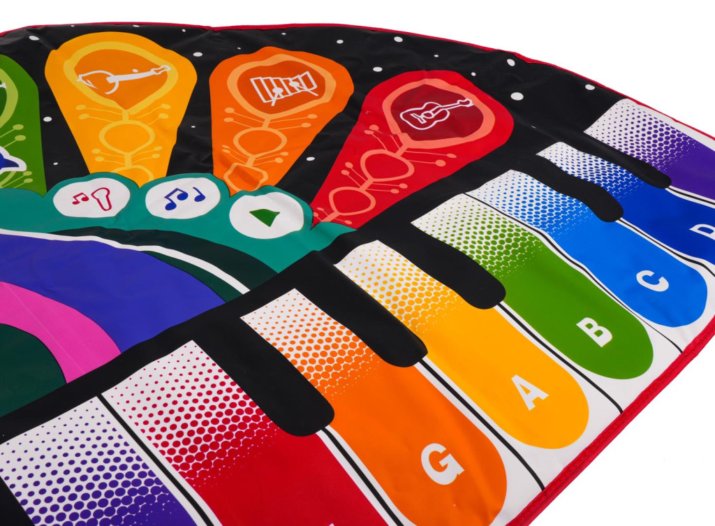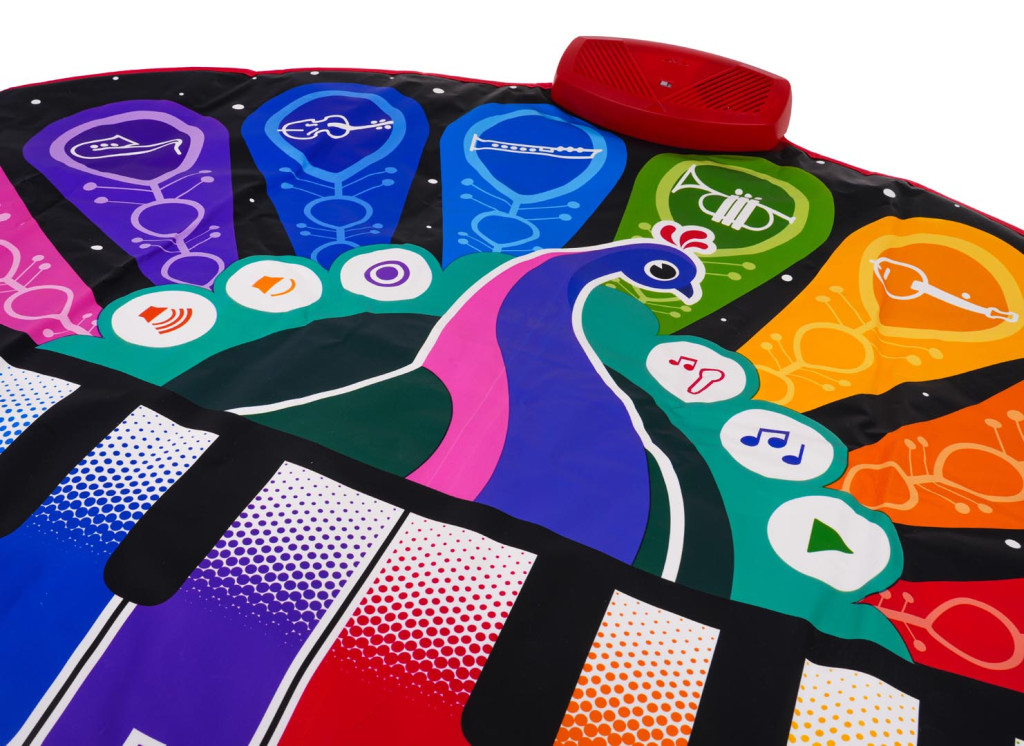 | Duża mata muzyczna w kształcie keyboardu dla dzieci od 3-go roku życia, lubiących ruch, muzykę i świetną zabawę. Mata poprzez zabawę rozwija zdolności muzyczne, koordynację ręka – oko oraz zdolności sensoryczne. Wprowadza dziecko w magiczny świat muzyki za pomocą kolorów. W dolnej części maty znajduje się keyboard dotykowy z 24 kolorowymi klawiszami. Wyżej kolorowy paw, na każdym z ośmiu piór posiada przycisk z innym instrumentem muzycznym: fortepian, wibrafon, obój, trąbka, saksofon, banjo, skrzypce i gitara. Mata posiada 4 tryby do wyboru: nagrywanie, odtwarzanie nagrania, wersja demo, odtwarzanie 10 wbudowanych melodii. Możemy również regulować jej głośność. Na samej górze maty znajduje się głośnik. Mata zasilana jest bateriami typu 3 x AA 1,5V (brak w zestawie). Mata posiada antypoślizgową konstrukcję, wykonana została z bezpiecznych materiałów. Powierzchnia maty jest miękka i trwała, brud i plamy można łatwo zetrzeć szmatką.