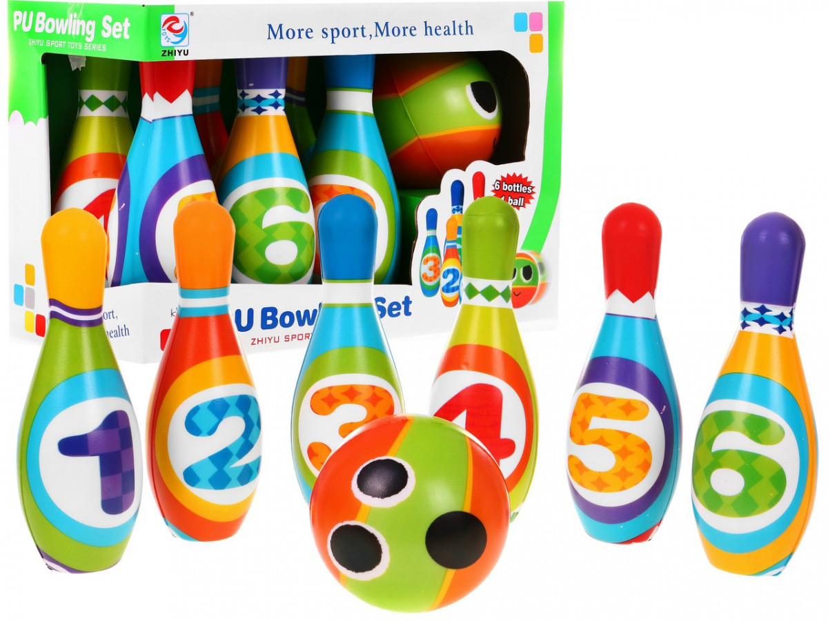 Kolorowe piankowe kręgle z piłeczka dla dzieci od 3-go roku życia. Zestaw przeznaczony jest do zabawy zarówno w domu, jak i na świeżym powietrzu.