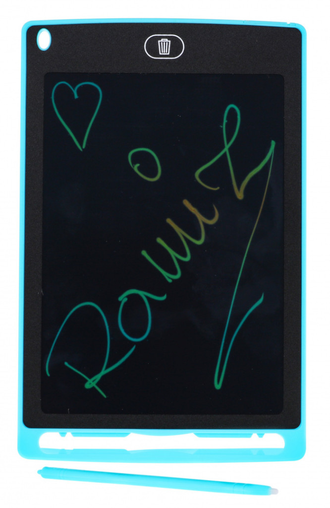 Interaktywny Tablet to gadżet przeznaczony dla dzieci od 3-go roku życia, ale z powodzeniem może być również używany przez dorosłych jako notatnik. Jest lekki i cienki, przekątna ekranu to 8,5”, można go zabrać wszędzie ze sobą, do przedszkola, szkoły, pracy. W dolnej części tabletu znajduje się uchwyt na rysik. Rysik dodatkowo posiada zaczep na sznureczek by można go było przypiąć do tabletu. W górnej przedniej części jest przycisk (kosz) za pomocą którego jednym kliknięciem możemy usunąć powstałe na tablecie dzieło. Po lewej stronie na górze umiejscowiono otwór, który umożliwia zaczepienie tabletu na smyczy. Na odwrocie tabletu u góry znajduje się suwak, którym zablokować możemy  powstałe na tablecie zapiski. Funkcja wyróżniająca nasz tablet od innych to możliwość wykonania kolorowego rysunku.