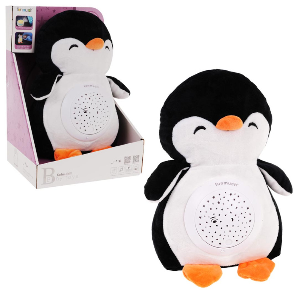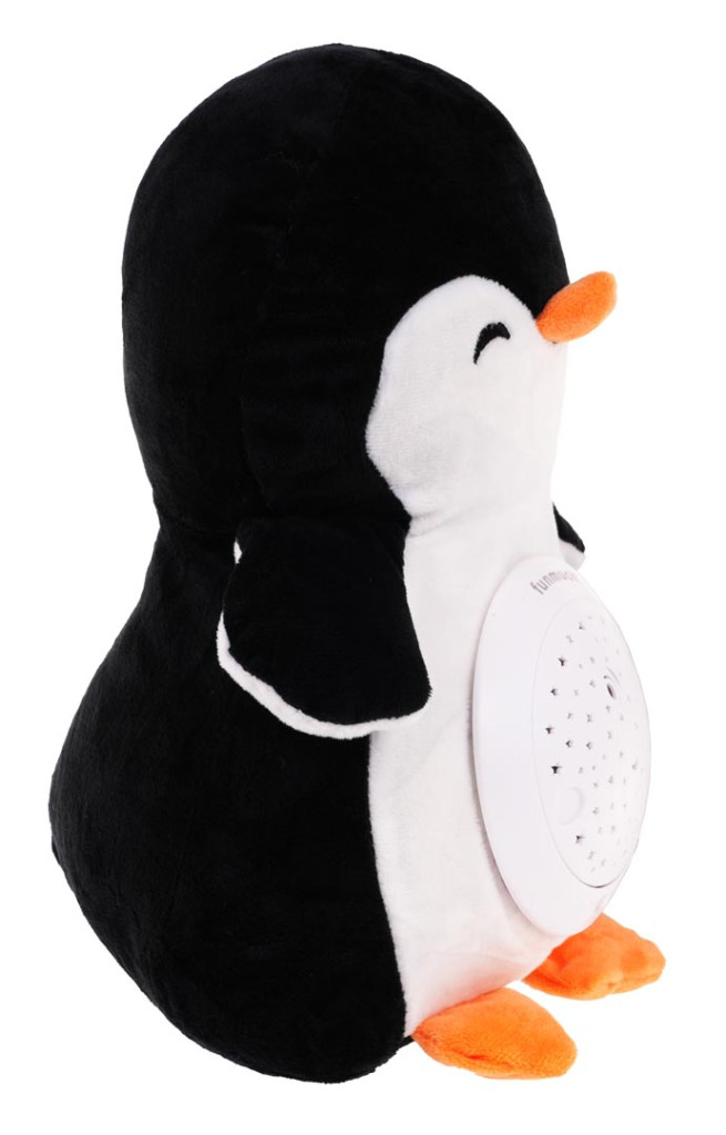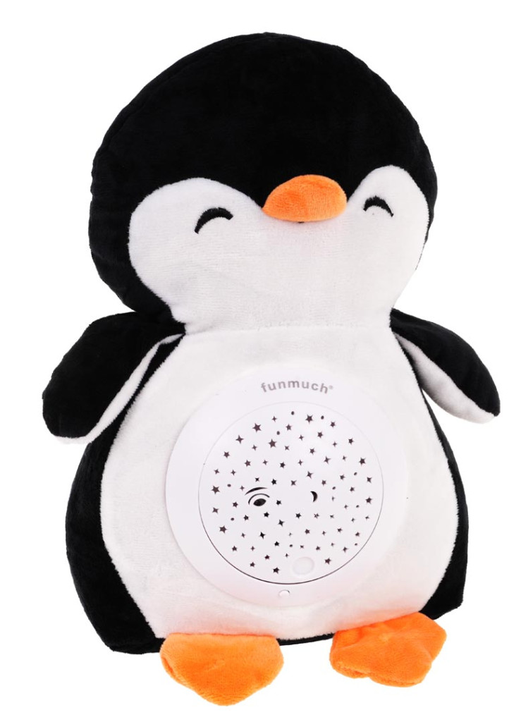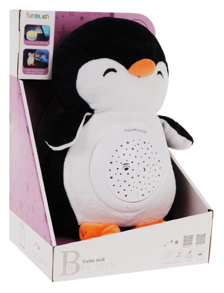 Pluszowy, duży pingwinek z wbudowanym projektorem i pozytywką, to zabawka sensoryczna dla dzieci od pierwszych dni życia. Miła w dotyku, miękka maskotka ma w brzuszku moduł, z którego wydobywają się dźwięki i efekty świetne. Moduł jest wyjmowany, a pingwinka można wyprać w pralce, dzięki czemu zawsze będzie czyściutki i pachnący. Moduł zasilany jest bateriami typu 3 x AA 1,5V (brak w zestawie).