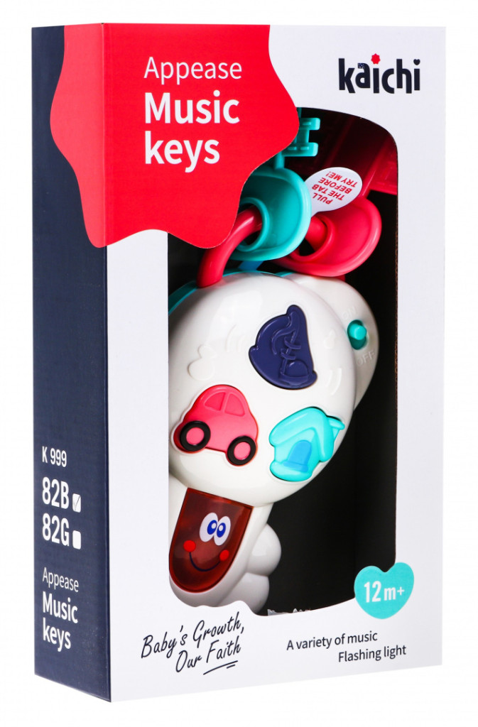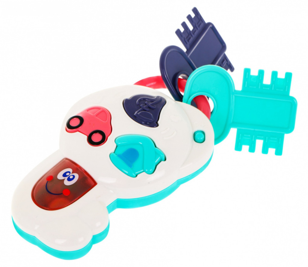 Interaktywne klucze z muzyką i migającym światłem to propozycja dla dzieci od 12 miesiąca życia. Zabawka pozytywnie wpływa na rozwój percepcji słuchowej i wzrokowej maluszka. Na kluczu znajdują się trzy przyciski muzyczne: domek, autko, nutka. Po wciśnięciu przycisku z domkiem słychać głos dzwonka, szczekanie psa, odgłos domofonu, spokojną melodię, miga światełko. Przycisk autko uruchamia odgłos otwierania i zamykania samochodu, odgłos silnika oraz wesołą melodyjkę i miganie światełka. Przycisk z nutką kryje melodie i mrugające światełko. Do kluczyka przyczepione są także 2 mniejsze, plastikowe kluczyki. Zabawka zasilana jest bateriami typu 2 x AA 1,5V, które znajdują się w zestawie.