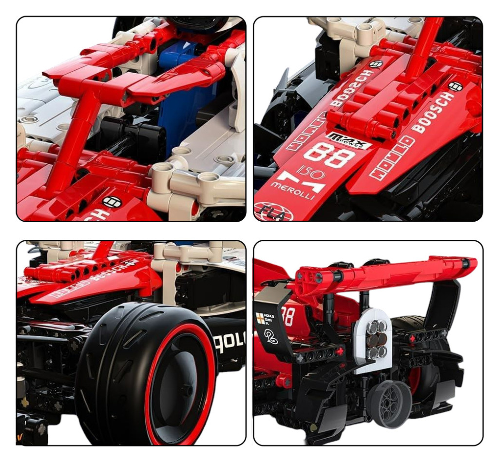 Zestaw 1185 klocków konstrukcyjnych do samodzielnej budowy czerwonego bolidu wyścigowego z funkcją zdalnego sterowania. Model wykonany w skali 1:8. Zabawka przeznaczona dla dzieci od 8-go roku życia. Klocki i elementy bolidu wykonane zostały z wysokiej jakości tworzywa sztucznego. Bolidem steruje się zdalnie za pomocą pilota RC z zestawu lub dedykowanej aplikacji mobilnej. Model posiada silnik z obracającymi się tłokami, działający układ kierowniczy oraz niezależne amortyzatory. W zestawie dołączono instrukcję obrazkową. Układanie klocków konstrukcyjnych rozwija u dzieci zdolności manualne, wyobraźnię przestrzenną i cierpliwość. Bolid zasilany jest akumulatorem 3,7V (w zestawie), pilot jest zasilany bateriami 2 x AAA 1,5V (brak w zestawie). Specyfikacja: - zestaw 1185 klocków konstrukcyjnych, - model bolidu wykonany w skali 1:8, - zdalne sterowanie we wszystkich kierunkach (przód-tył-prawo-lewo), za pomocą pilota RC lub aplikacji mobilnej, - elektryczny silnik z obracającymi się tłokami, - działający układ kierowniczy, - niezależne amortyzatory, - wierne odwzorowanie prawdziwego bolidu, - przeznaczony dla dzieci od 8-go roku życia, - instrukcja obrazkowa w zestawie. |