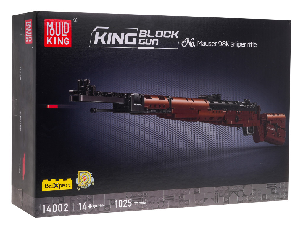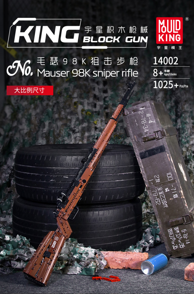 Wysokiej jakości klocki konstrukcyjne dla dzieci od czternastego roku życia. Zestaw składa się z 1025 elementów z których zbudować można karabin Mauser 98K. Karabin nie tylko wygląda jak prawdziwy, ale również strzela. W zestawie znajduje się 10 naboi i dwa magazynki. Możemy ładować albo cały magazynek, albo pojedyncze pociski.  Do karabinu dołączono pasek.