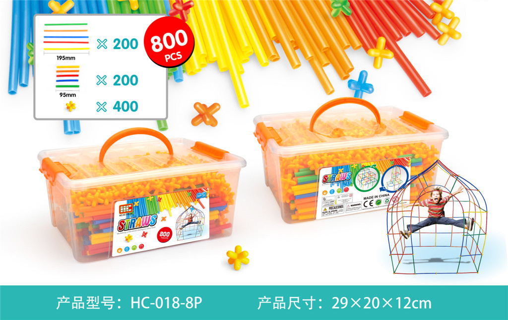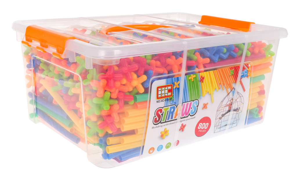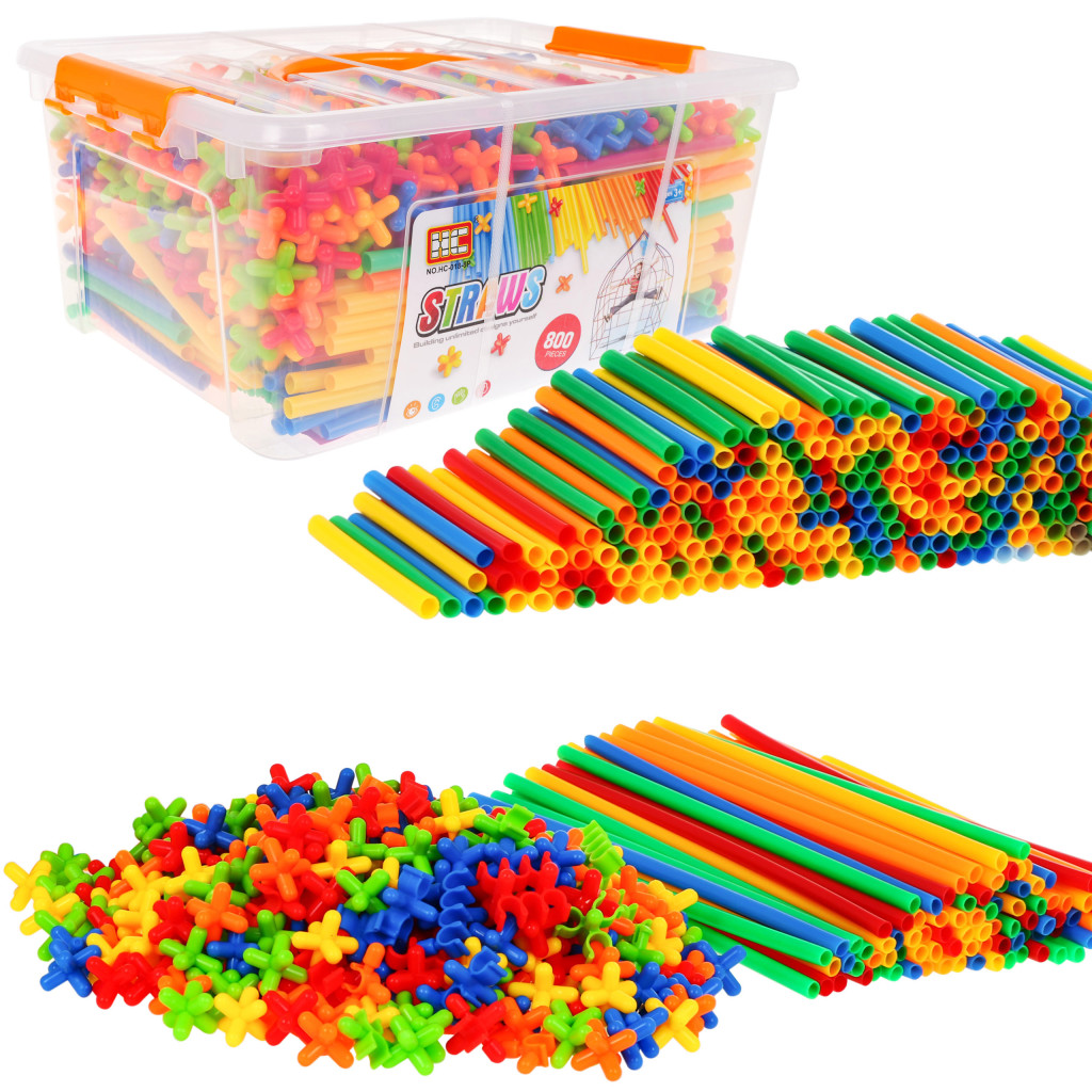 Duży zestaw klocków – słomek konstrukcyjnych to zabawka dla dzieci od 3 – go roku życia. W zestawie jest aż 800 elementów, z których Twoja pociecha może zbudować wiele wspaniałych konstrukcji takich jak: wieże, pojazdy, mosty, budynki itp. Patyczki doskonale się ze sobą łączą za pomocą łączników. Są różnokolorowe: zielone, czerwone, niebieskie, pomarańczowe i żółte. Całość zapakowana jest w plastikową skrzyneczkę z uchwytem do przenoszenia. Do zestawu dołączona jest również obrazkowa instrukcja z przykładami konstrukcji, jakie można ułożyć. Zabawa słomkami rozwinie wyobraźnię u Twojej pociechy, nauczy kreatywnego i logicznego myślenia.