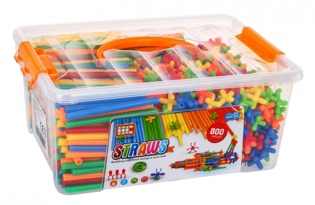 Duży zestaw klocków – słomek konstrukcyjnych to zabawka dla dzieci od 3 – go roku życia. W zestawie jest aż 800 elementów, z których Twoja pociecha może zbudować wiele wspaniałych konstrukcji takich jak: wieże, pojazdy, mosty, budynki itp. Patyczki doskonale się ze sobą łączą za pomocą łączników. Są różnokolorowe: zielone, czerwone, niebieskie, pomarańczowe i żółte. Całość zapakowana jest w plastikową skrzyneczkę z uchwytem do przenoszenia. Do zestawu dołączona jest również obrazkowa instrukcja z przykładami konstrukcji jakie można ułożyć. Zabawa słomkami rozwinie wyobraźnię u Twojej pociechy, nauczy kreatywnego i logicznego myślenia.