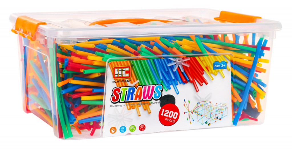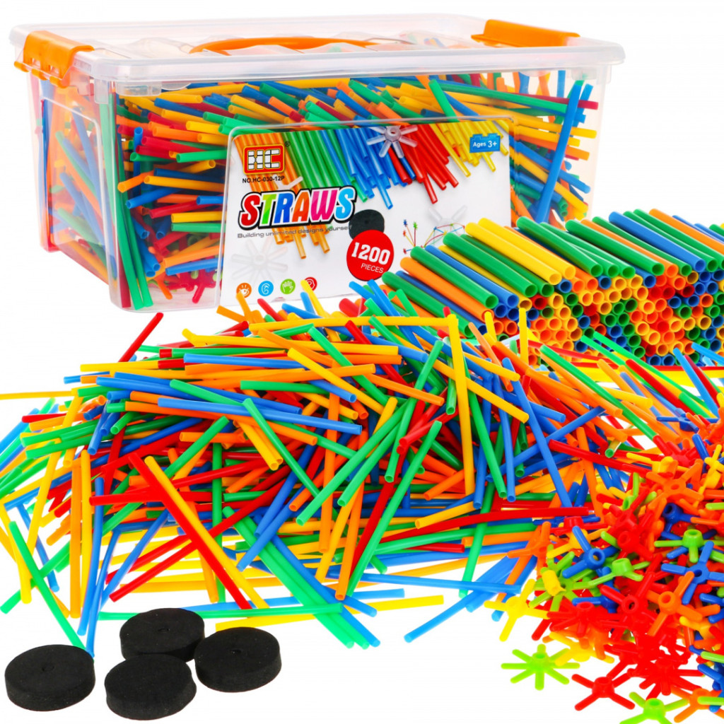 Duży zestaw klocków – słomek konstrukcyjnych to zabawka dla dzieci od 3 – go roku życia. W zestawie jest aż 1200 elementów, z których Twoja pociecha może zbudować wiele wspaniałych konstrukcji takich jak: wieże, pojazdy, mosty, budynki itp. Patyczki doskonale się ze sobą łączą za pomocą łączników. Są różnokolorowe: zielone, czerwone, niebieskie, pomarańczowe i żółte. Całość zapakowana jest w plastikową skrzyneczkę z uchwytem do przenoszenia. Zabawa słomkami rozwinie wyobraźnię u Twojej pociechy, nauczy kreatywnego i logicznego myślenia.
