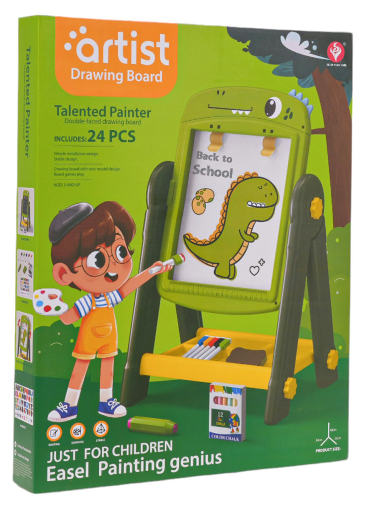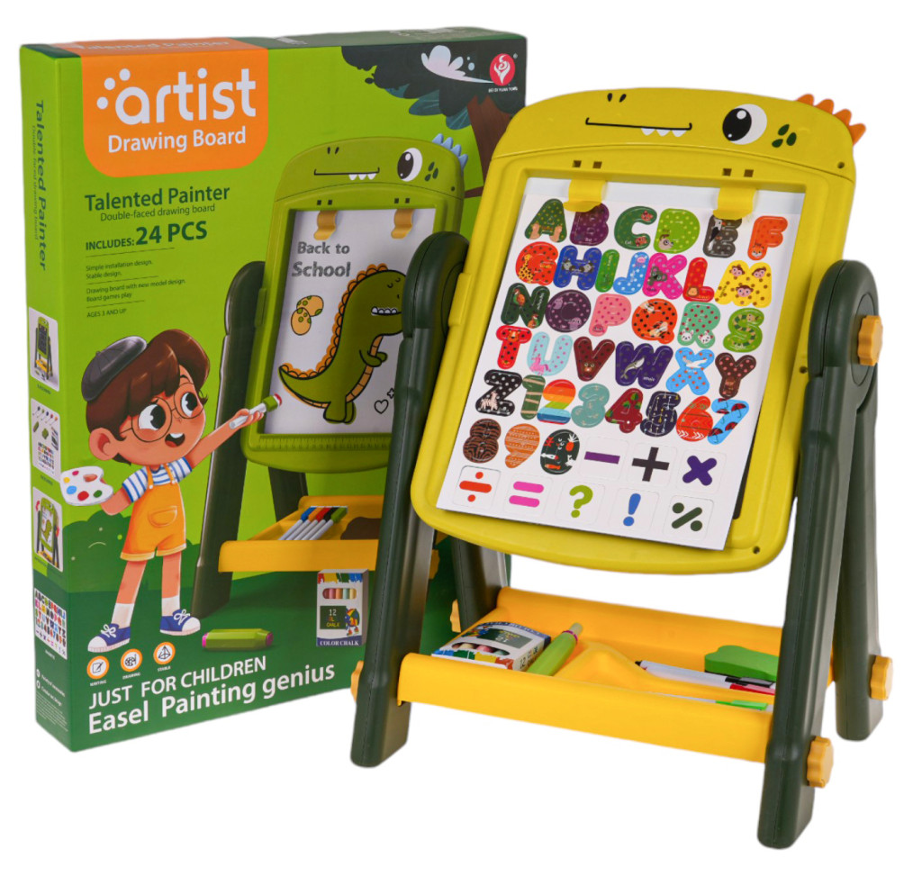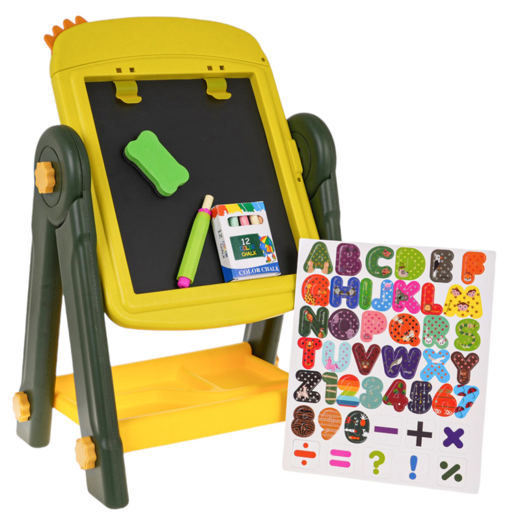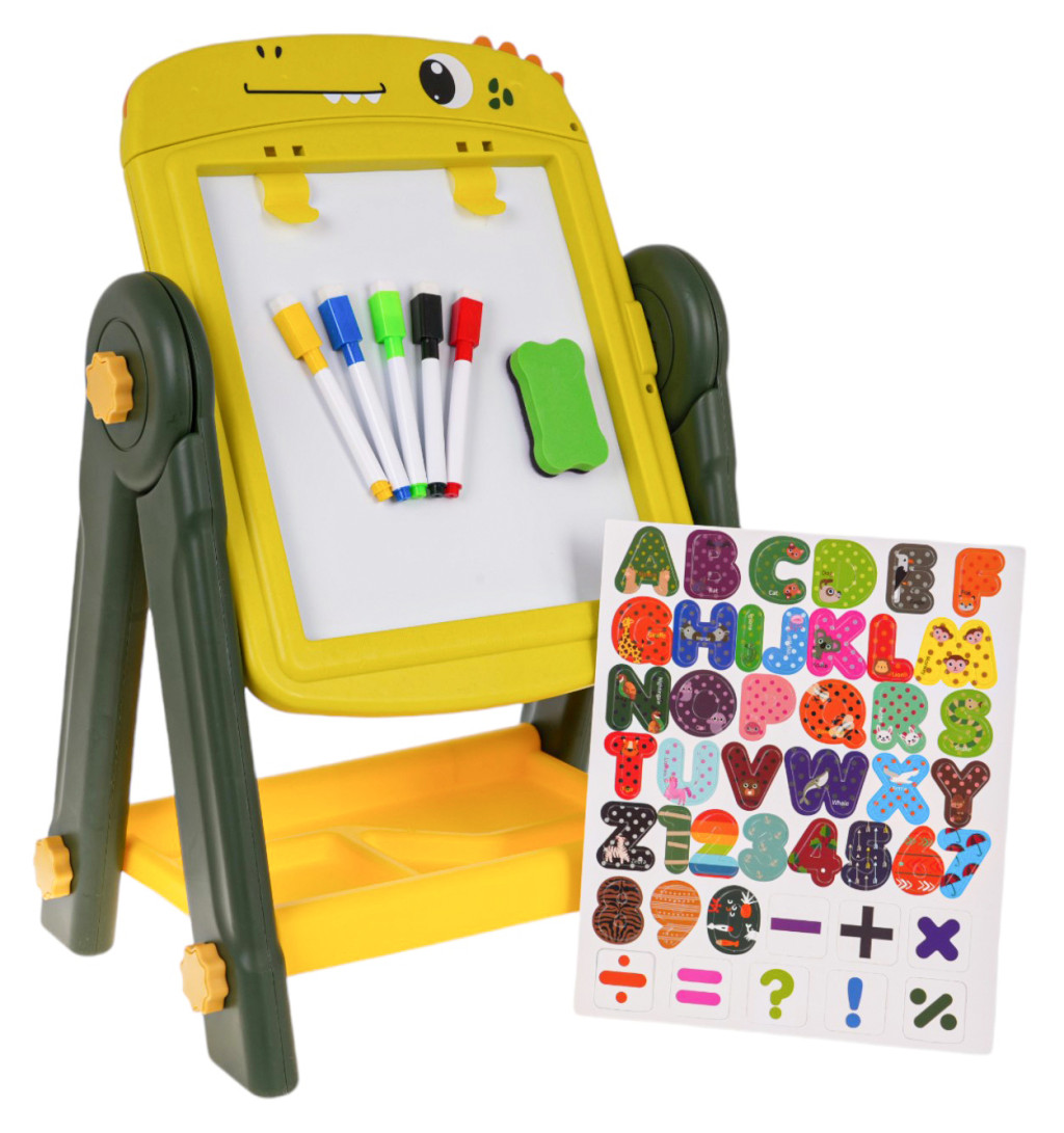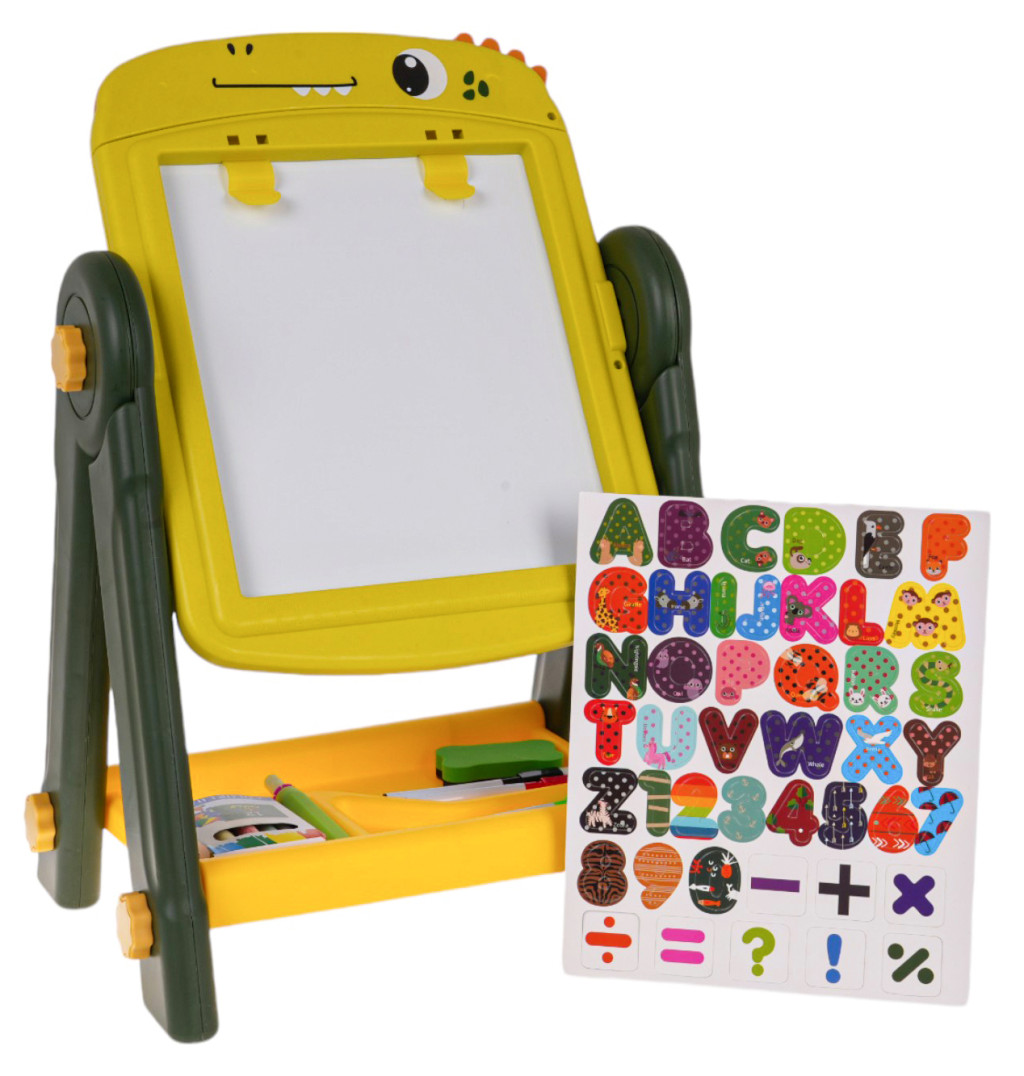 Dwustronna tablica na stojaku z akcesoriami dla dzieci od 3-go roku życia. Konstrukcja stojaka jest stabilna i łatwa w montażu. Tablice z obydwóch stron są magnetyczne, można przyczepiać do nich magnesy z zestawu. Po czarnej stronie rysuje się kredą, a po białej flamastrami. W zestawie znajduje się uchwyt na kredę, kreda, flamastry i magnesy z literkami, cyferkami i działaniami matematycznymi. Pod tablicą umiejscowiono praktyczną półeczkę na akcesoria dostępne w zestawie. Po białej stronie, w górze przyczepione są dwa klipsy, do których przymocować możemy kartkę papieru. Zestaw rozwija zdolności manualne, ćwiczy rękę. Funkcje zestawu: - odpowiednia dla dzieci powyżej 3-go roku życia, - znakomicie wykonana z najlepszej jakości materiałów, - stabilna konstrukcja zapobiega wywróceniu, - 2 w 1 tablica biała do pisania flamastrami i kredowa, - łatwy sposób zmiany strony tablicy, obrót o 360 stopni, - klipsy na zaczepienie papieru, - liczne akcesoria dołączone do zestawu, - pojemna półeczka na akcesoria, - łatwy montaż i demontaż, - praktyczny uchwyt na kredę, zapobiegający brudzenie rączek, - rozwija zdolności manualne. |