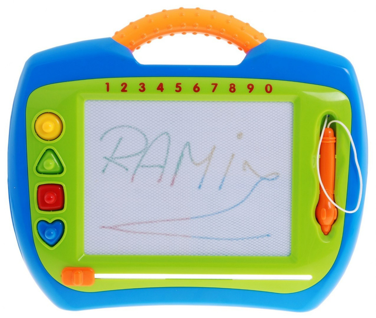 Znikopis został wykonany z wysokiej jakości plastiku, wyposażono go w wygodną rączkę do przenoszenia oraz rysik zamocowany na praktycznym sznureczku.