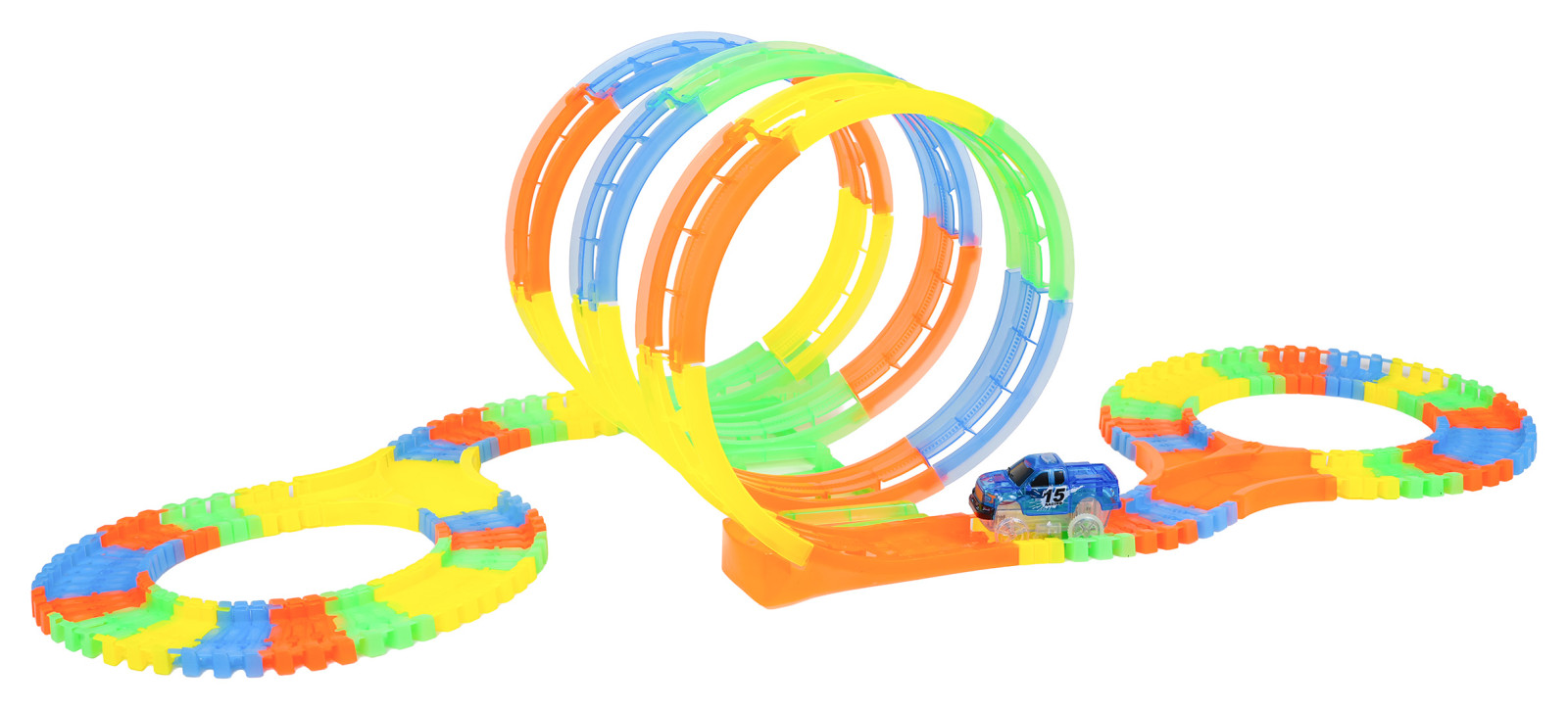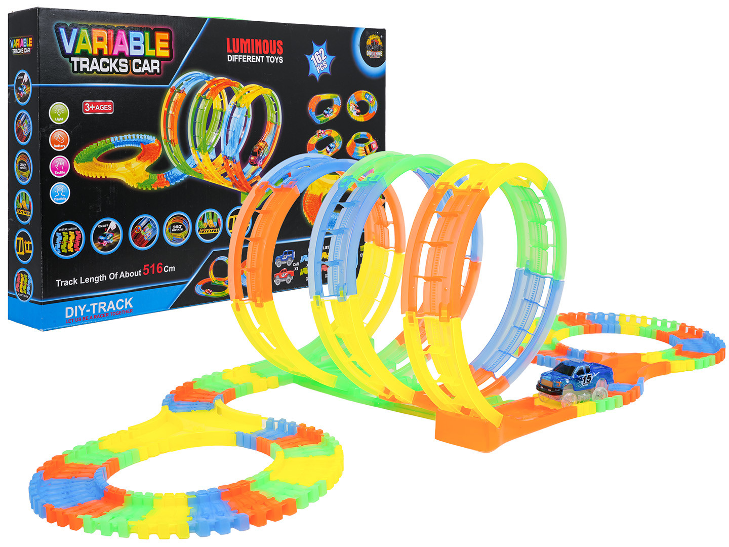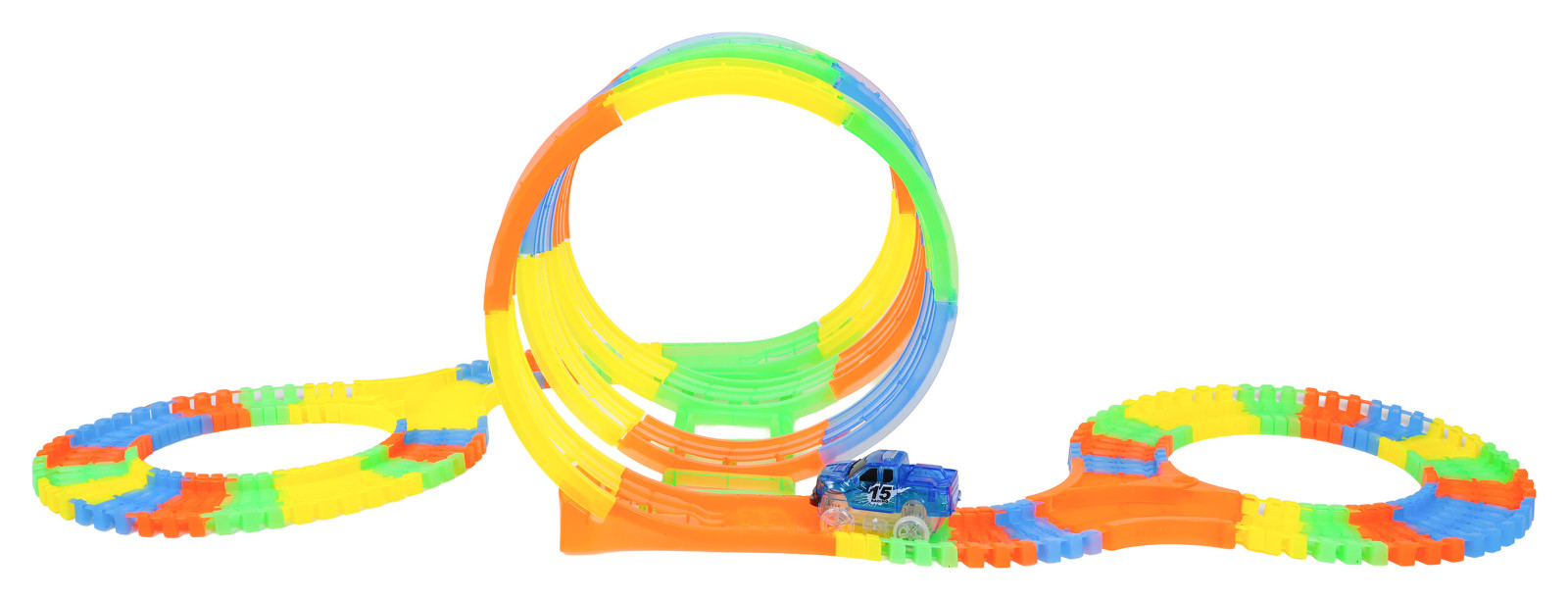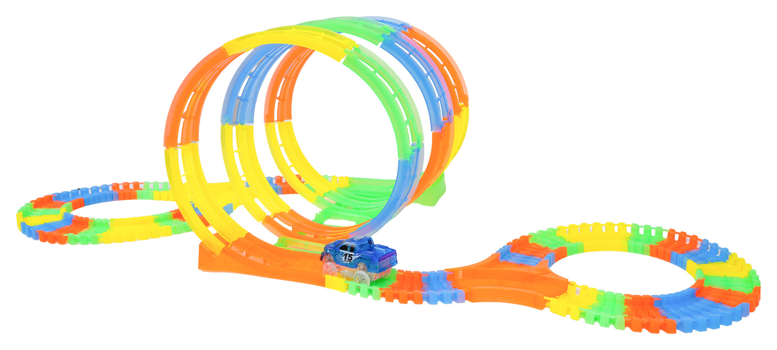 | Tor wyścigowy świecący w ciemności z pętlami i autkiem w zestawie to propozycja dla dzieci już od trzeciego roku życia. Tory są elastyczne, można je układać w dowolne kombinacje, obracać, podnosić, przekładać i to podczas jazdy autka. Dodatkowo tory są fluorescencyjne, świecą w ciemności. Pojazd dołączony do zestawu, posiada podświetlenie LED, jeżdżąc w ciemności, tworzy niesamowity efekt. Pojazd zasilany jest bateriami 2 x AA 1,5V (brak w zestawie). Aby uruchomić autko, wystarczy nacisnąć na jego dachu przycisk.