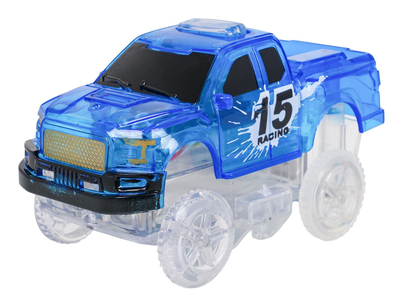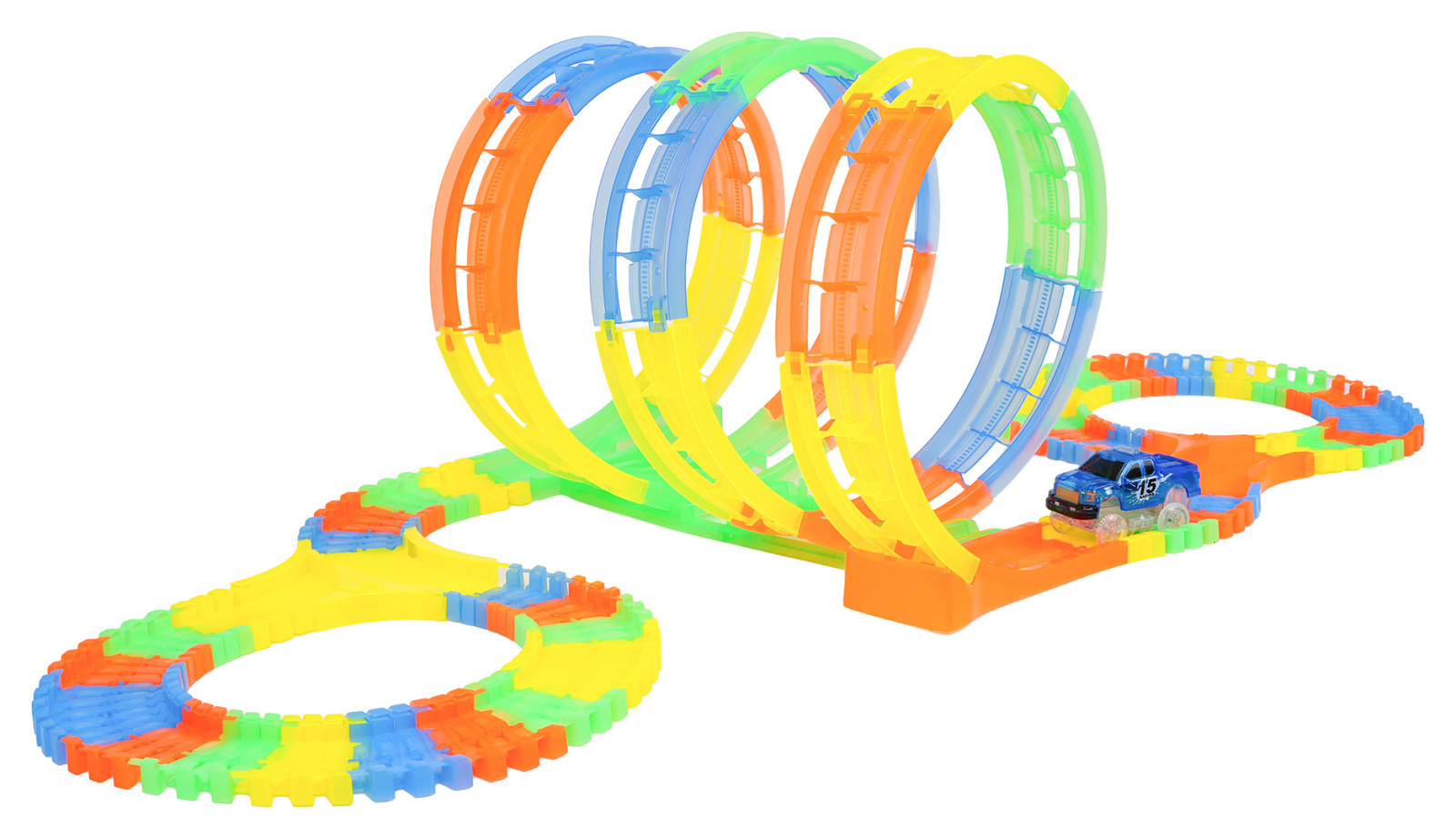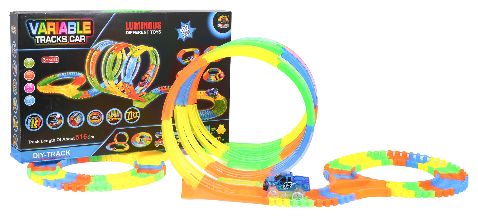 | Tor wyścigowy świecący w ciemności z pętlami i autkiem w zestawie to propozycja dla dzieci już od trzeciego roku życia. Tory są elastyczne, można je układać w dowolne kombinacje, obracać, podnosić, przekładać i to podczas jazdy autka. Dodatkowo tory są fluorescencyjne, świecą w ciemności. Pojazd dołączony do zestawu, posiada podświetlenie LED, jeżdżąc w ciemności, tworzy niesamowity efekt. Pojazd zasilany jest bateriami 2 x AA 1,5V (brak w zestawie). Aby uruchomić autko, wystarczy nacisnąć na jego dachu przycisk.
