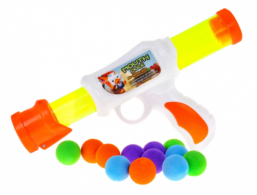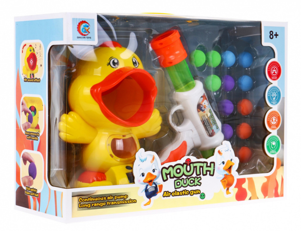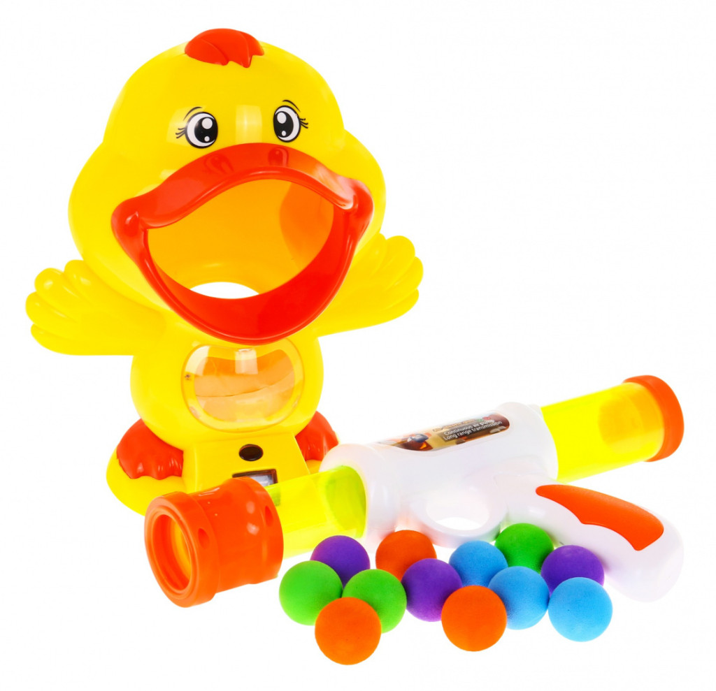 Niesamowity zestaw pistolet na miękkie kulki  z kaczką jako celem to propozycja dla dzieci od 8-go roku życia. Pistolet nie wymaga użycia baterii, zasilany jest powietrzem, wystarczy umieścić piłki w lufie, napiąć sprężynę przez pociągnięcie lufy pistoletu do przodu a następnie do tyłu. Pociski są lekkie i miękkie a przez to bezpieczne. Jeśli uda się uderzyć w język kaczki, zabawka wyda charakterystyczny dźwięk. Na ekranie LCD zliczane są trafione cele. Kaczka zasilana jest bateriami typu 3 x AAA 1,5V. Poprzez zabawę dziecko uczy się skupiać na celu, ćwiczy koncentrację i koordynację ręka-oko.
