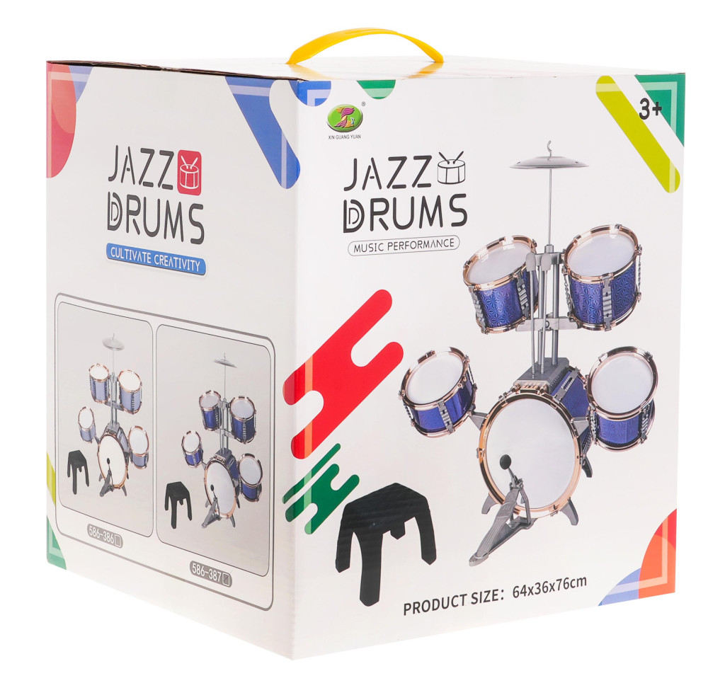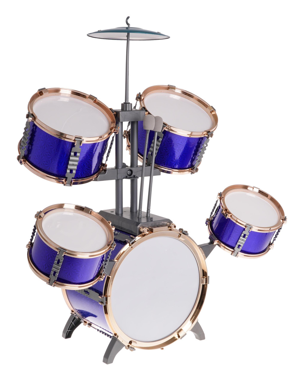 Duża, niebieska perkusja z krzesełkiem w zestawie to zabawkowy instrument dla dzieci od 3 – go roku życia. Zestaw zawiera 5 bębnów, talerz metalowy, 2 pałki oraz krzesełko.