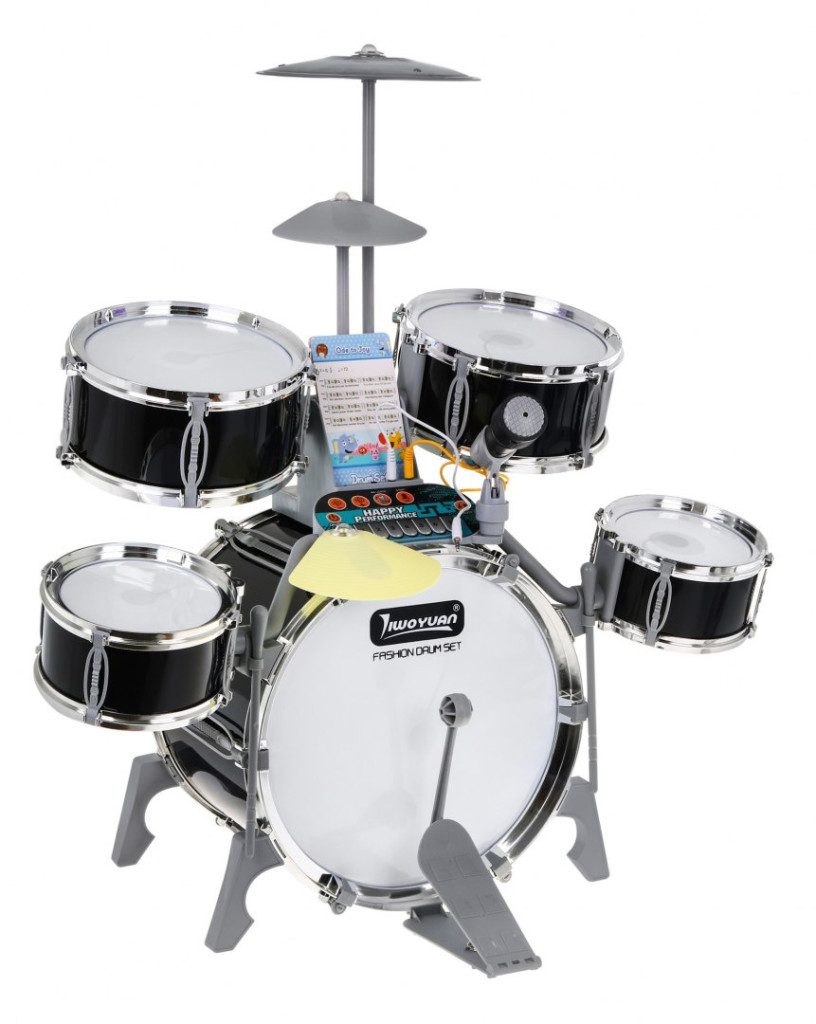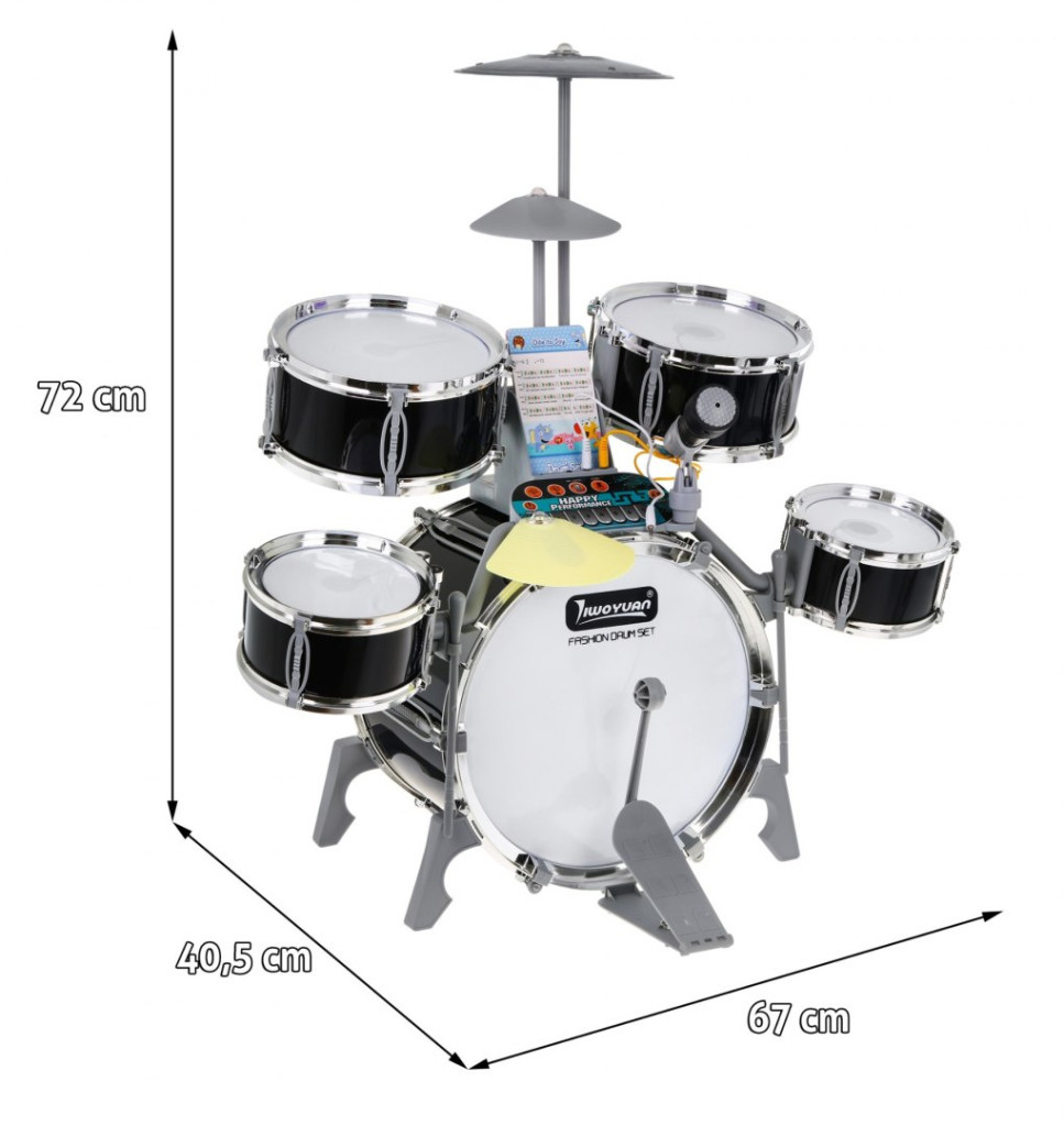 Multifunkcyjna duża perkusja z profesjonalnym dźwiękiem i podświetlanymi bębnami to zabawka dla dzieci od 3 – go roku życia. Perkusja posiada 5 bębnów, 2 talerze elektroniczne (plastikowe) i jeden metalowy, panel sterujący, mikrofon, 2 pałki oraz 6 kart z nutami do nauki gry. W zestawie znajduje się również wygodny stołeczek. Ta rewelacyjna perkusja zasilana jest bateriami typu 3 x AA, ale może być również ładowana przez USB.